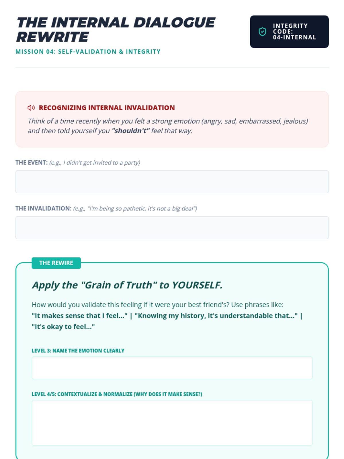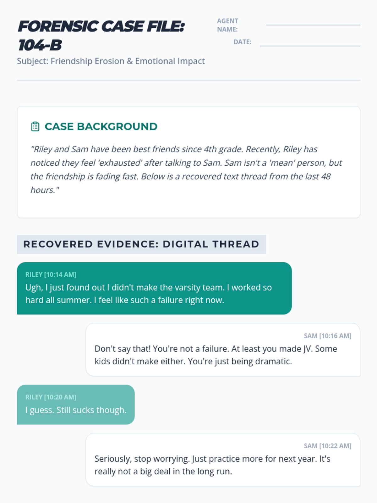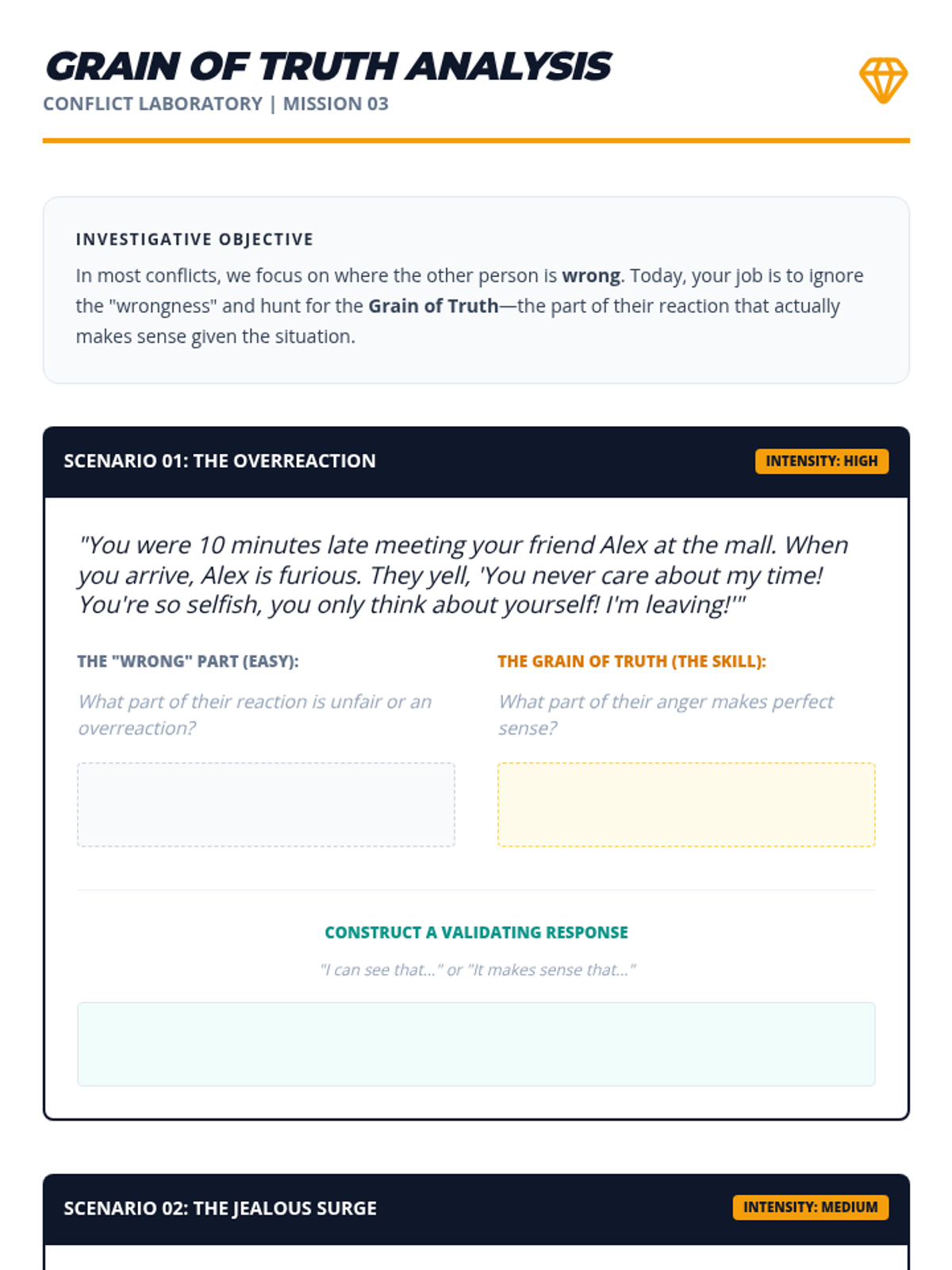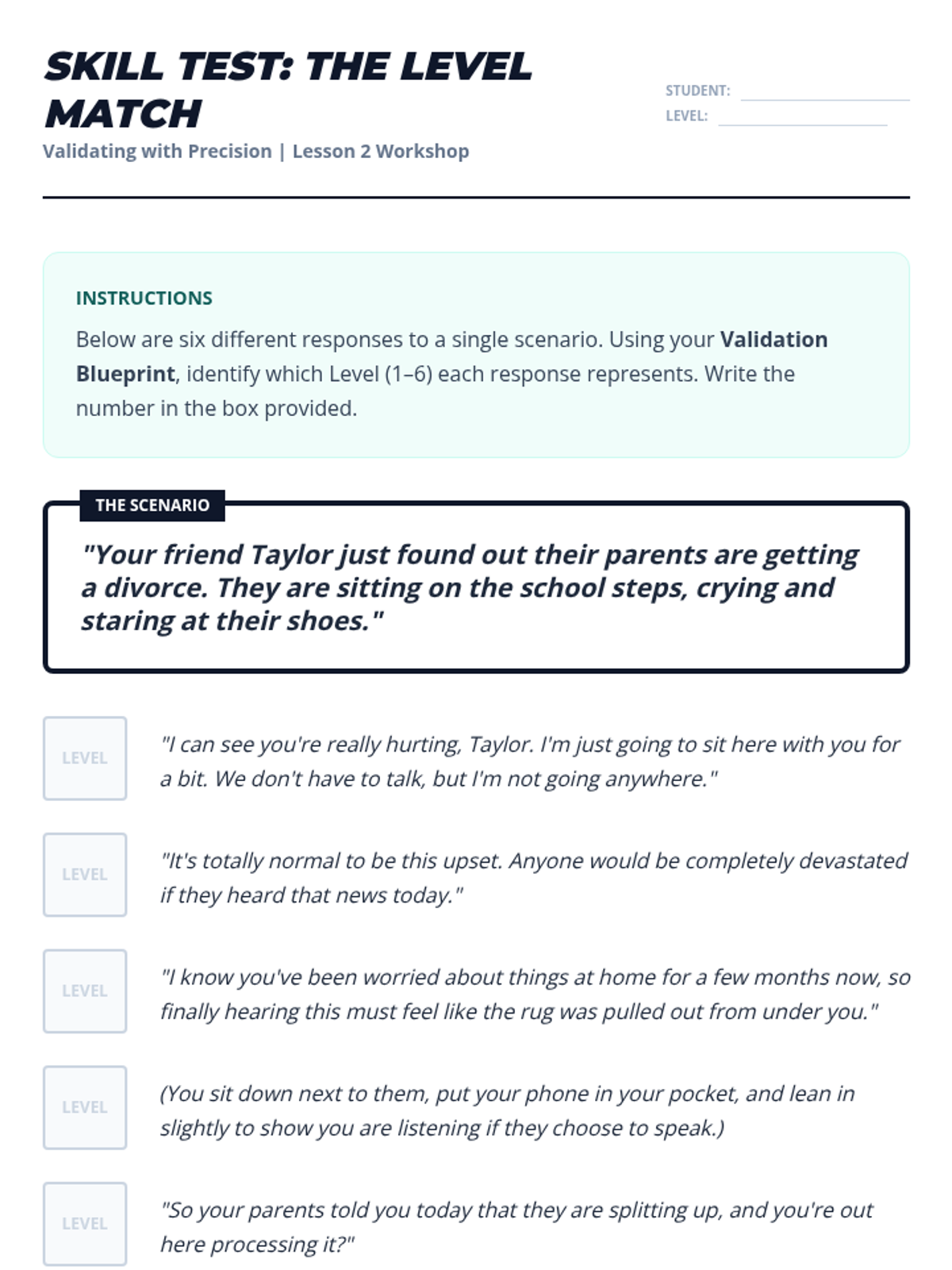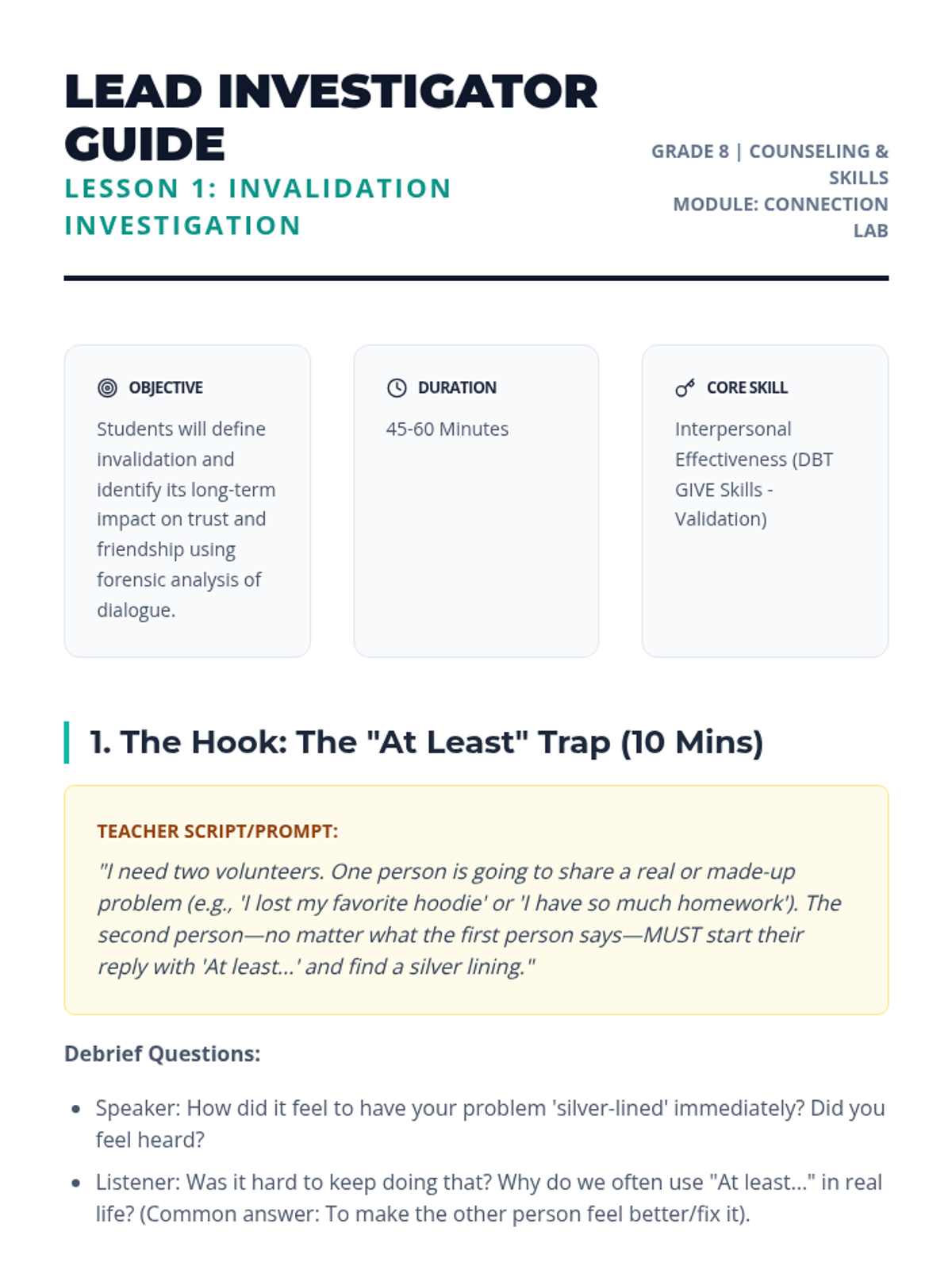 This 8th-grade sequence dives deep into the 'V' (Validation) of the GIVE skills. Students explore levels of validation, identify the damage of invalidation, find the 'grain of truth' in conflicts, and practice self-validation to improve relationship health and emotional regulation.