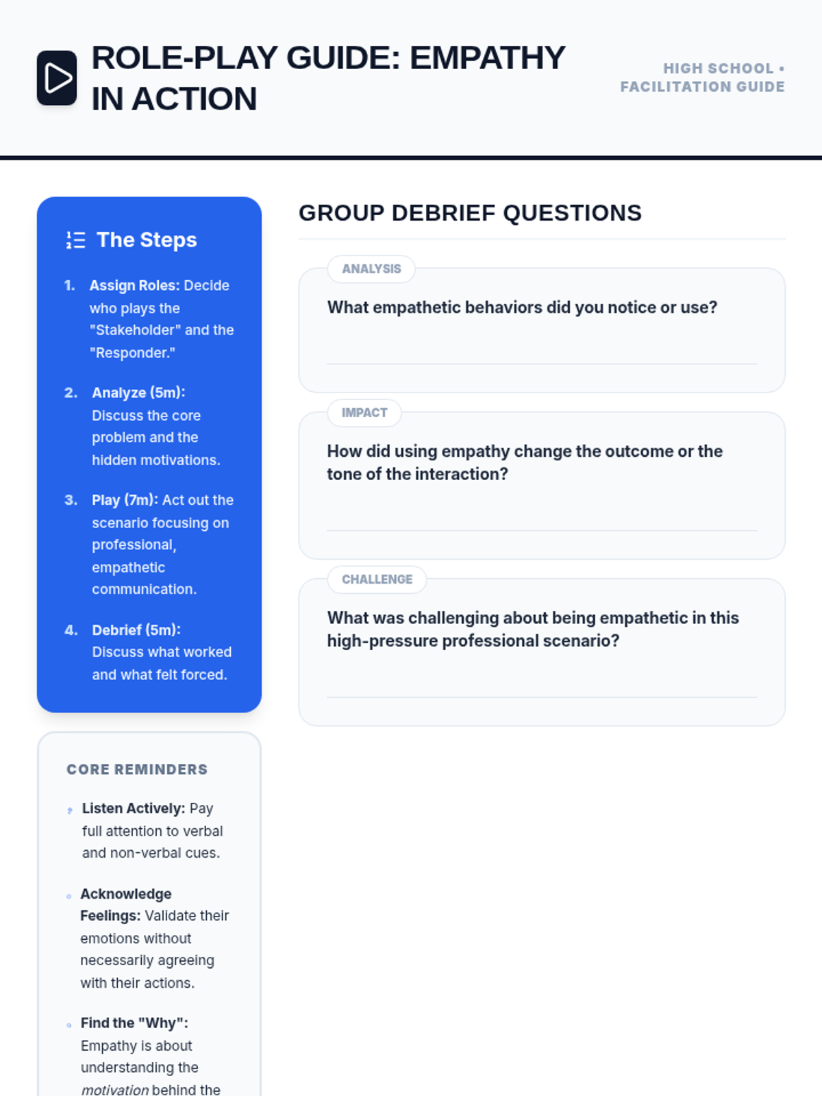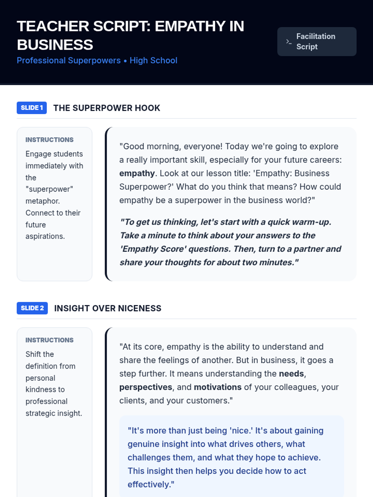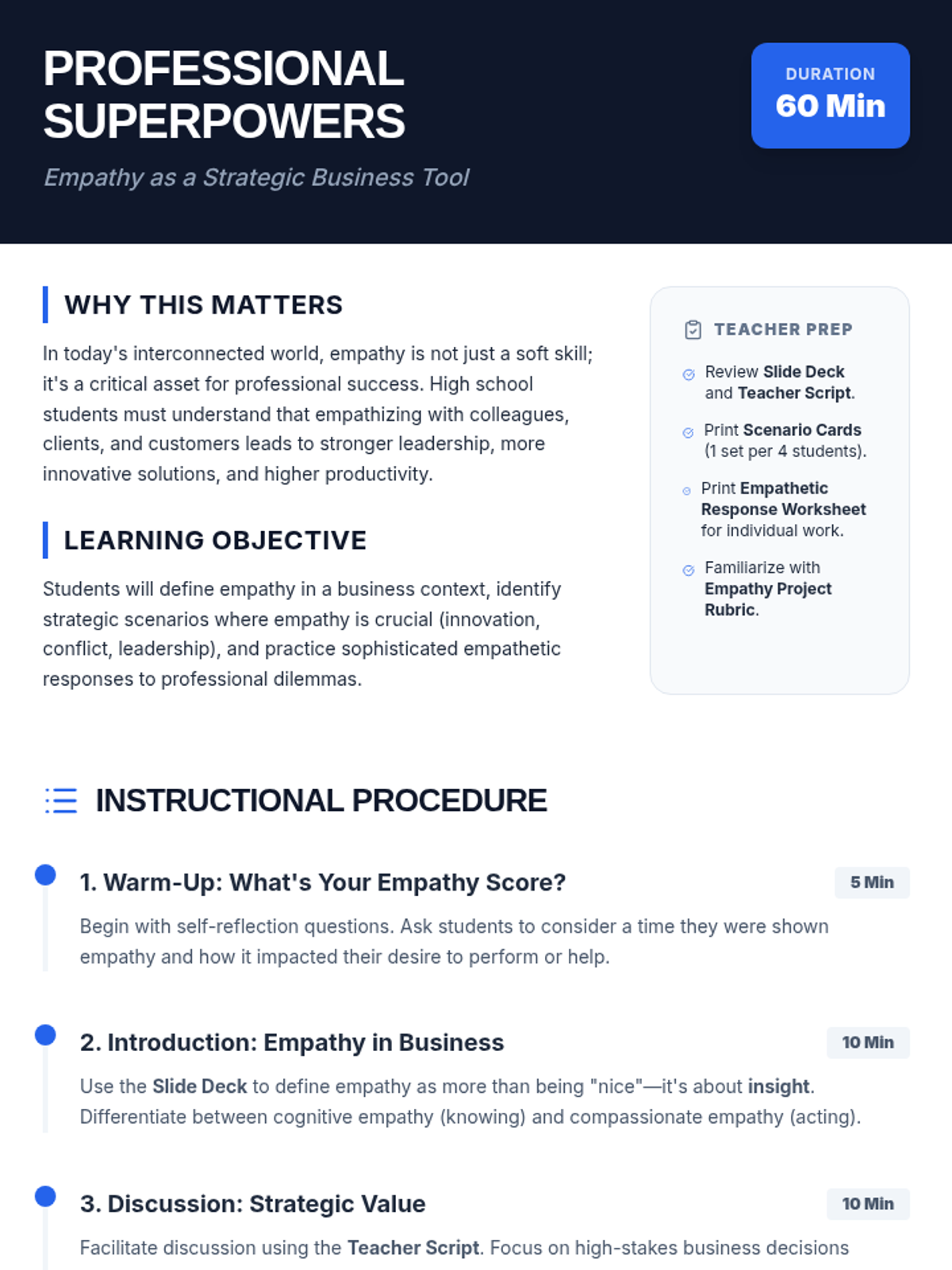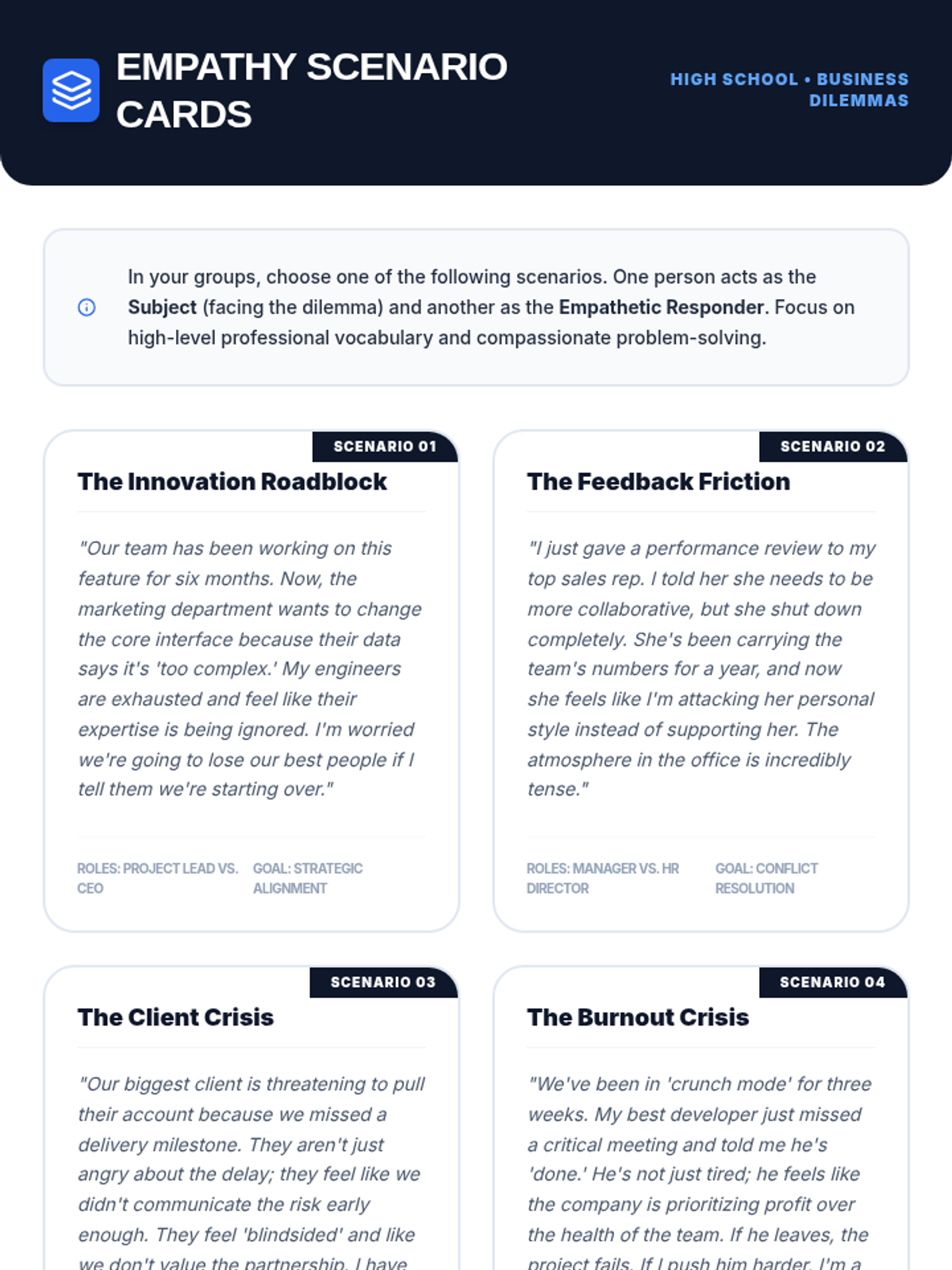 A comprehensive multi-level curriculum designed to build empathy skills from elementary to high school. Students learn to identify personal emotions, take perspectives in social situations, and apply empathetic communication as a professional superpower in business contexts.