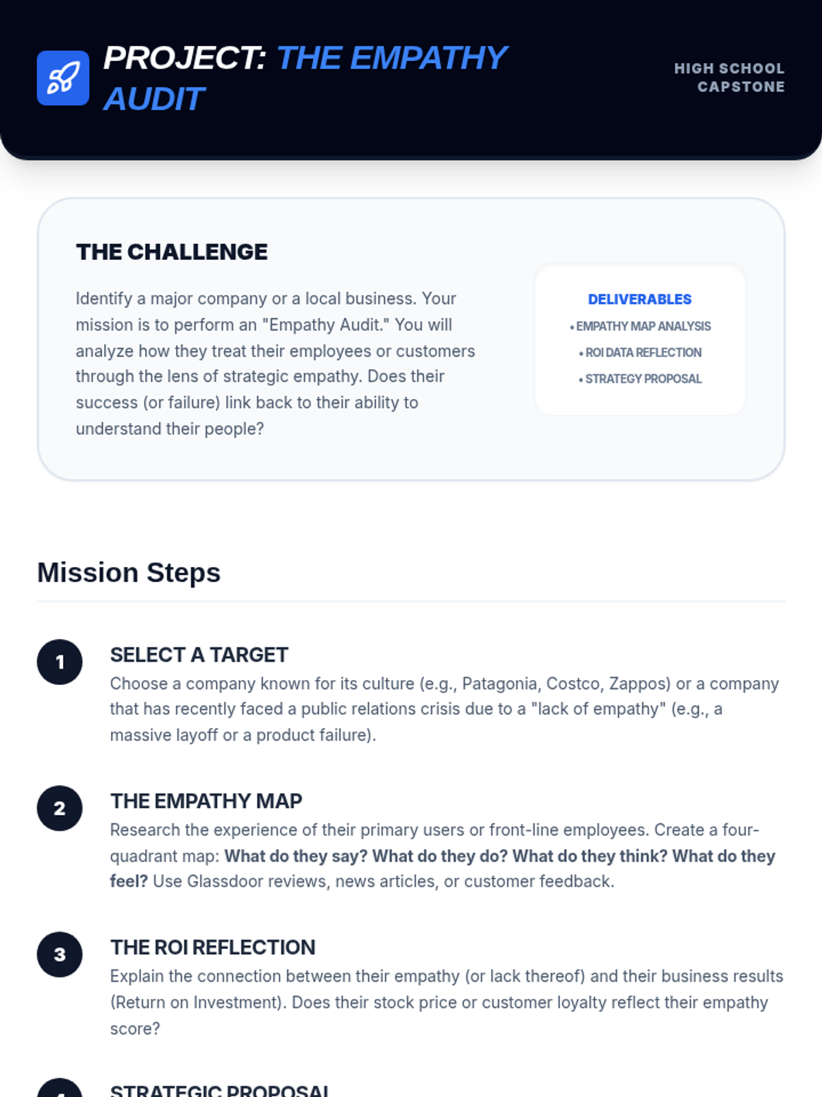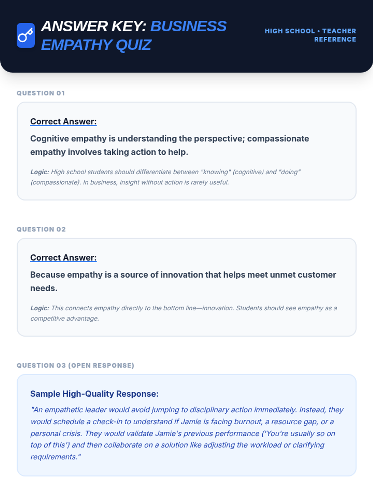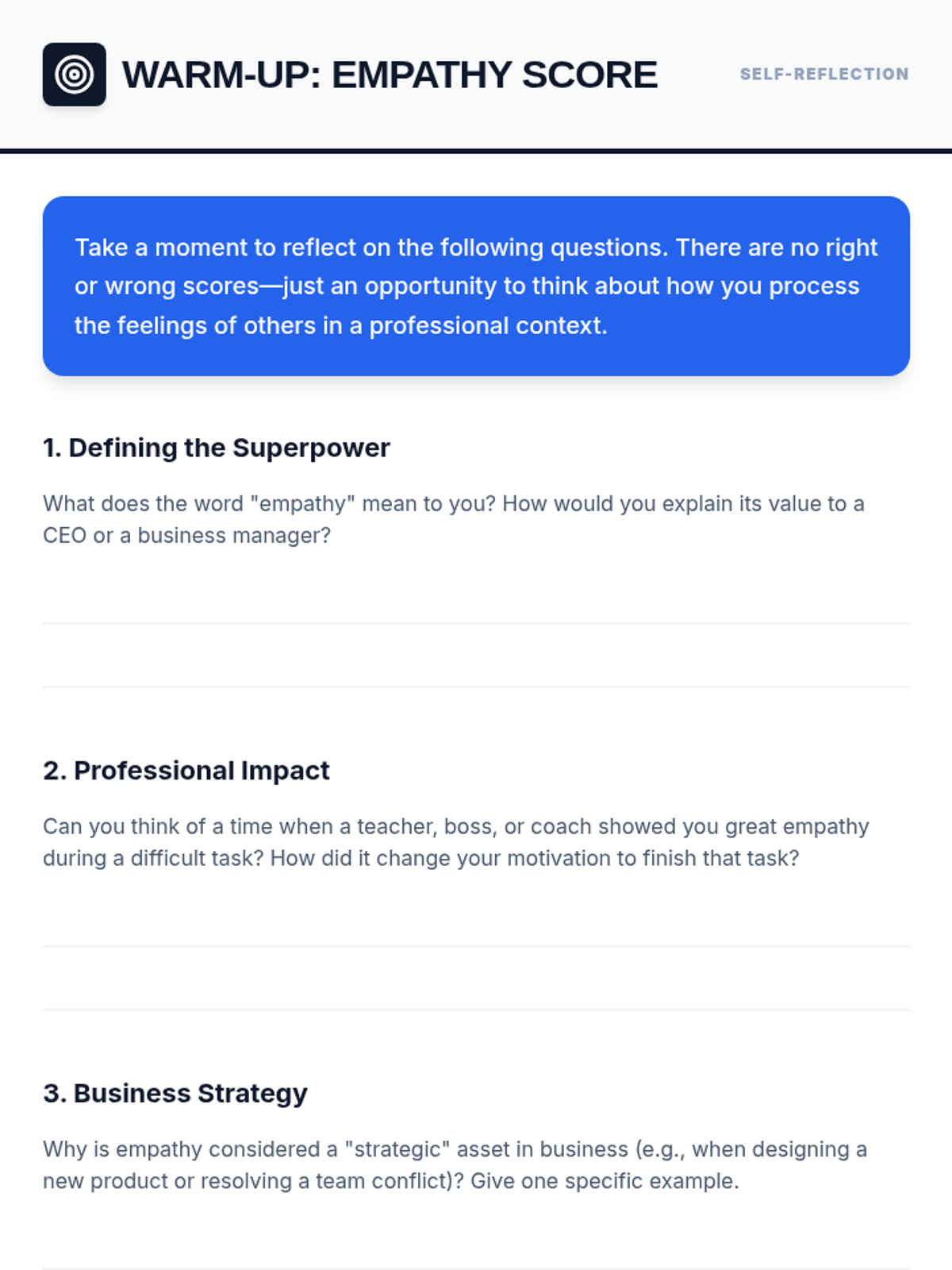 A comprehensive multi-level curriculum designed to build empathy skills from elementary to high school. Students learn to identify personal emotions, take perspectives in social situations, and apply empathetic communication as a professional superpower in business contexts.