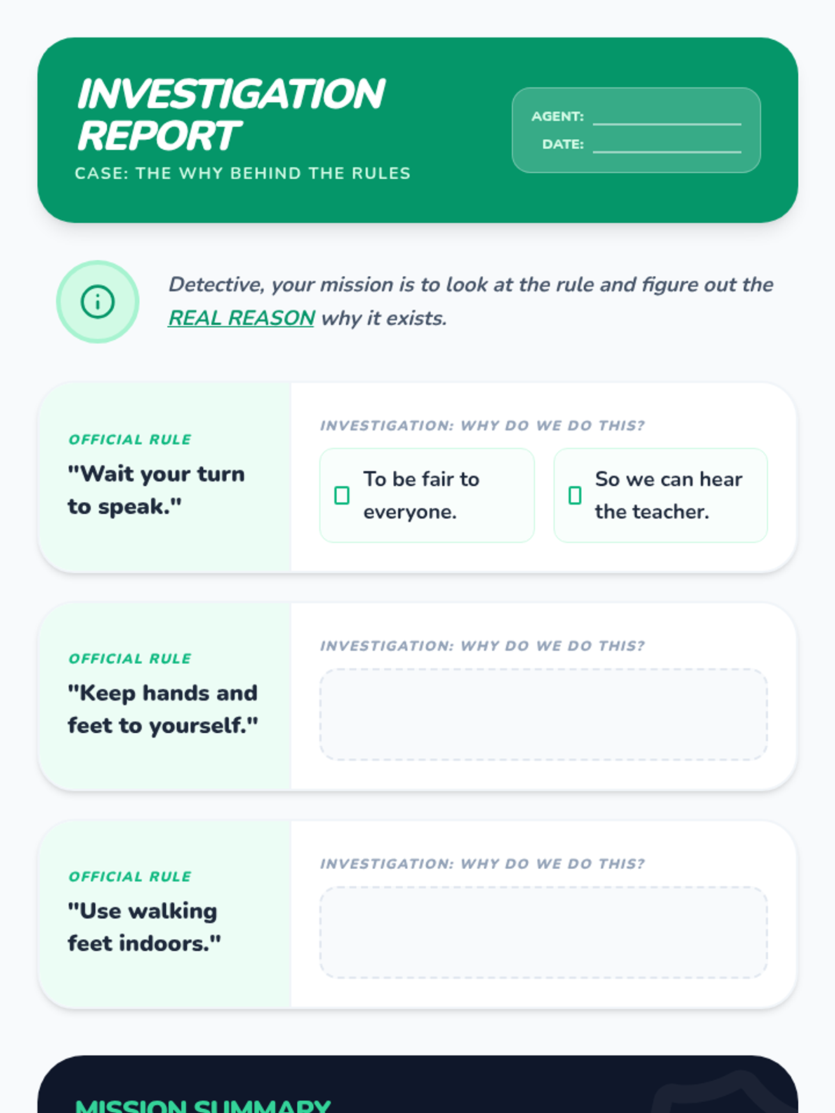 An 8-week executive functioning program for 2nd graders focused on controlling blurting using the 'Inside Thought vs. Outside Thought' framework, themed as a Secret Agent training academy.