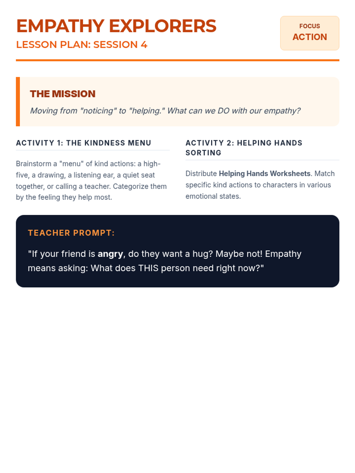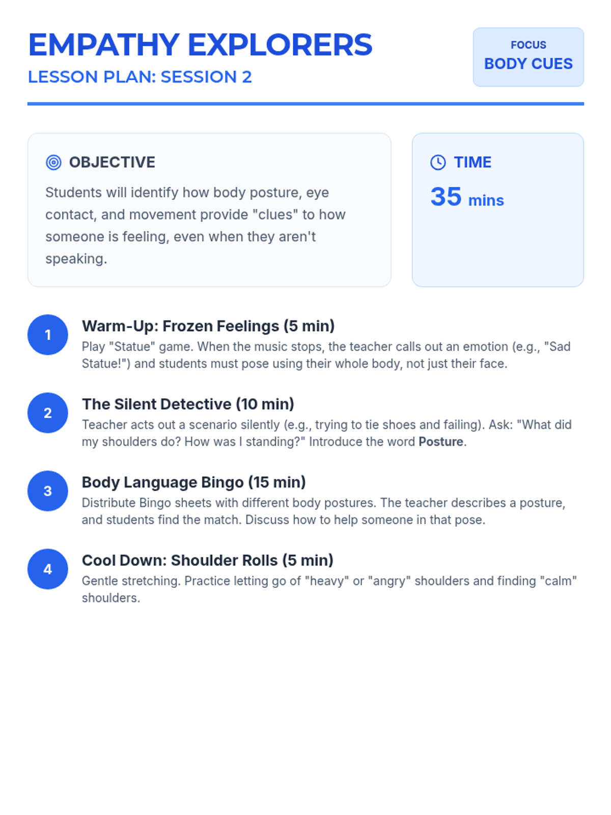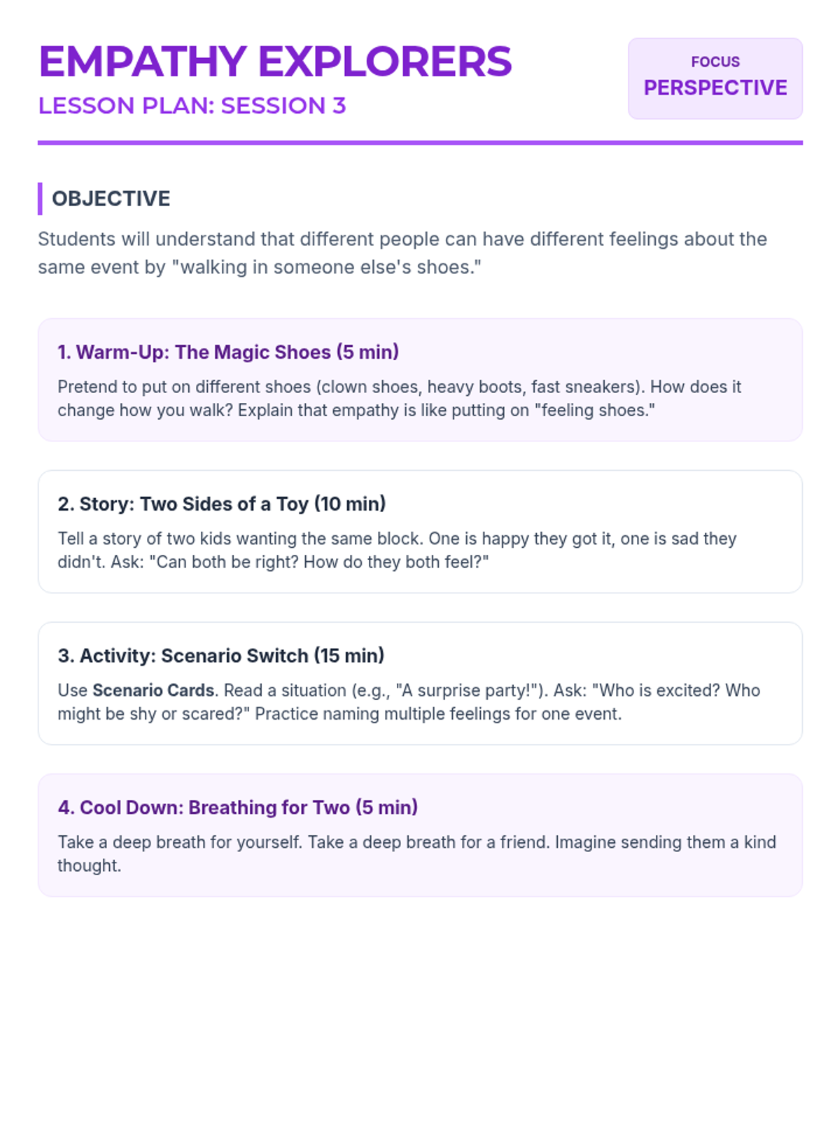 A 6-session social-emotional learning unit for 1st graders focused on recognizing emotions, understanding perspectives, and practicing kindness through interactive play and storytelling.
