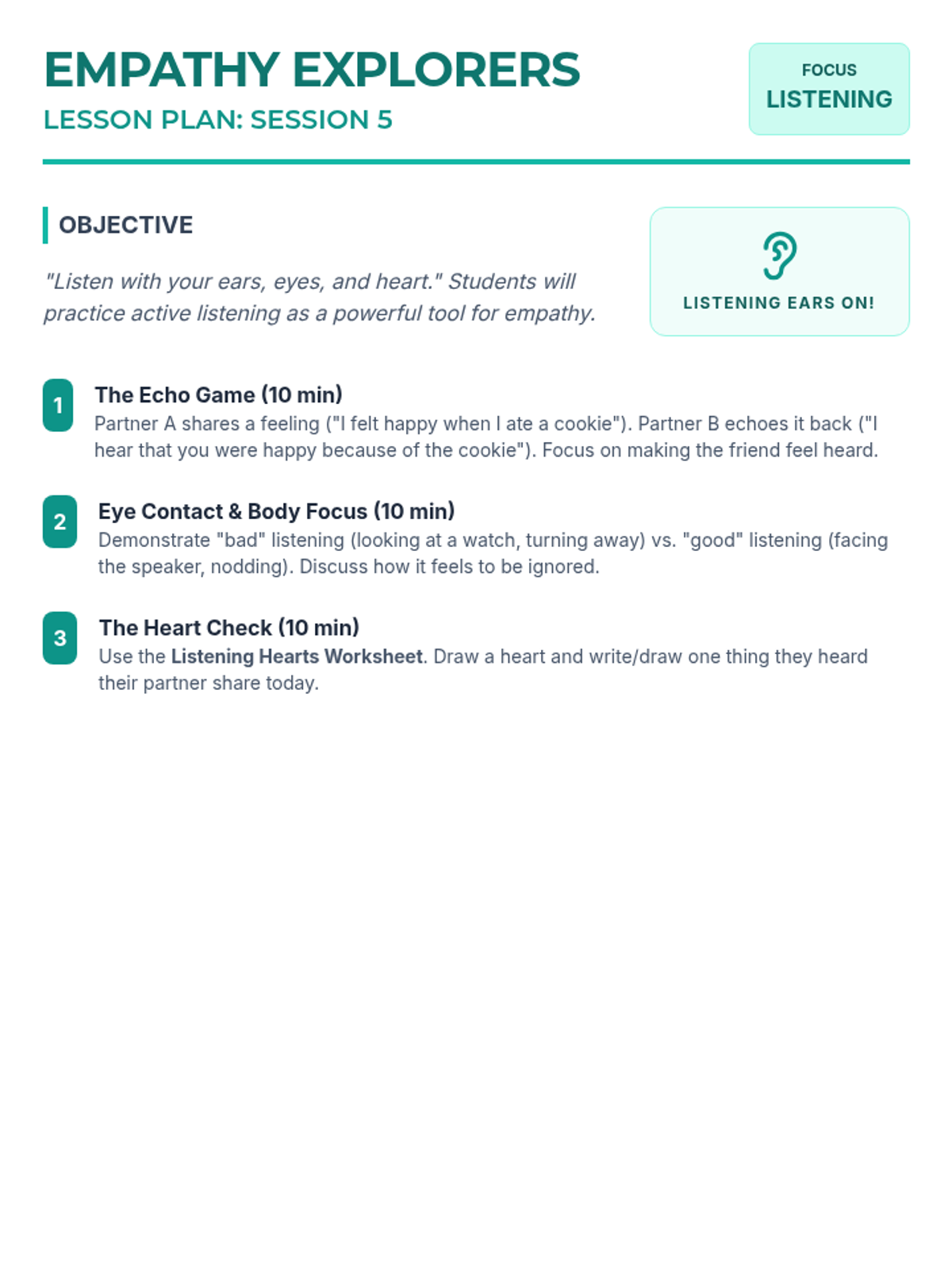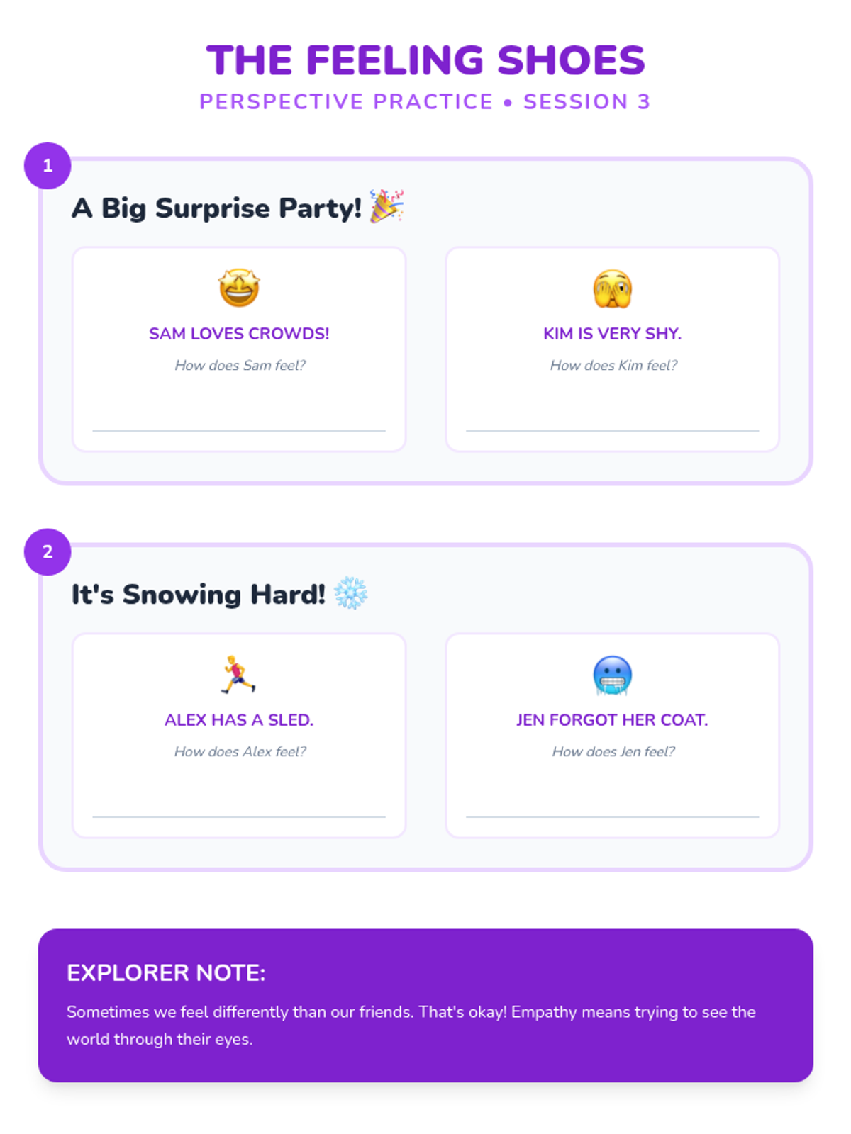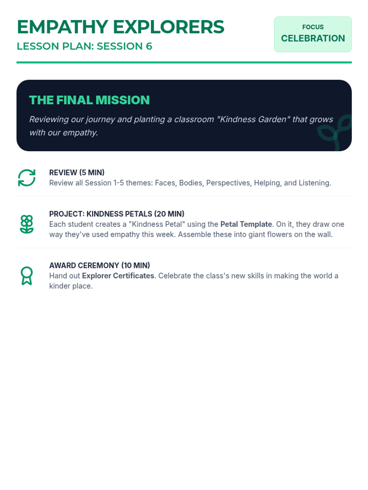 A 6-session social-emotional learning unit for 1st graders focused on recognizing emotions, understanding perspectives, and practicing kindness through interactive play and storytelling.