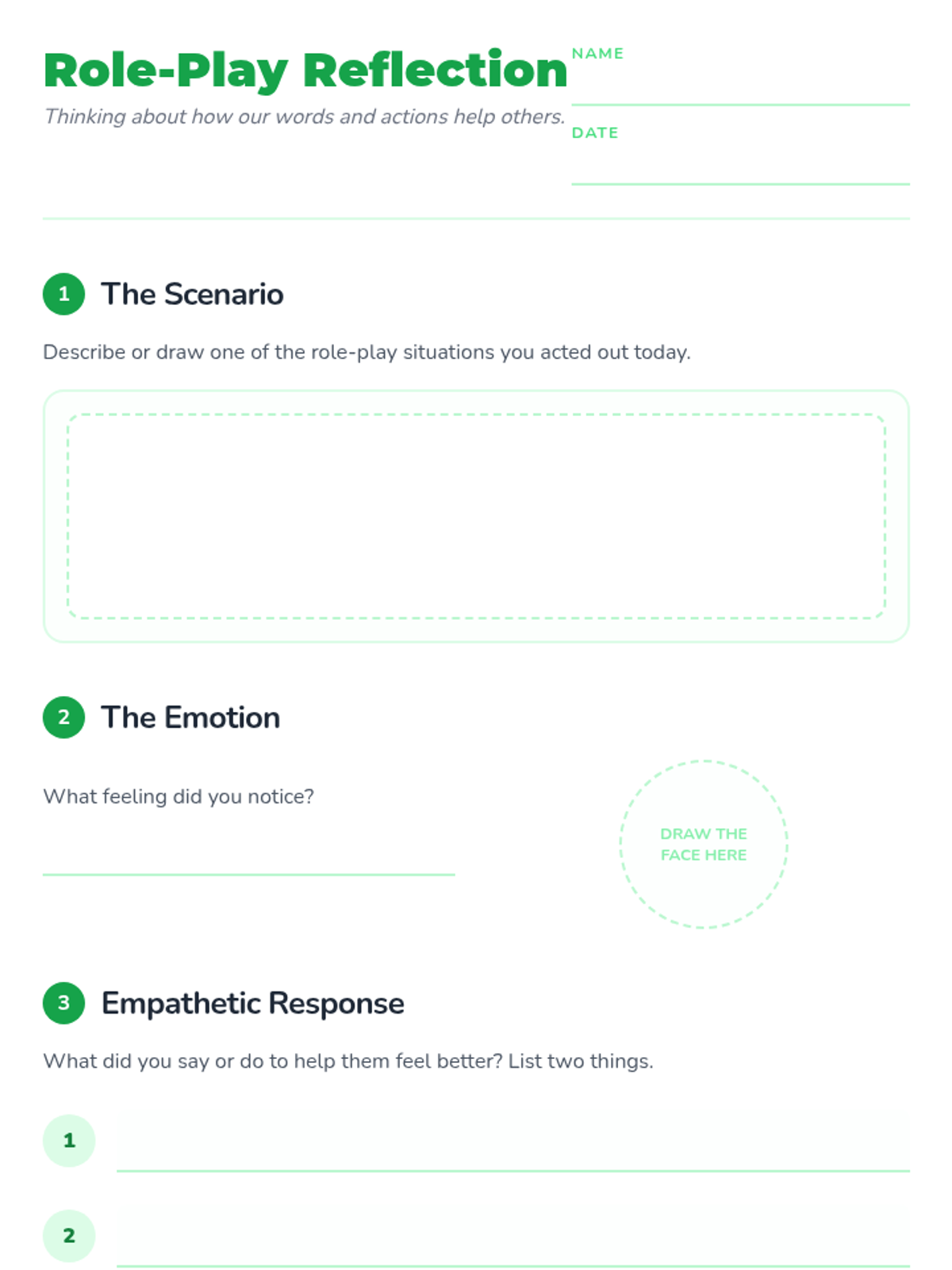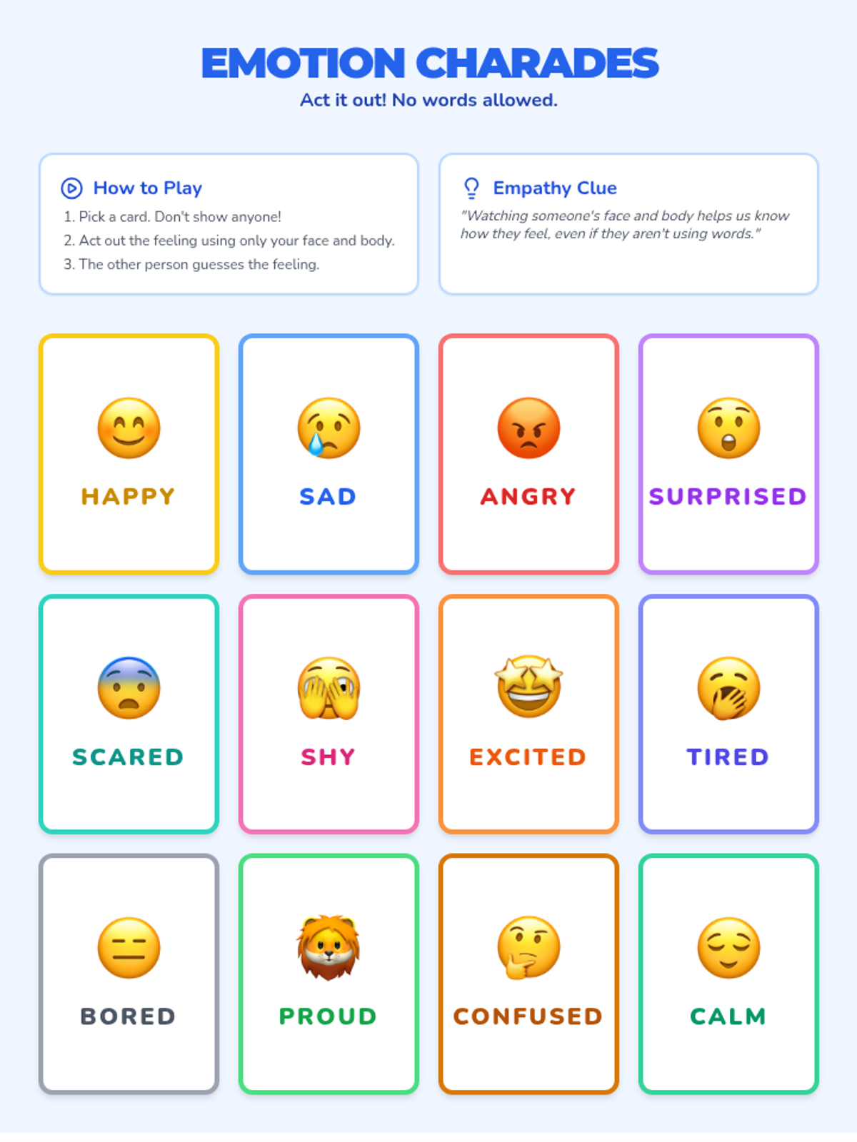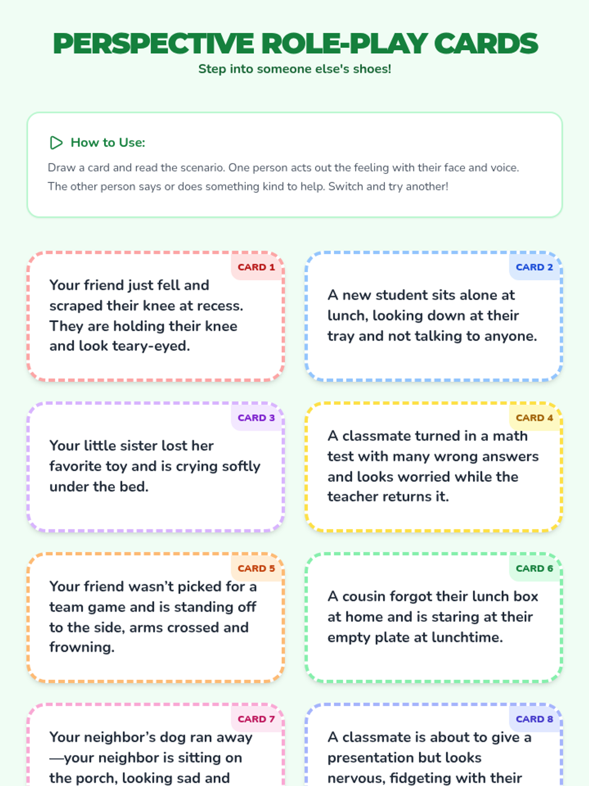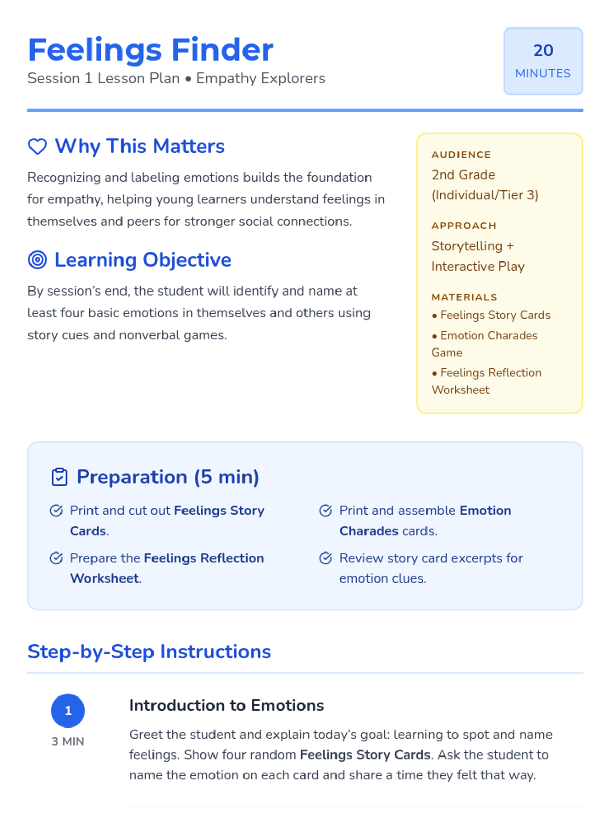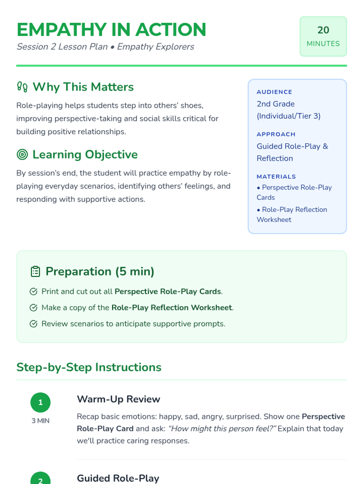 A three-session individual lesson sequence for 2nd graders to build empathy skills through recognizing emotions, practicing perspective-taking, and creating a kindness project. Students progress from identifying basic feelings to acting out supportive responses and finally applying their skills in a creative project.
