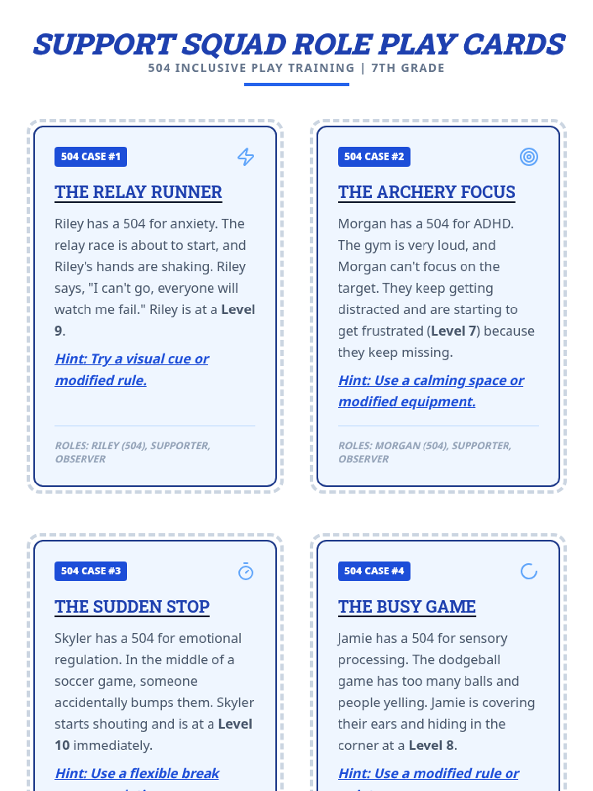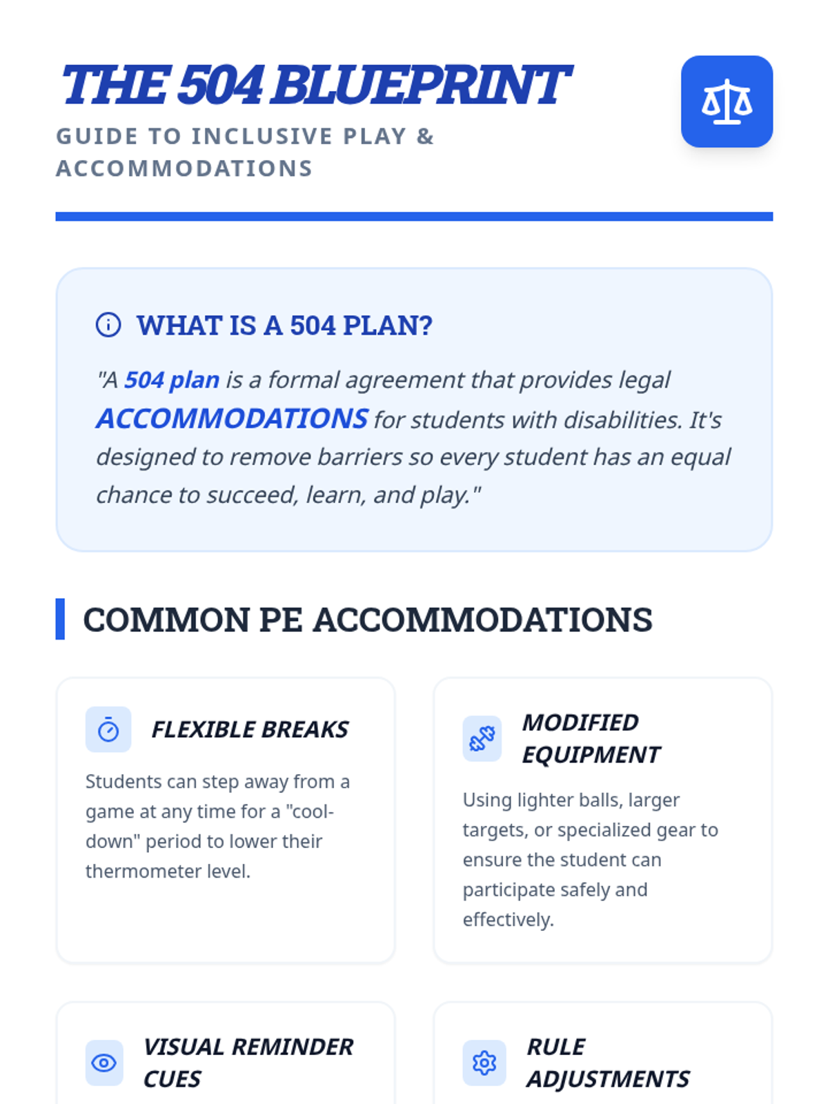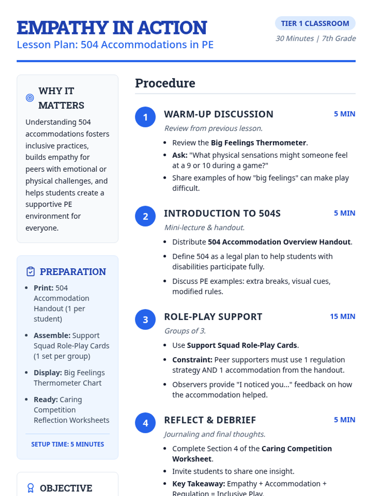 A two-part sequence for 7th graders designed to build empathy and inclusive behaviors in PE. Students learn to manage 'big feelings' during competition and understand how 504 accommodations support classmates with disabilities.