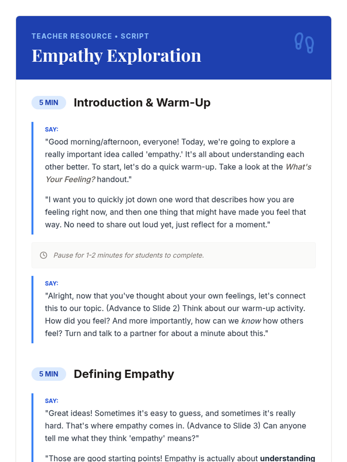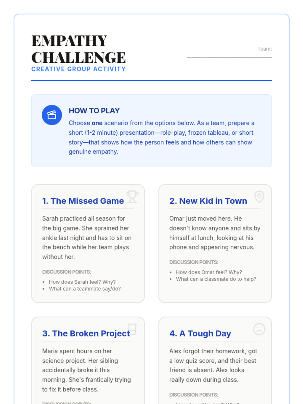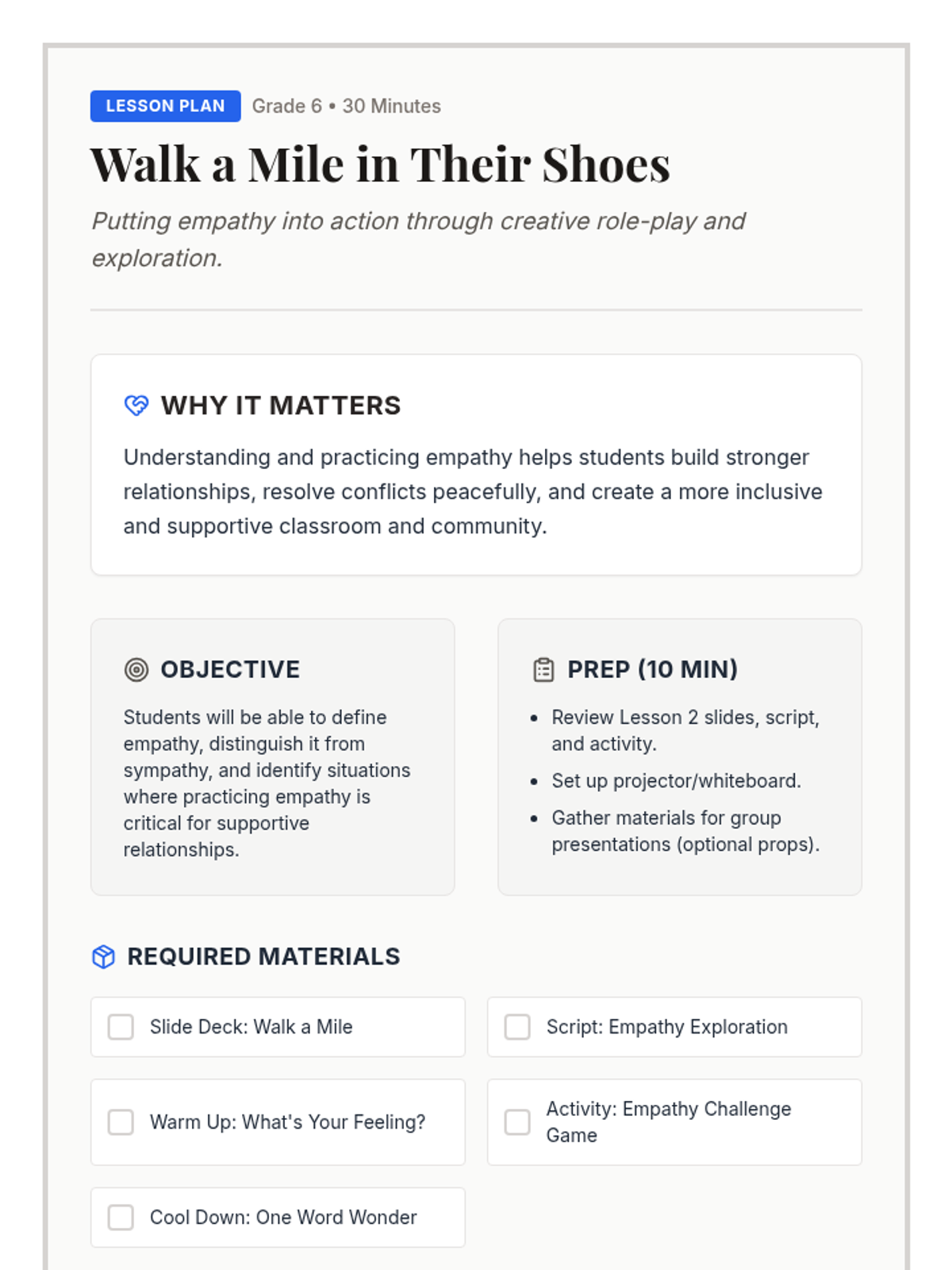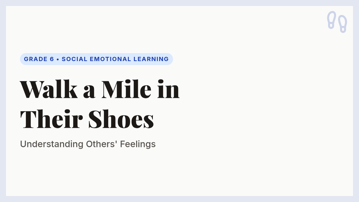 A two-lesson sequence for 6th graders focused on developing empathy to understand diverse perspectives and build a more inclusive classroom community. Students explore how putting themselves in others' shoes enhances learning and connection.