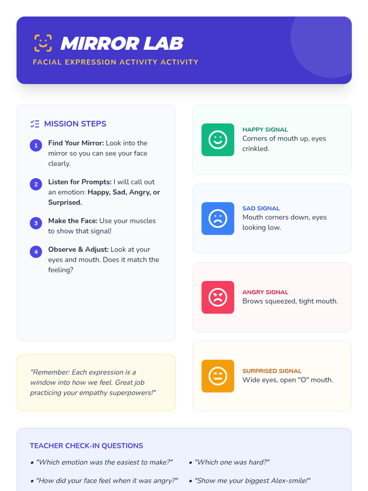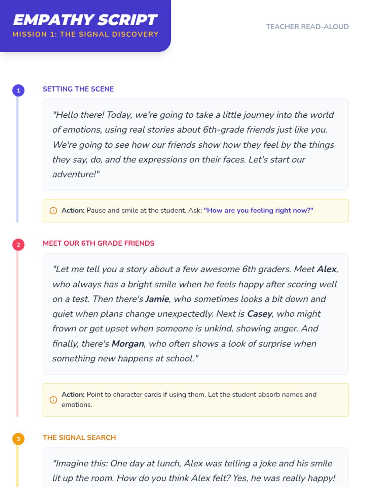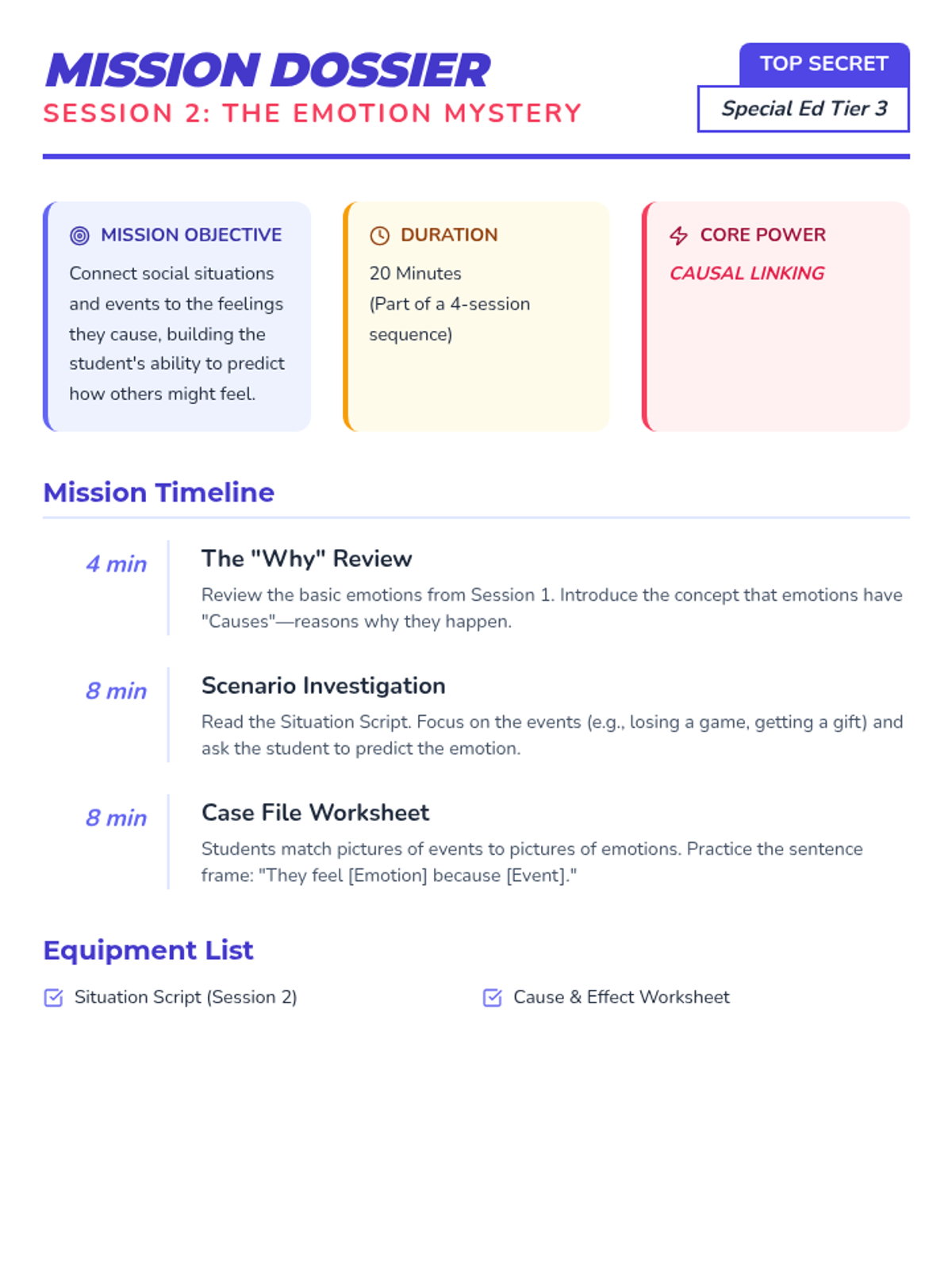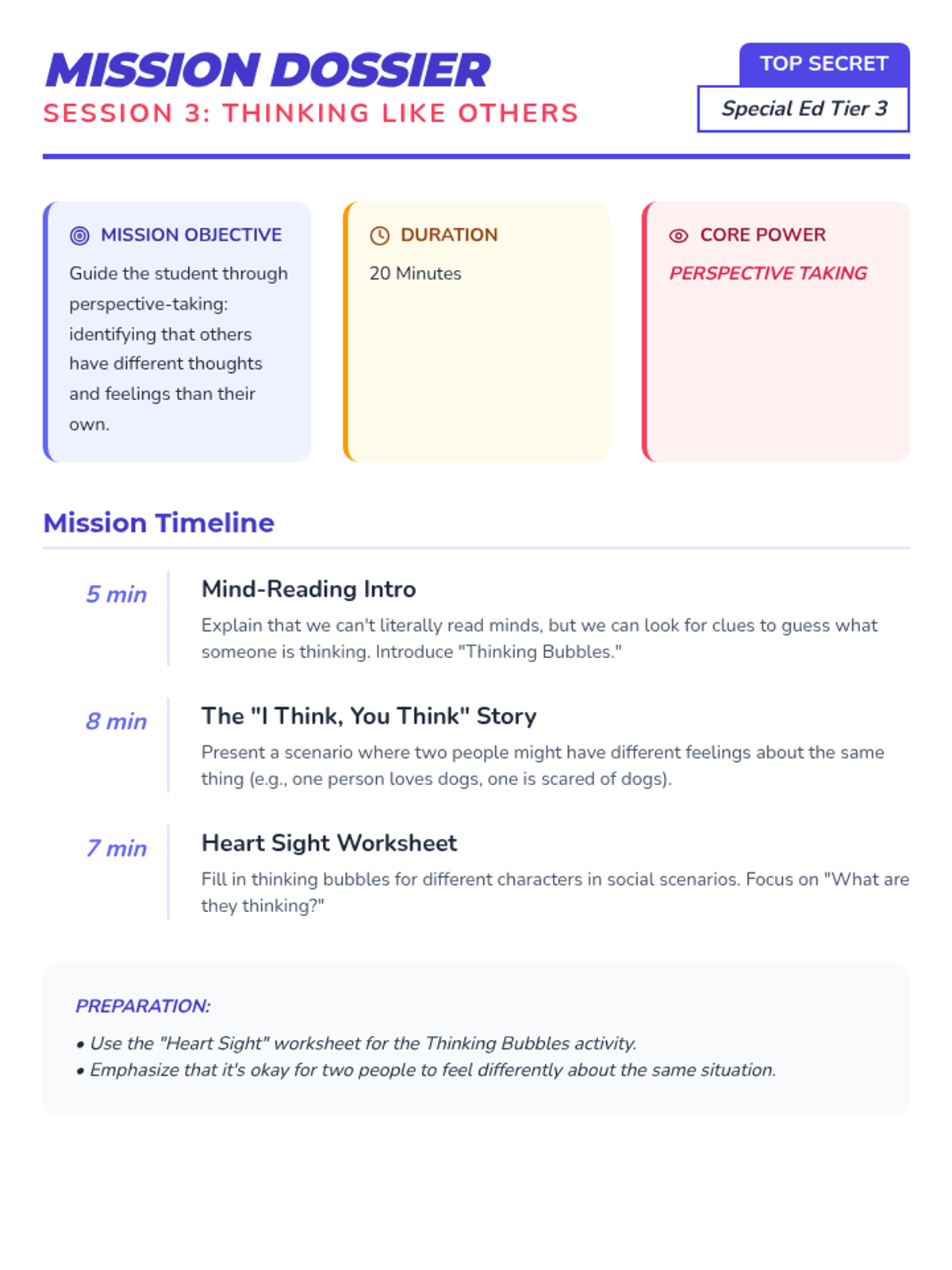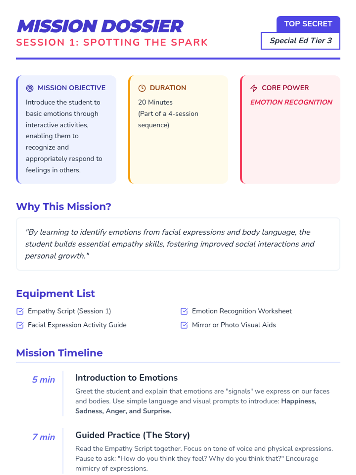 A four-session Tier 3 intervention sequence designed to help special education students identify, understand, and respond to emotions in others using a superhero theme. Students build empathy 'superpowers' through interactive stories, facial expression practice, and social scenario analysis.