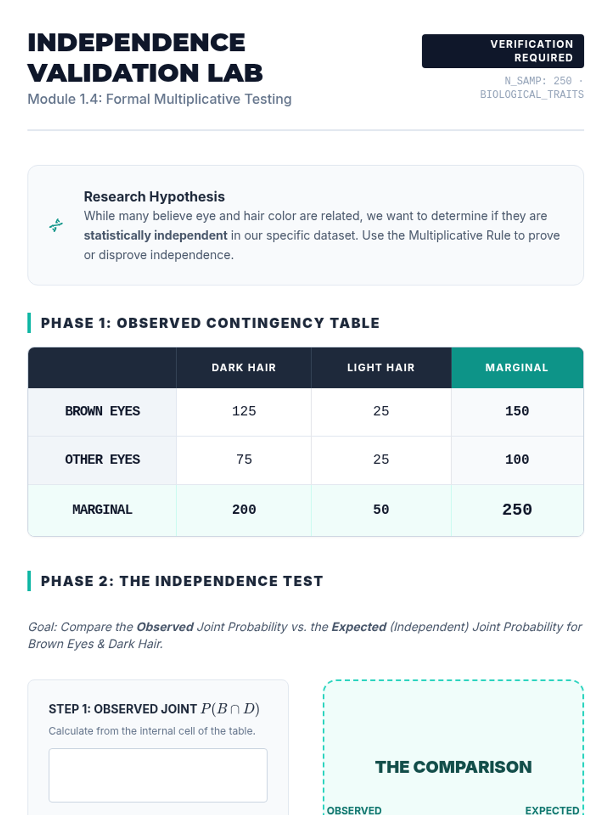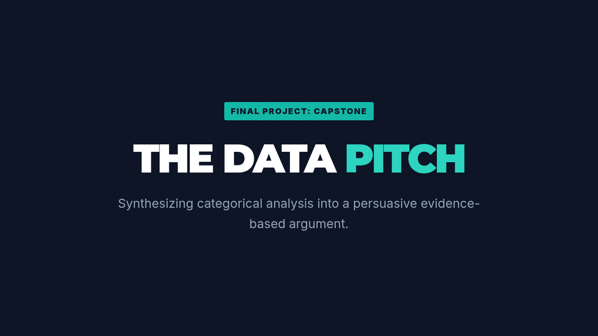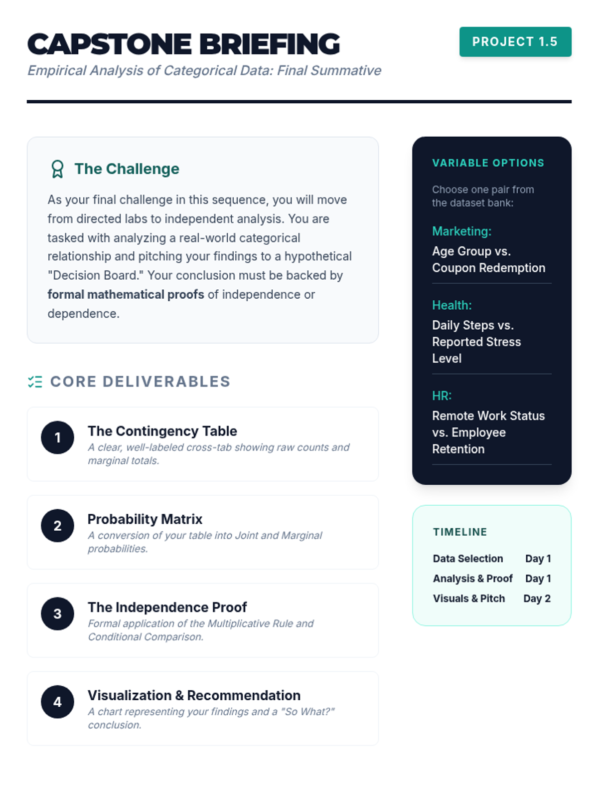 An undergraduate-level statistics sequence where students act as data scientists to analyze categorical data. They move from raw data cleaning to frequency tables, joint/marginal distributions, conditional probability, and formal independence testing, culminating in a data analysis capstone.