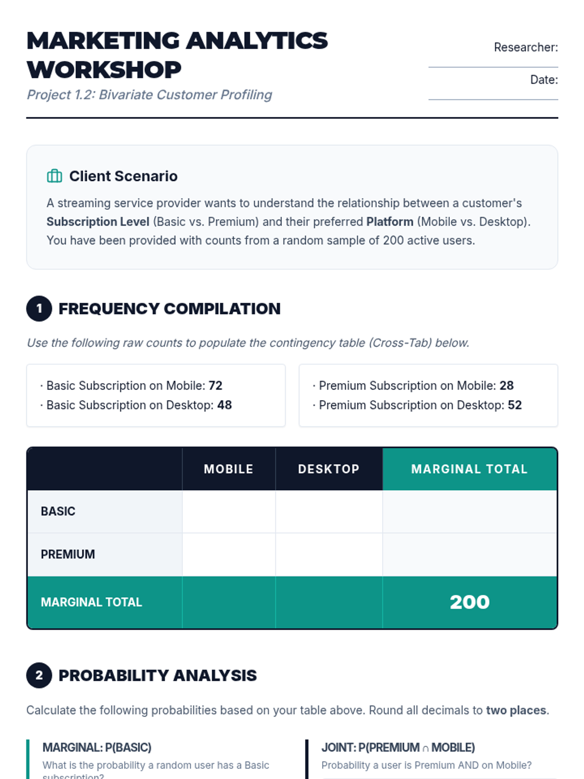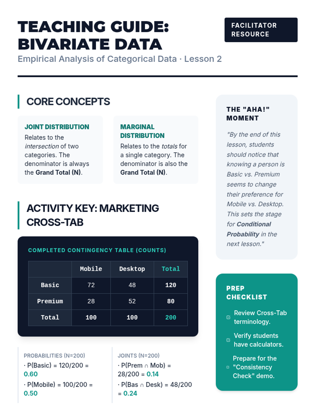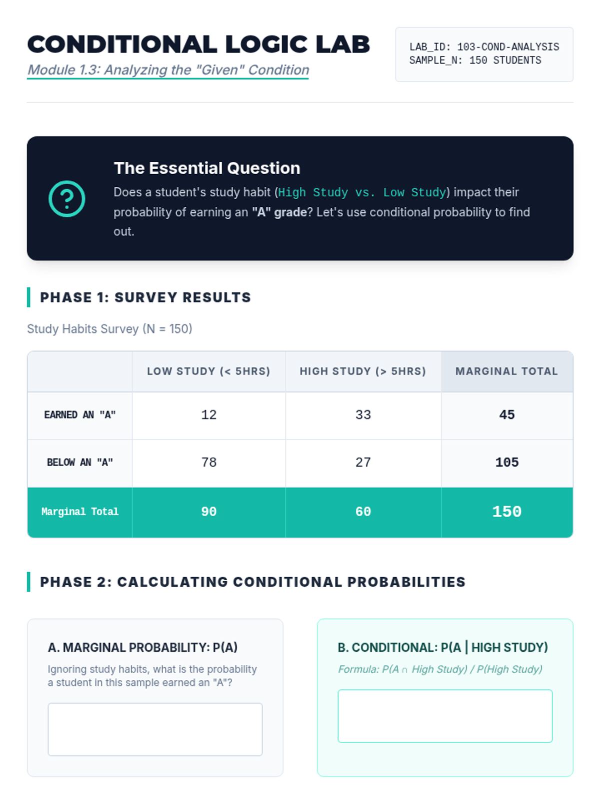 An undergraduate-level statistics sequence where students act as data scientists to analyze categorical data. They move from raw data cleaning to frequency tables, joint/marginal distributions, conditional probability, and formal independence testing, culminating in a data analysis capstone.