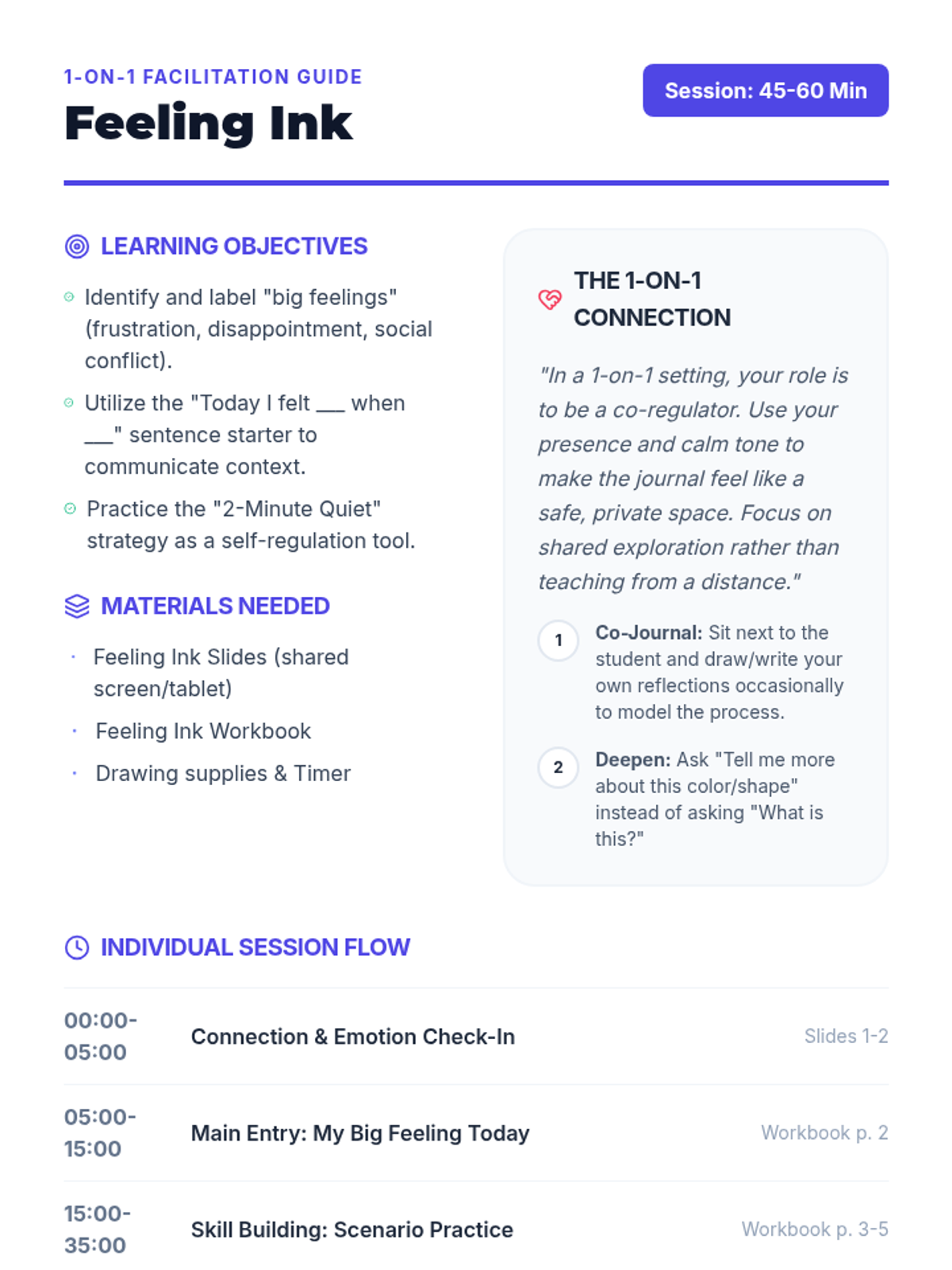 A comprehensive counseling sequence designed to help students navigate their emotional landscape, understand the impact of their actions on school relationships, and build a personalized repertoire of coping strategies. Through three core modules, students move from awareness to accountability to action.