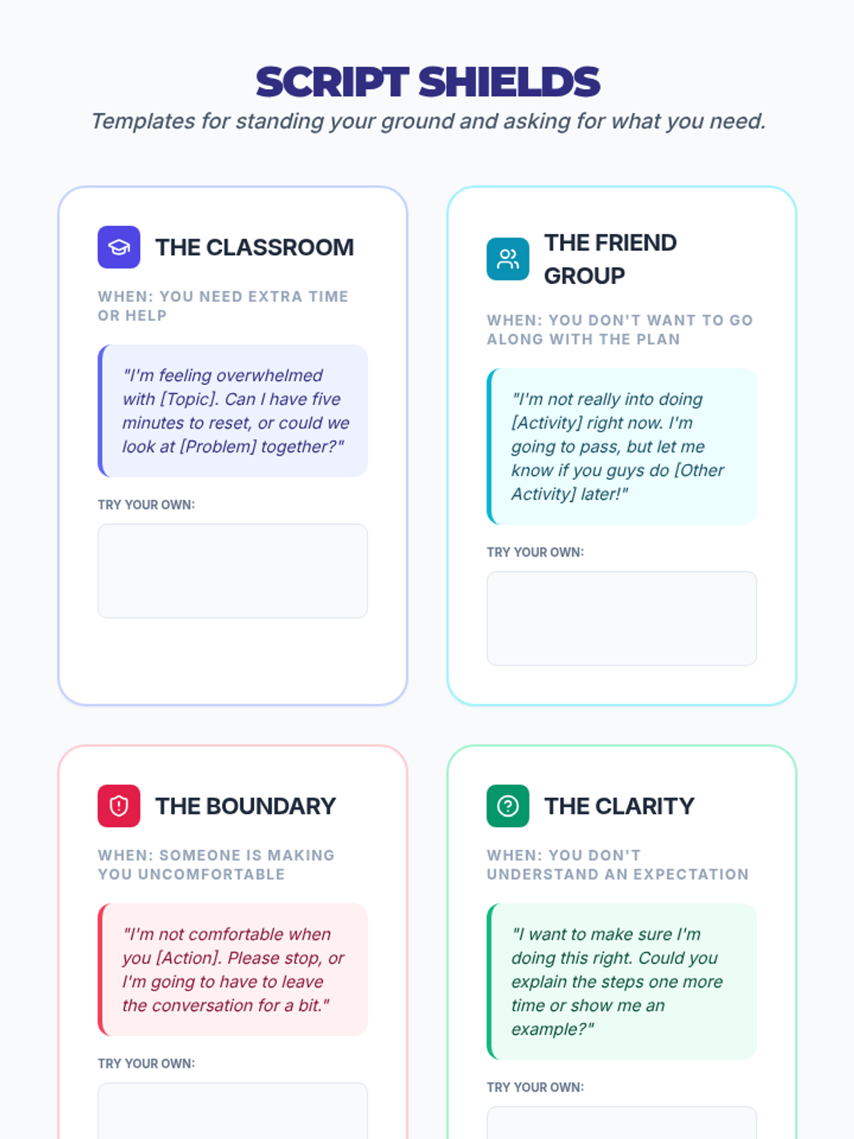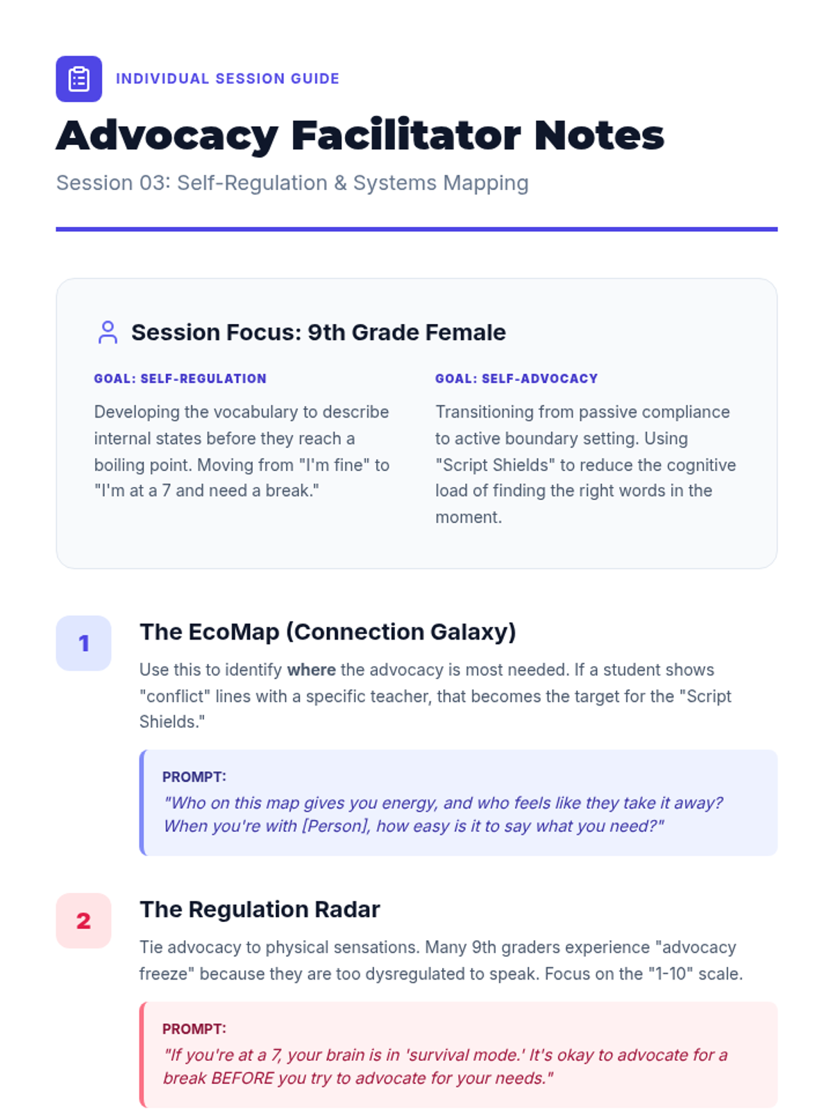 A comprehensive sequence designed for 9th and 10th graders to develop self-awareness, emotional regulation, and self-advocacy skills through visual tools and structured practice.