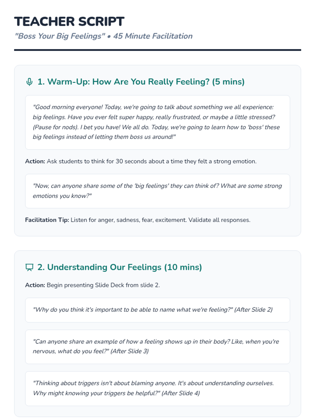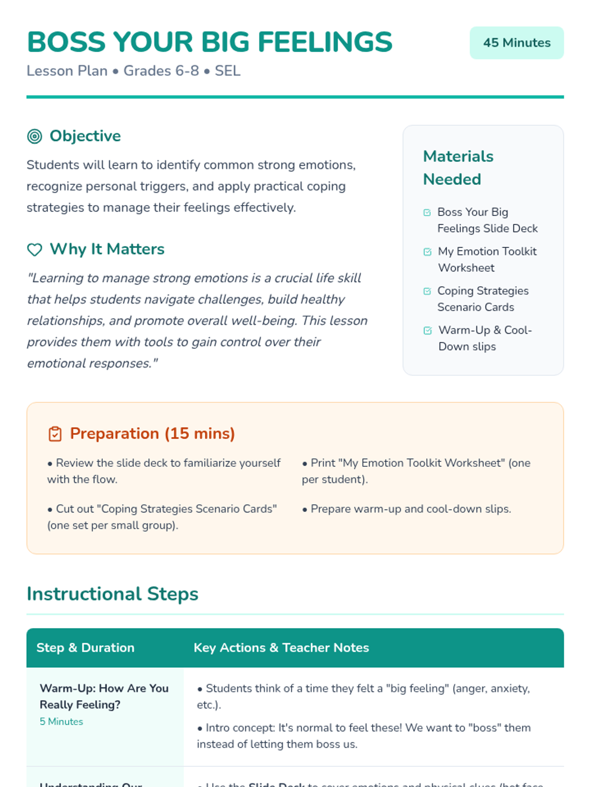 This sequence provides students with essential life skills, ranging from emotional regulation for middle schoolers to goal-setting and action alignment for university students. It includes comprehensive lesson plans, slide decks, and hands-on activities to foster resilience and productivity.