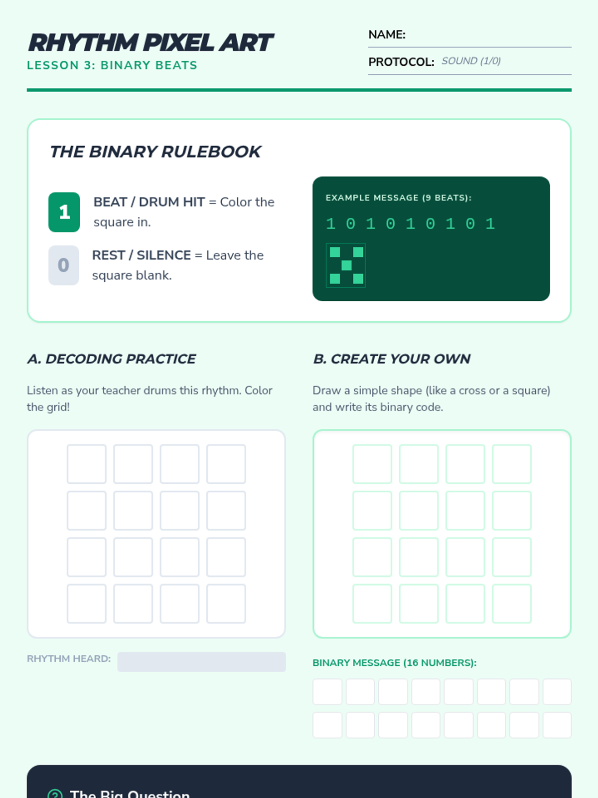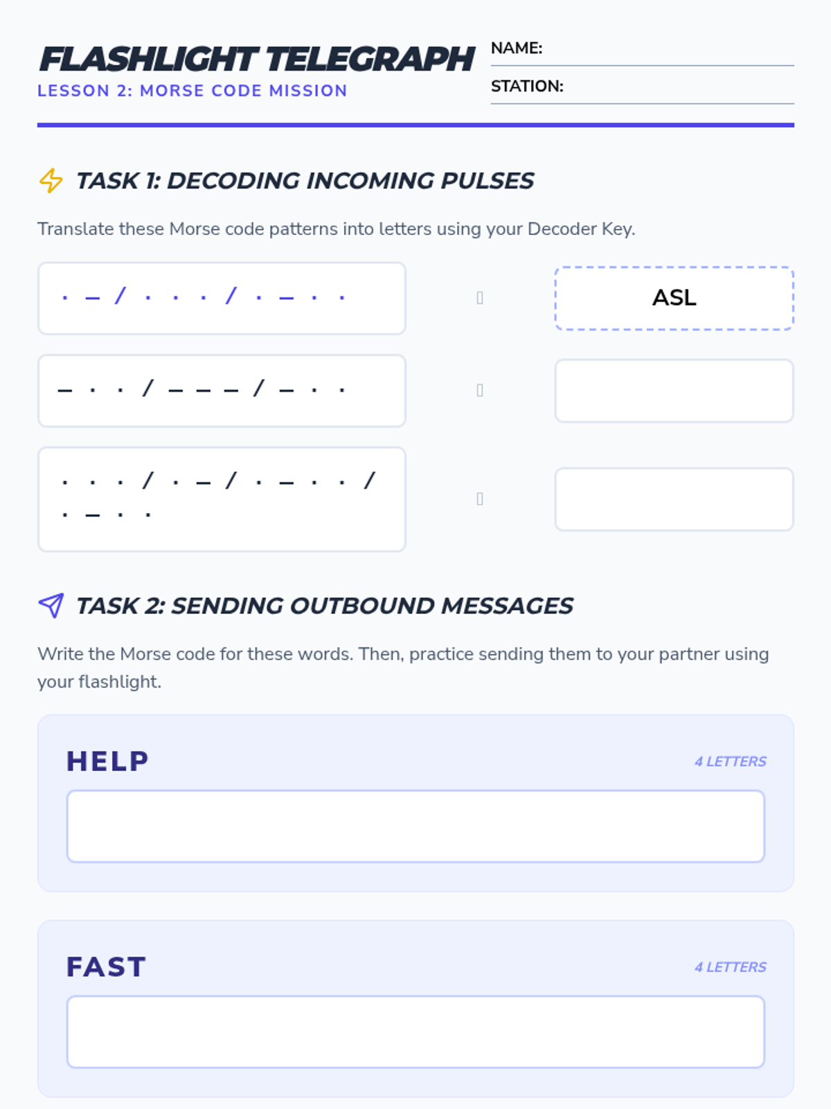 A 4th-grade physics sequence exploring how waves (sound and light) encode and transmit information. Students learn about analog signals, Morse code, binary patterns, and system design through hands-on simulations.