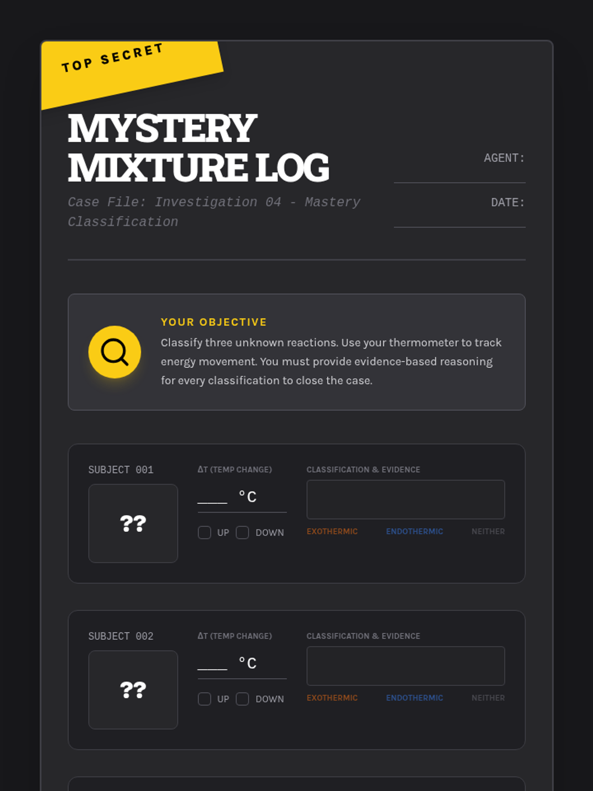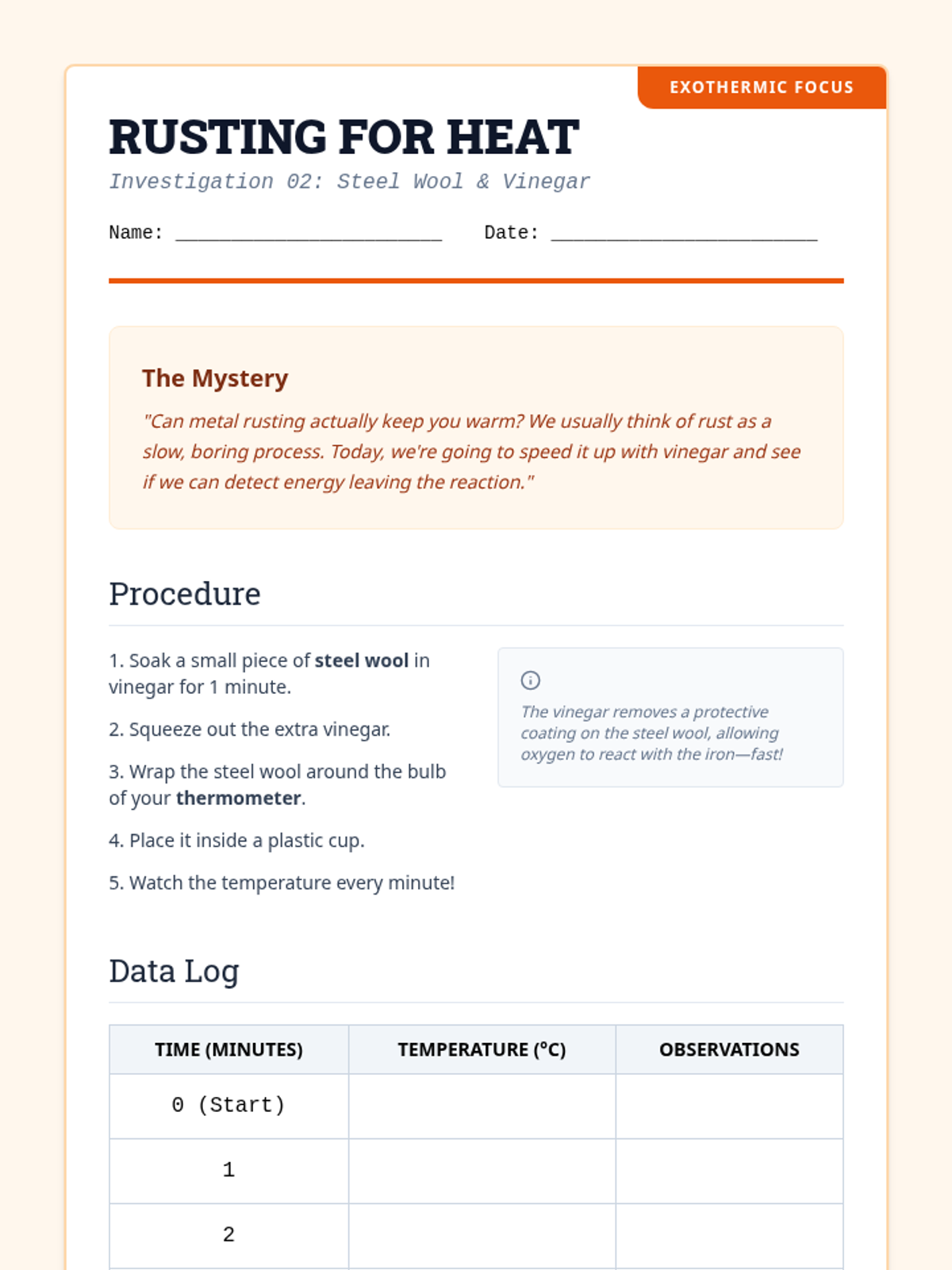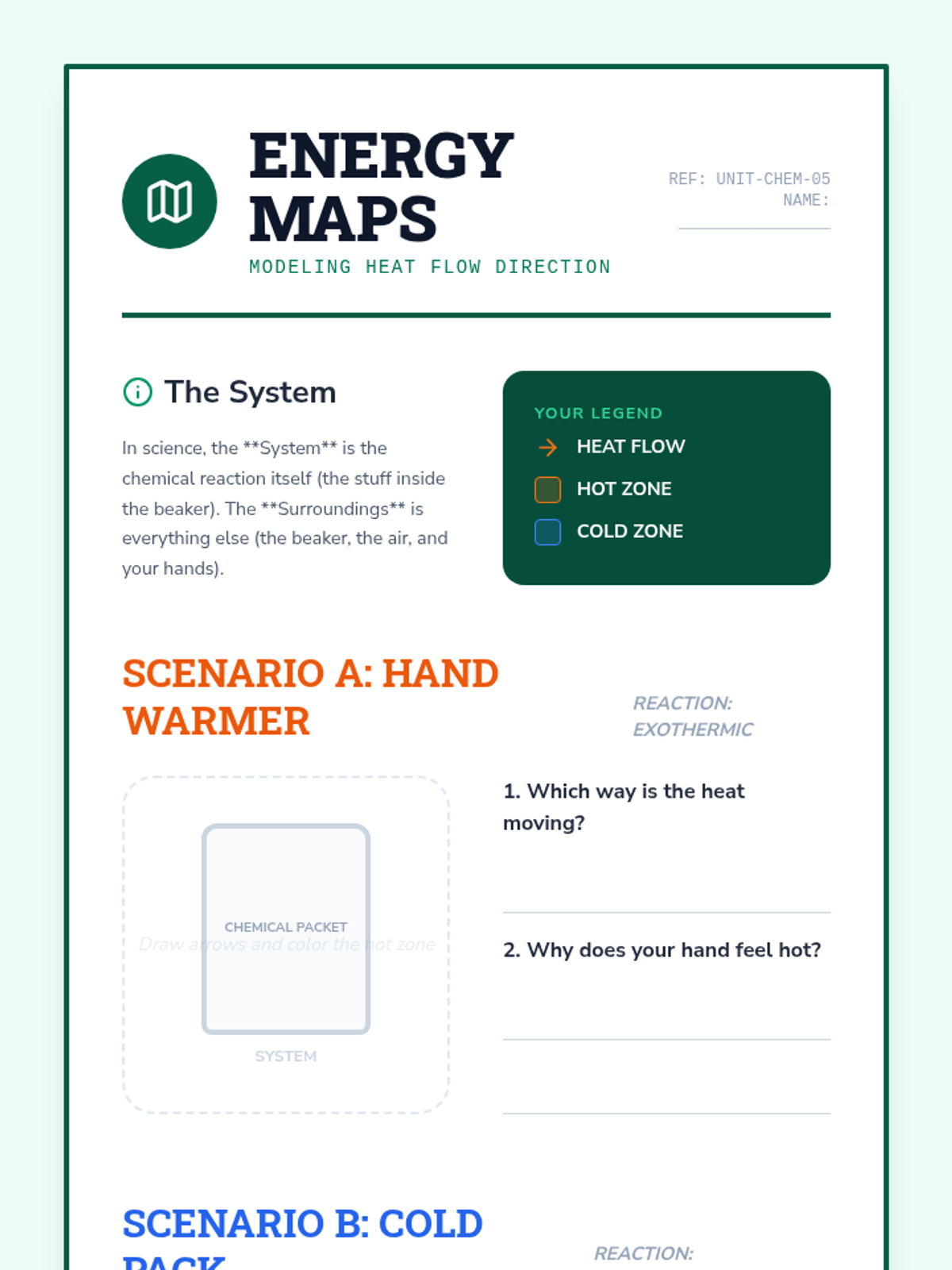 An inquiry-based exploration of energy transfer in chemical reactions for 5th-grade students. This sequence covers identifying chemical changes, measuring exothermic and endothermic temperature shifts, and modeling the direction of heat flow.