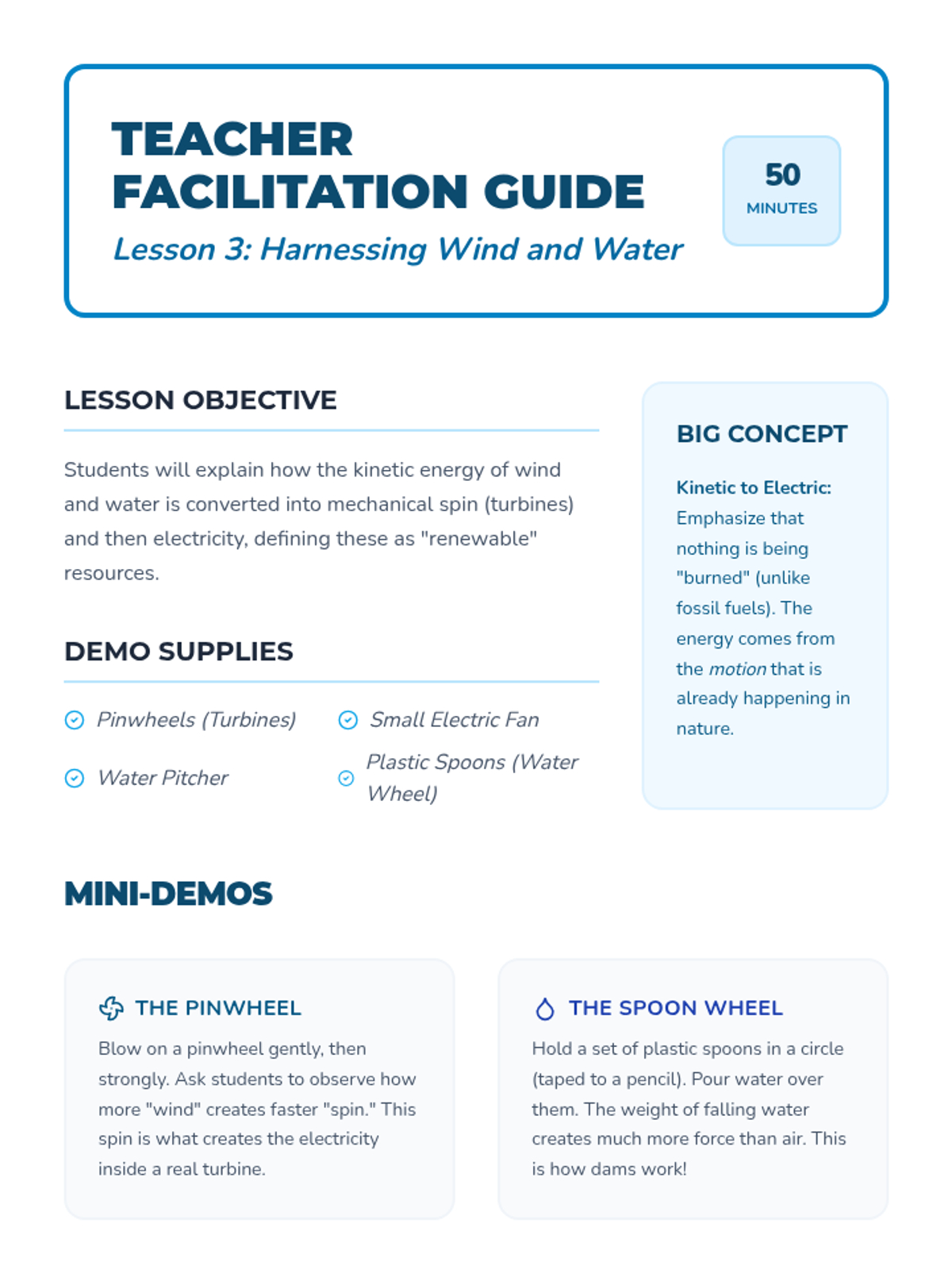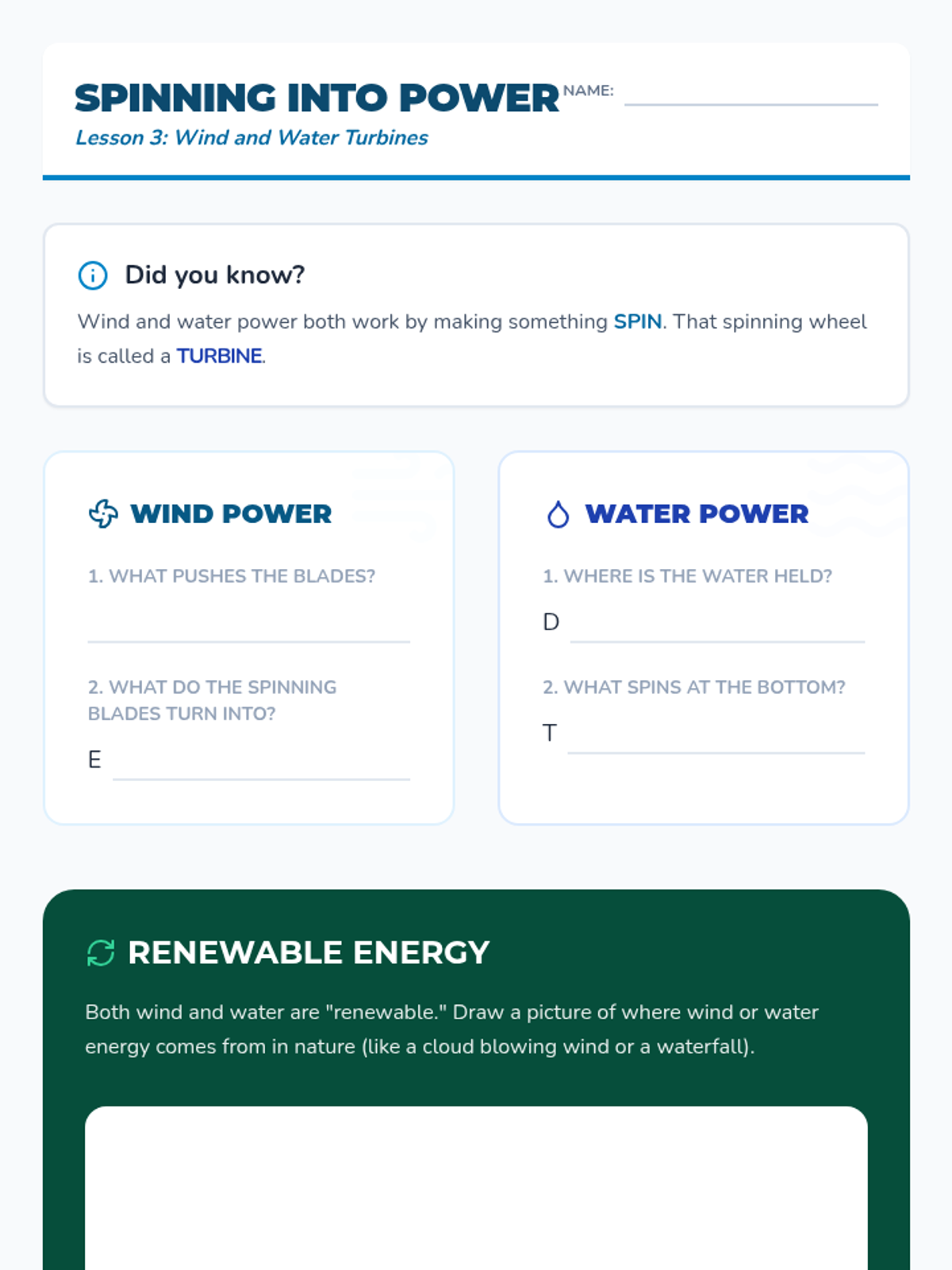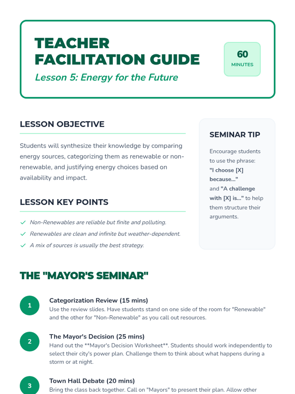 A 5-lesson unit for 3rd grade exploring renewable (solar, wind, hydro) and non-renewable (coal, oil, gas) energy sources. Students learn how energy is harvested and compare the sustainability of different power sources through discussions, simulations, and visual case studies.
