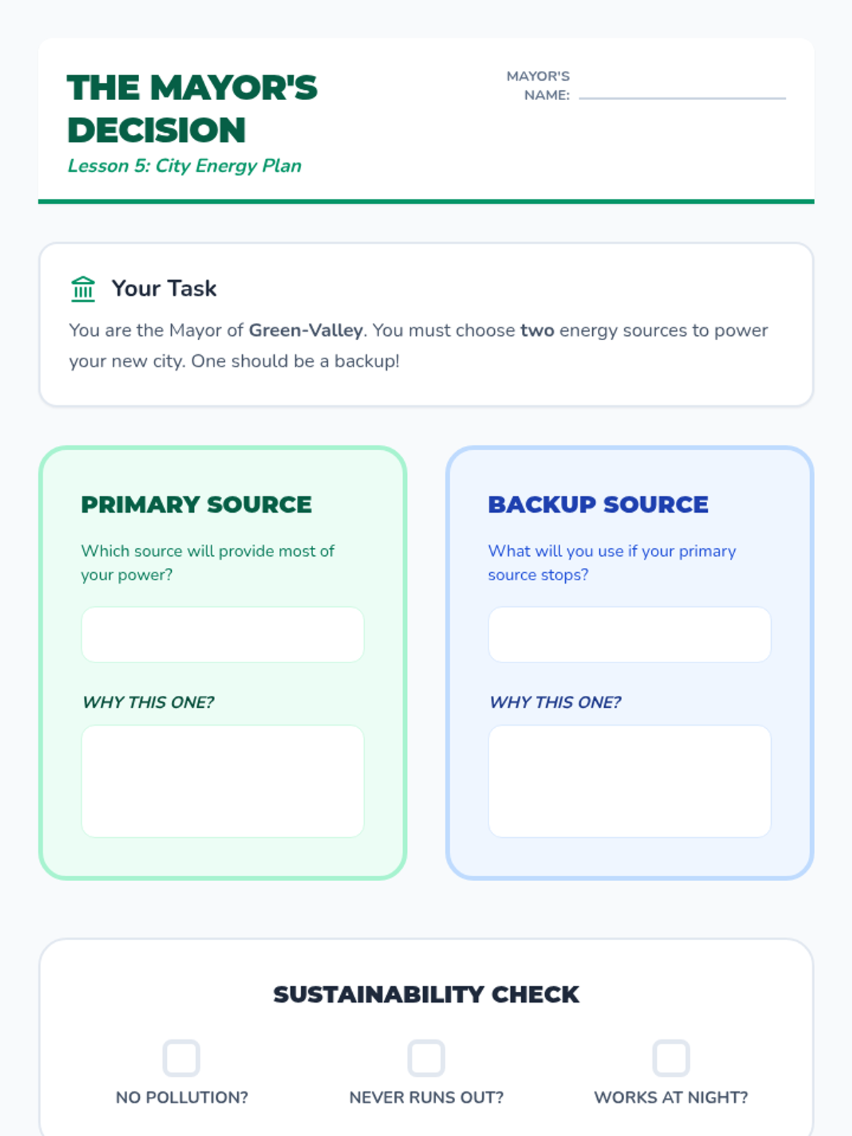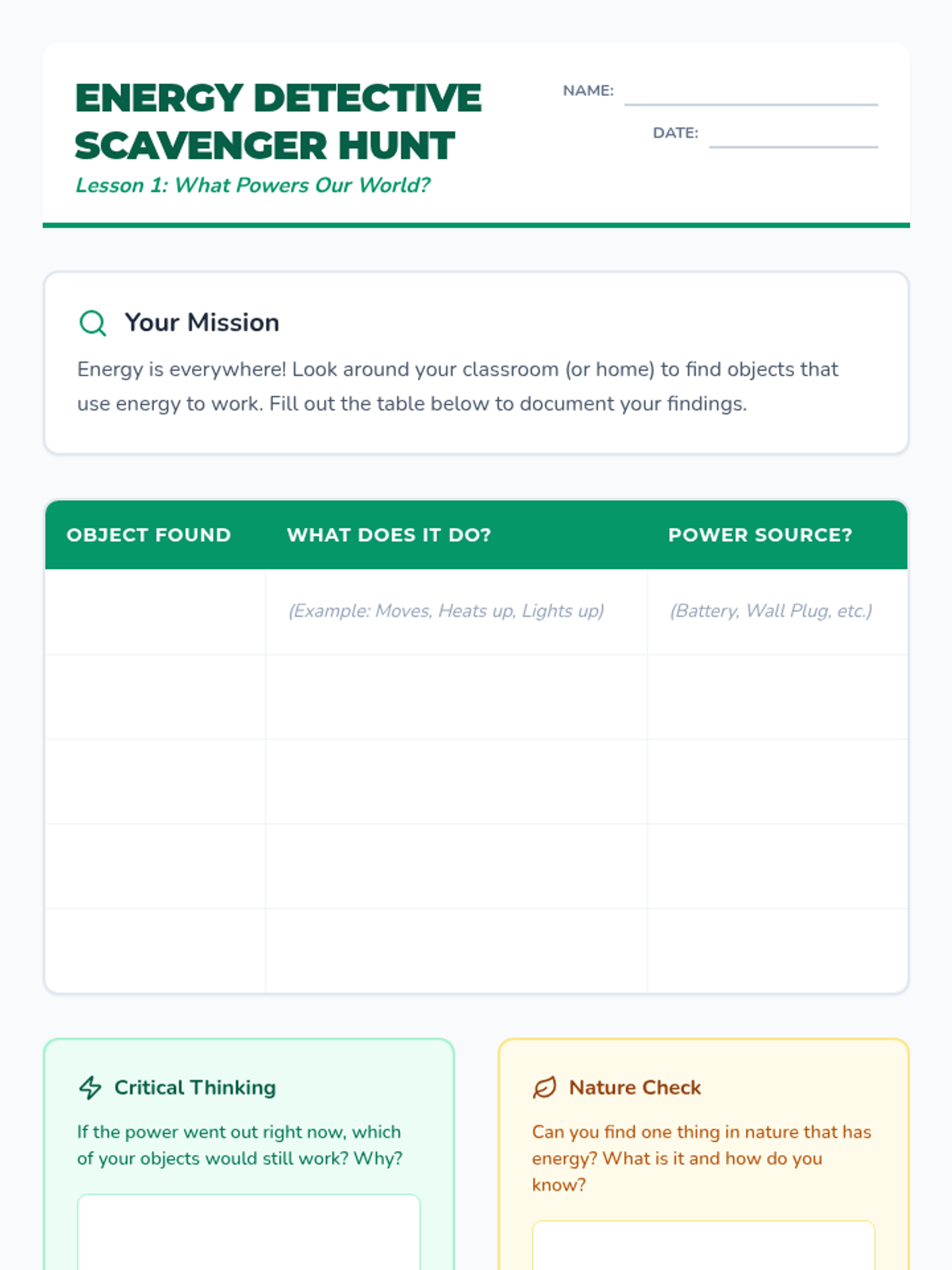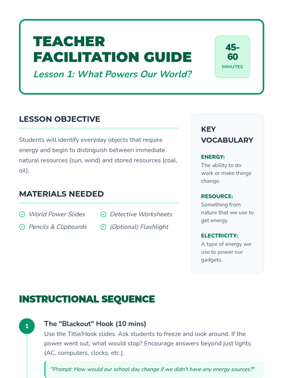 A 5-lesson unit for 3rd grade exploring renewable (solar, wind, hydro) and non-renewable (coal, oil, gas) energy sources. Students learn how energy is harvested and compare the sustainability of different power sources through discussions, simulations, and visual case studies.