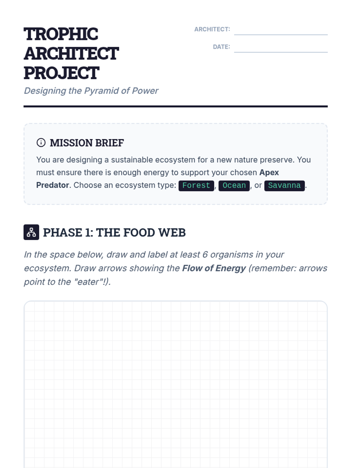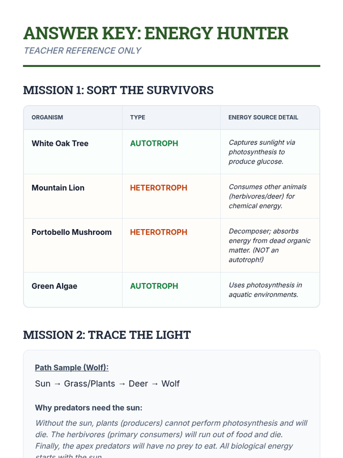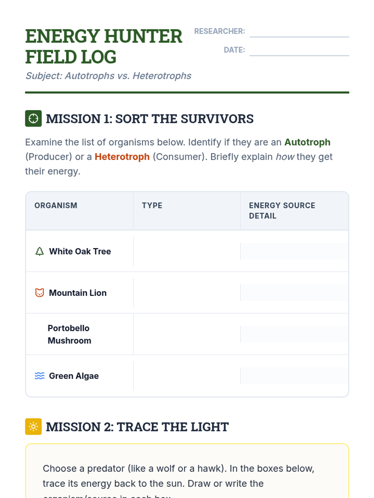 A 7th-grade life science sequence exploring how organisms acquire and use energy. Students journey from the sun to the cell, investigating photosynthesis, cellular respiration, and the complex webs of energy that sustain ecosystems.