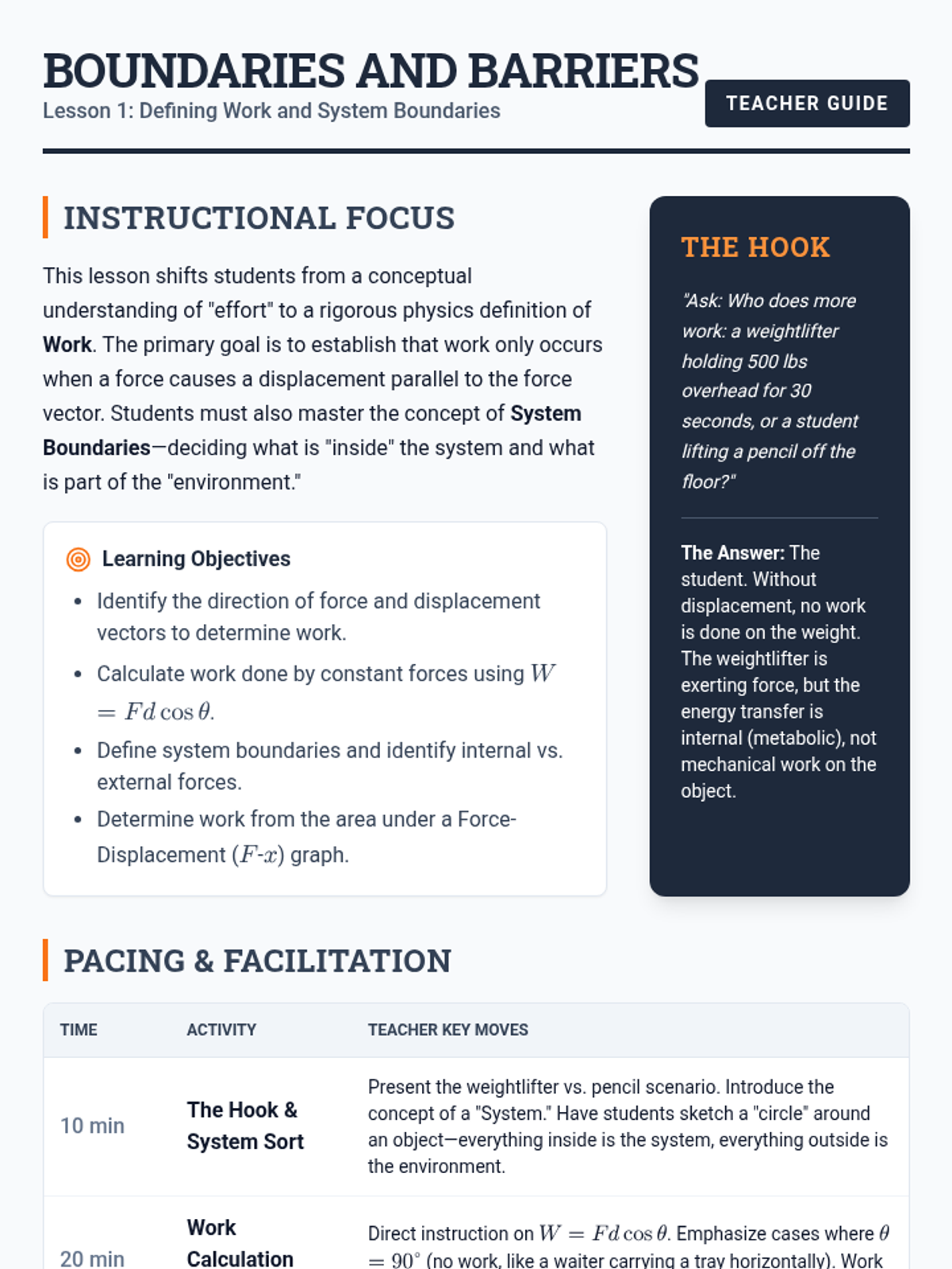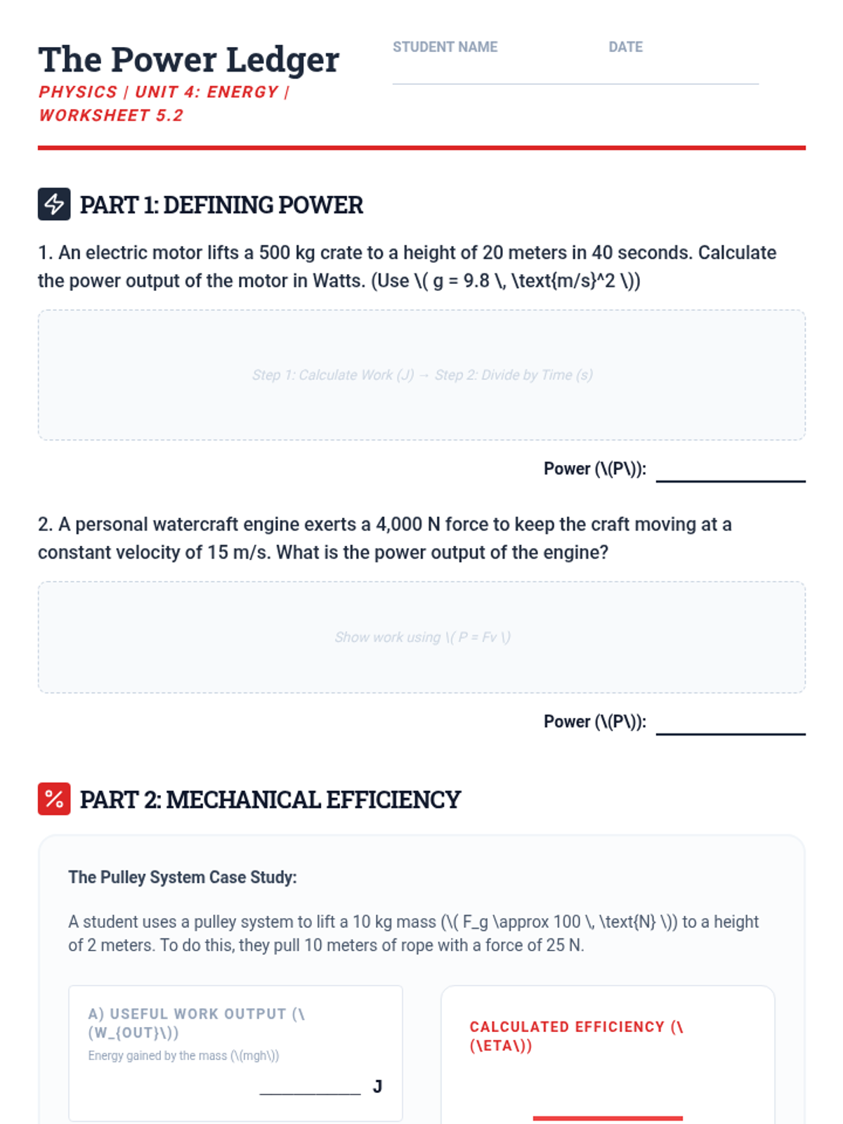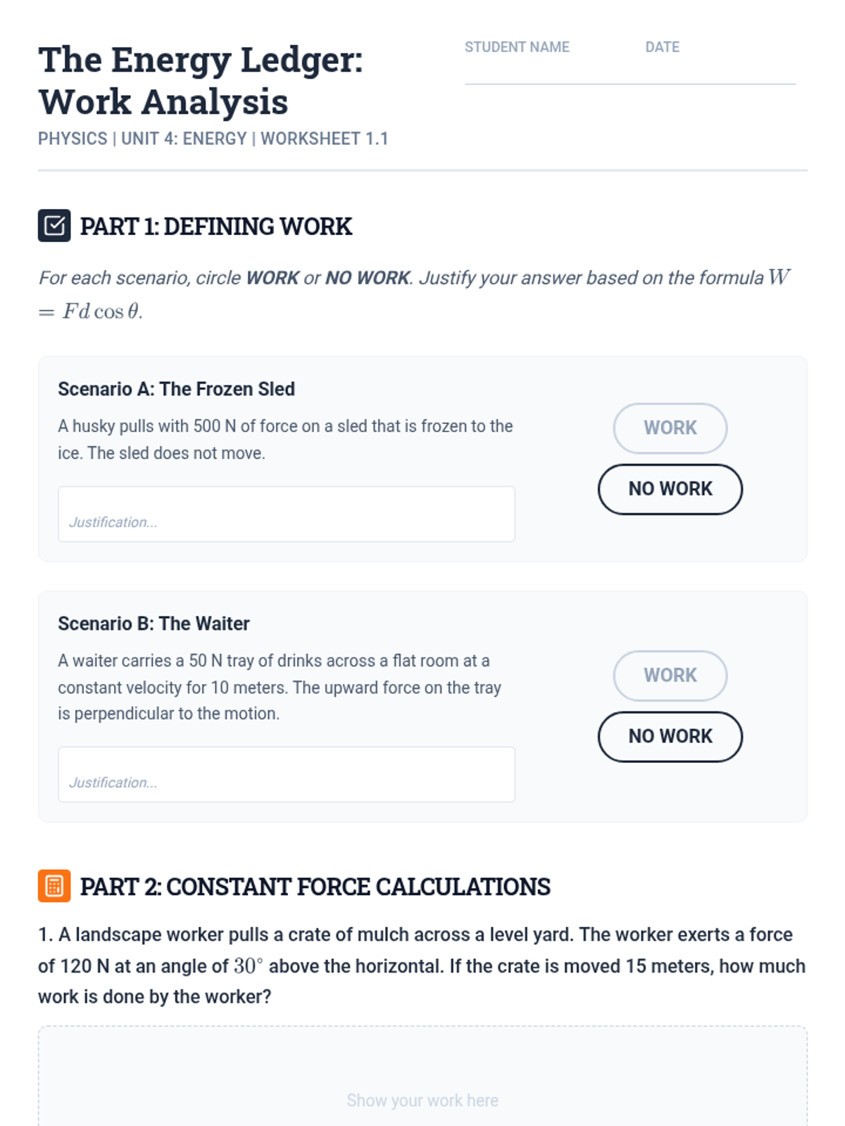 A comprehensive 11th-grade physics sequence focused on the mathematical modeling of work, kinetic energy, potential energy, and the law of conservation of energy. Students move from basic definitions of work to complex system analysis, culminating in power and efficiency calculations.