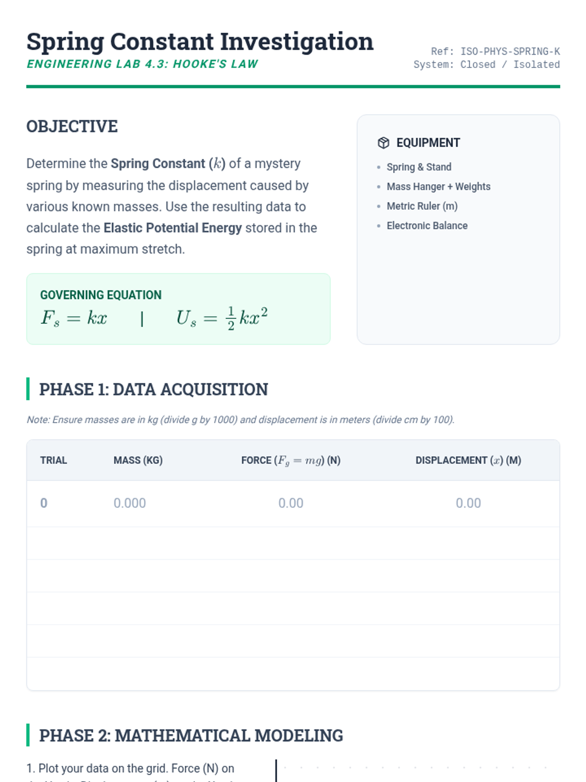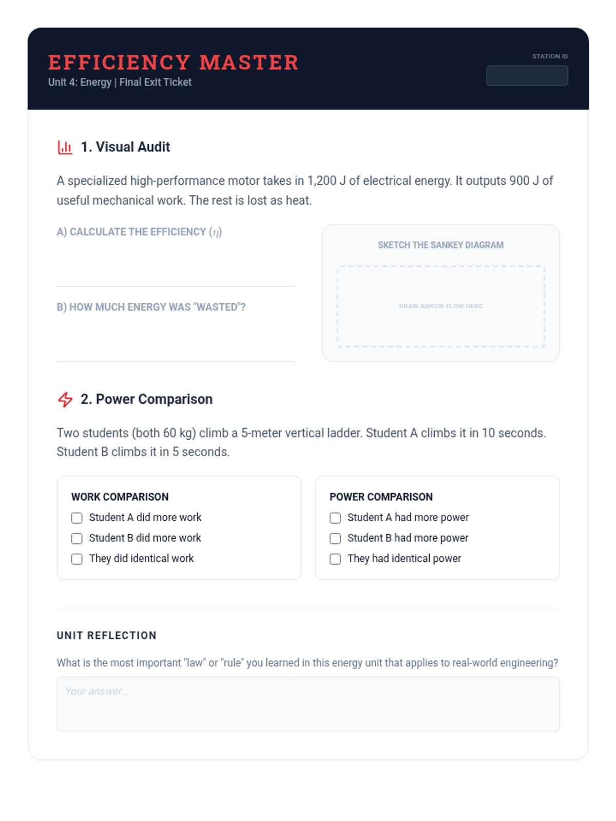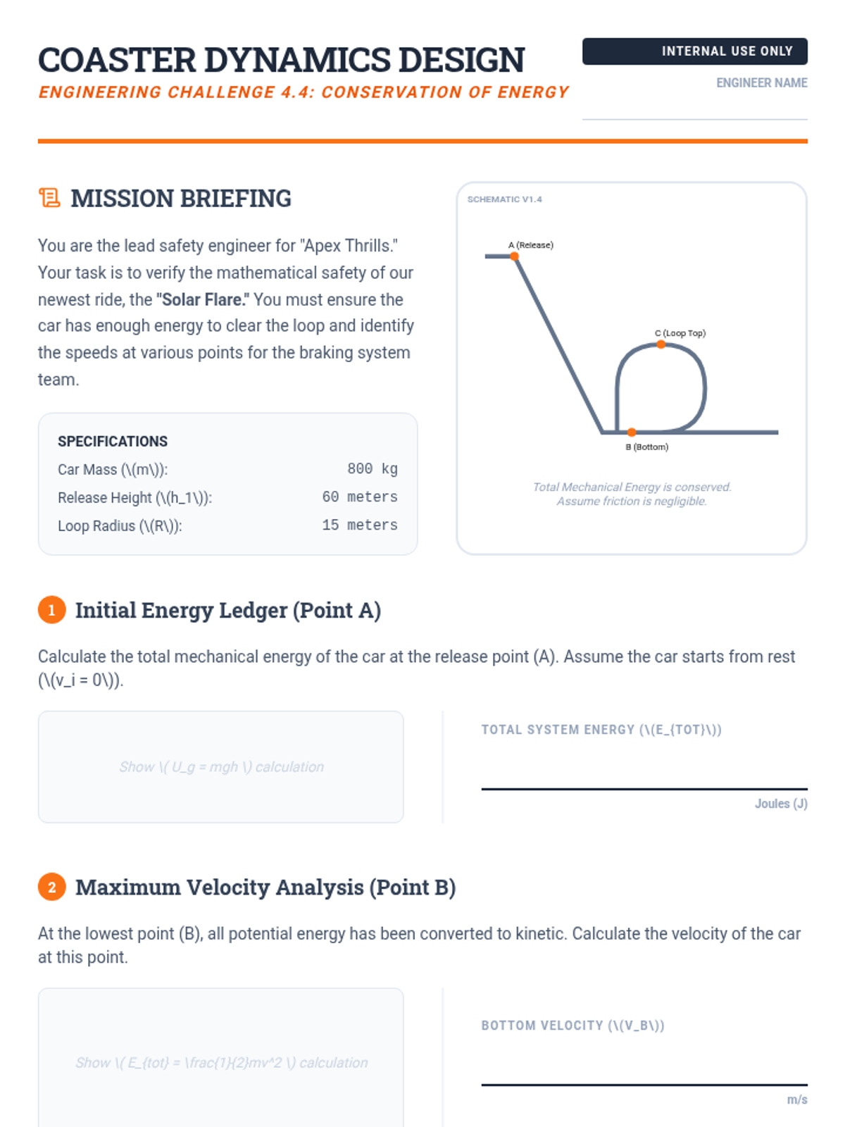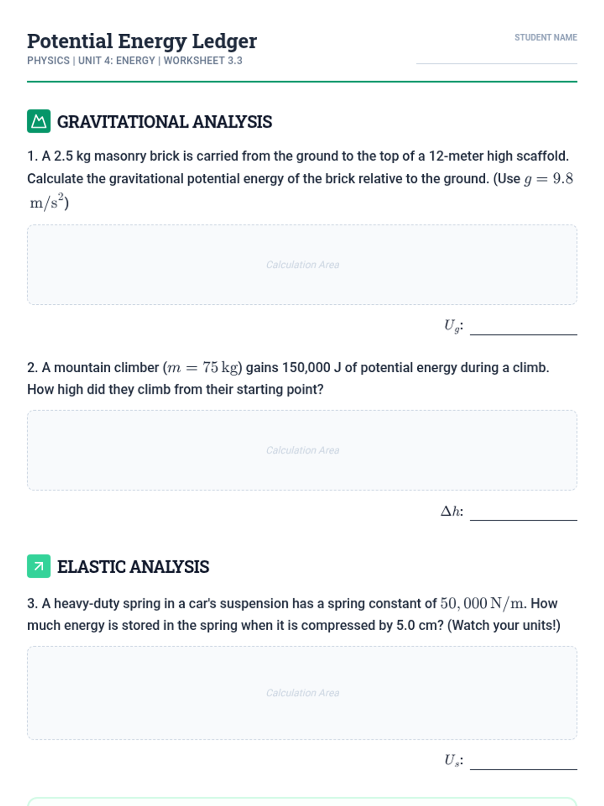 A comprehensive 11th-grade physics sequence focused on the mathematical modeling of work, kinetic energy, potential energy, and the law of conservation of energy. Students move from basic definitions of work to complex system analysis, culminating in power and efficiency calculations.