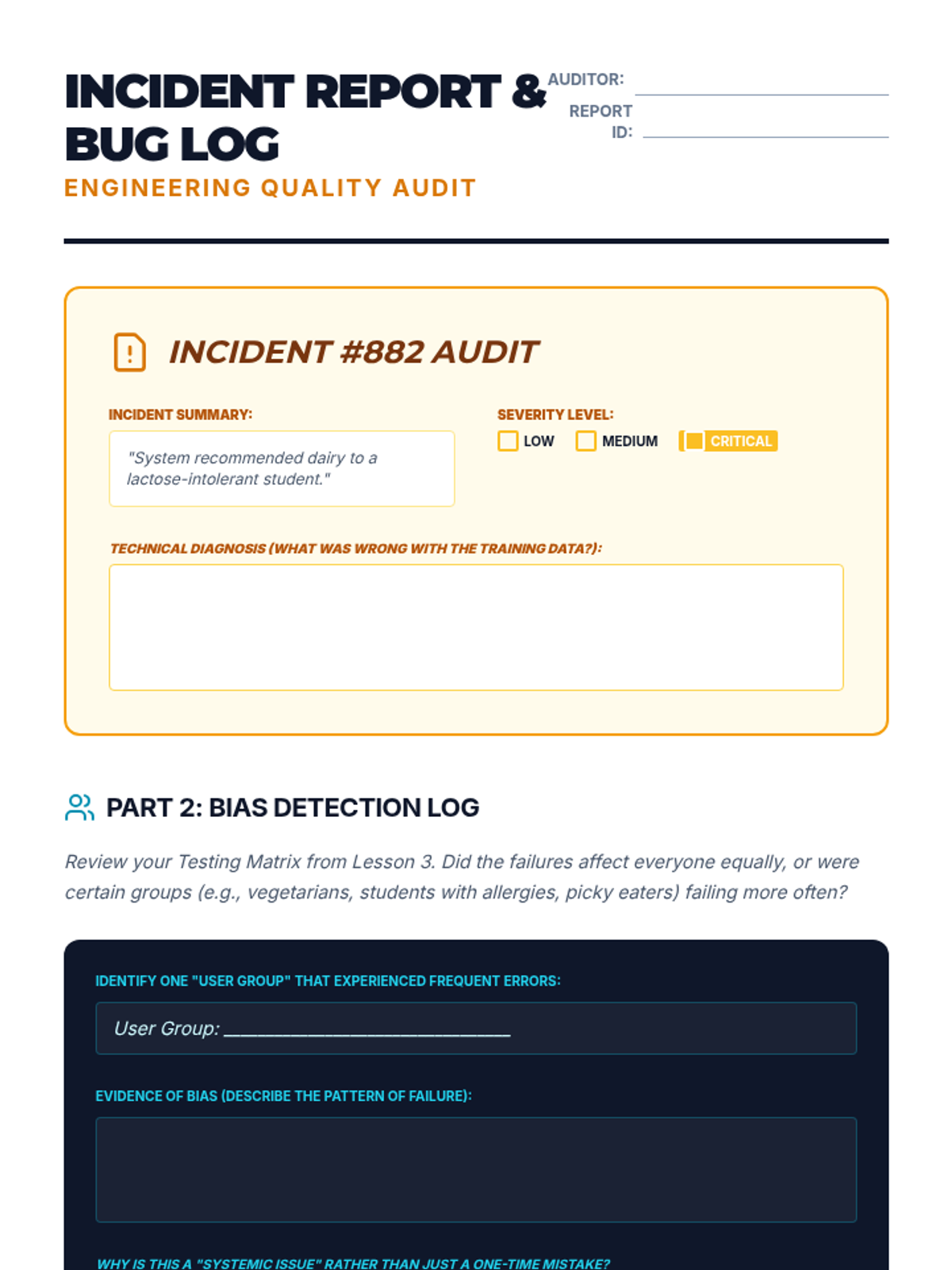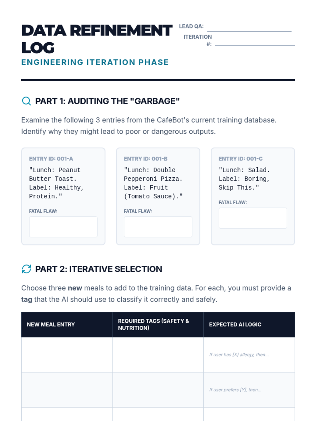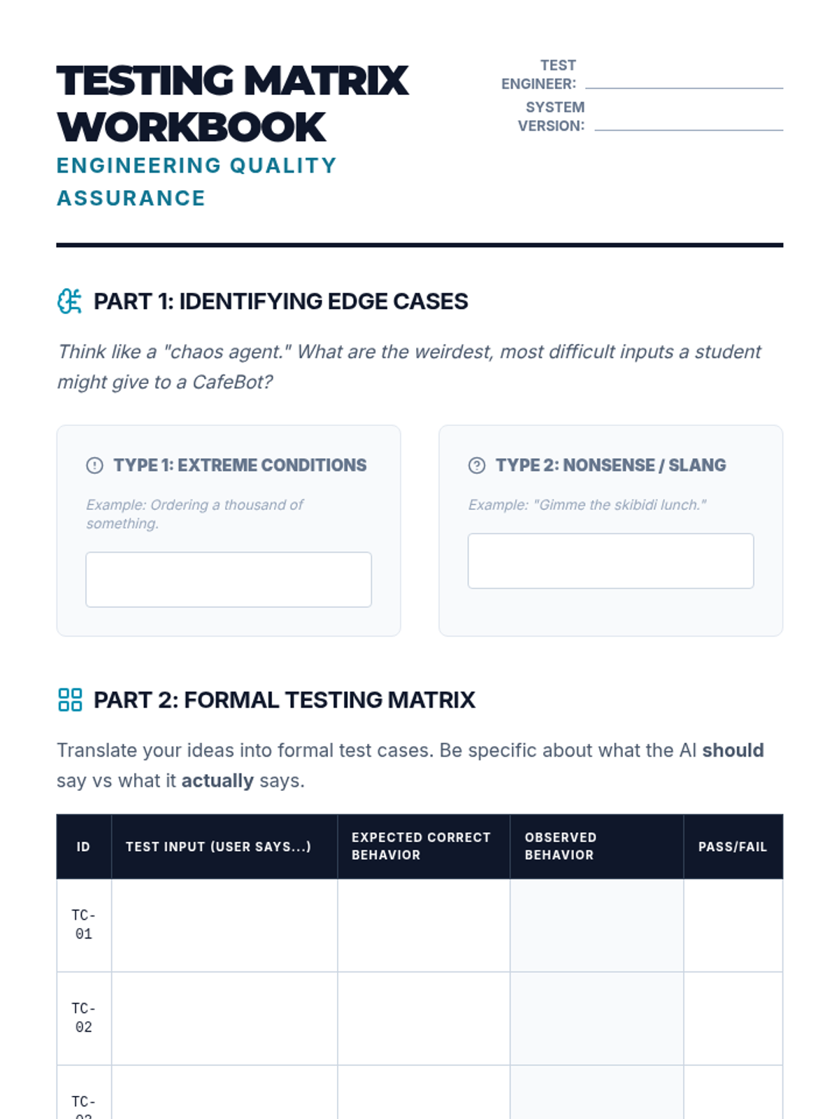 Students assume the role of Quality Assurance Engineers to audit and improve a flawed AI prototype through an iterative engineering lifecycle of testing, documentation, and refinement.