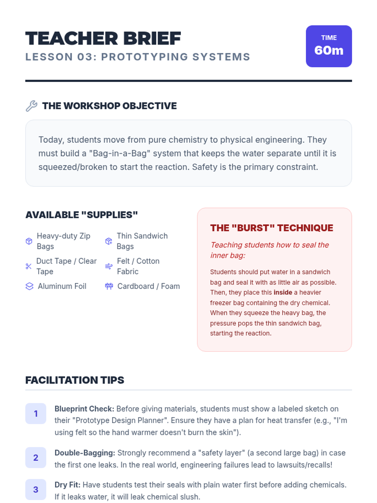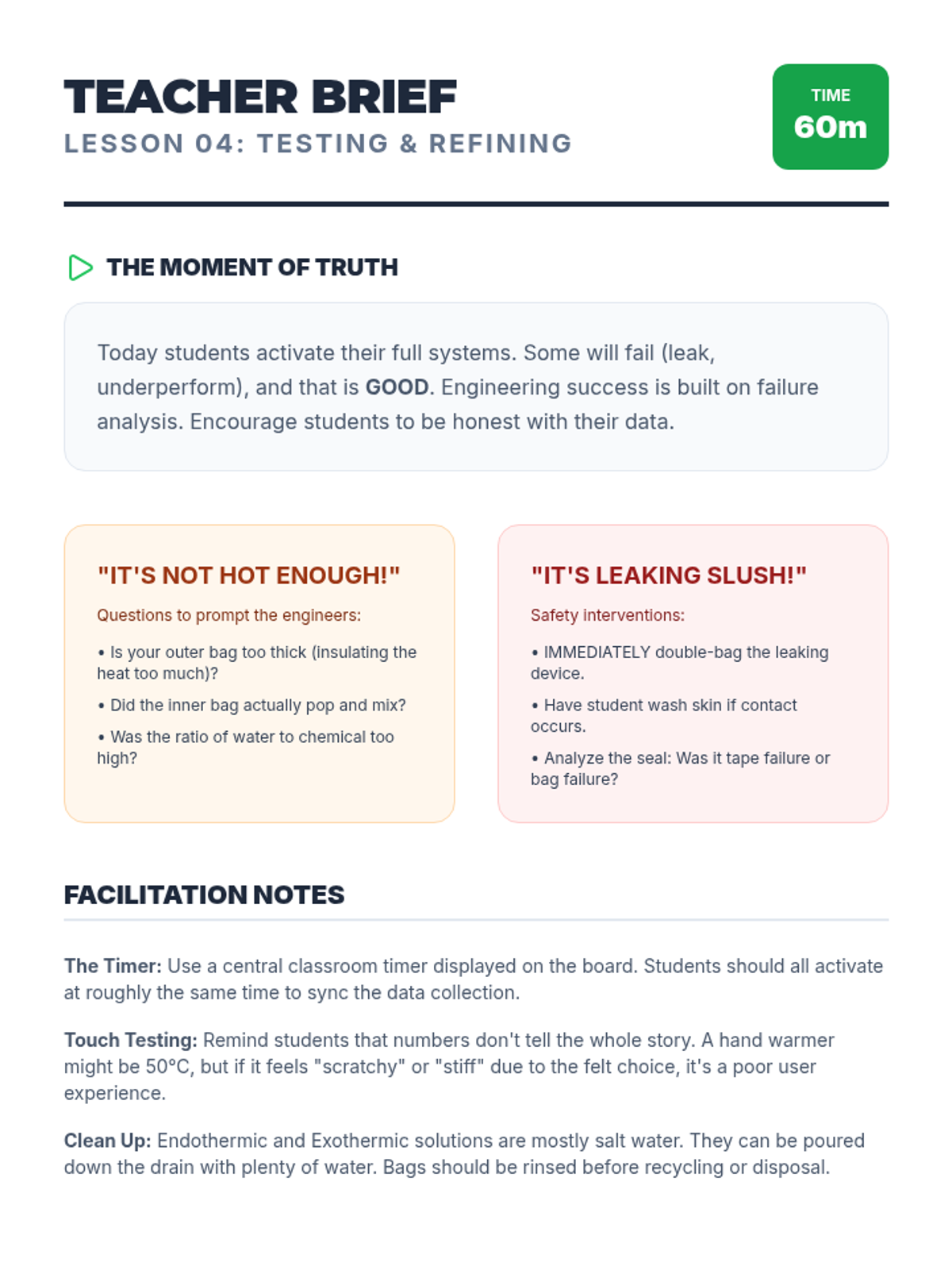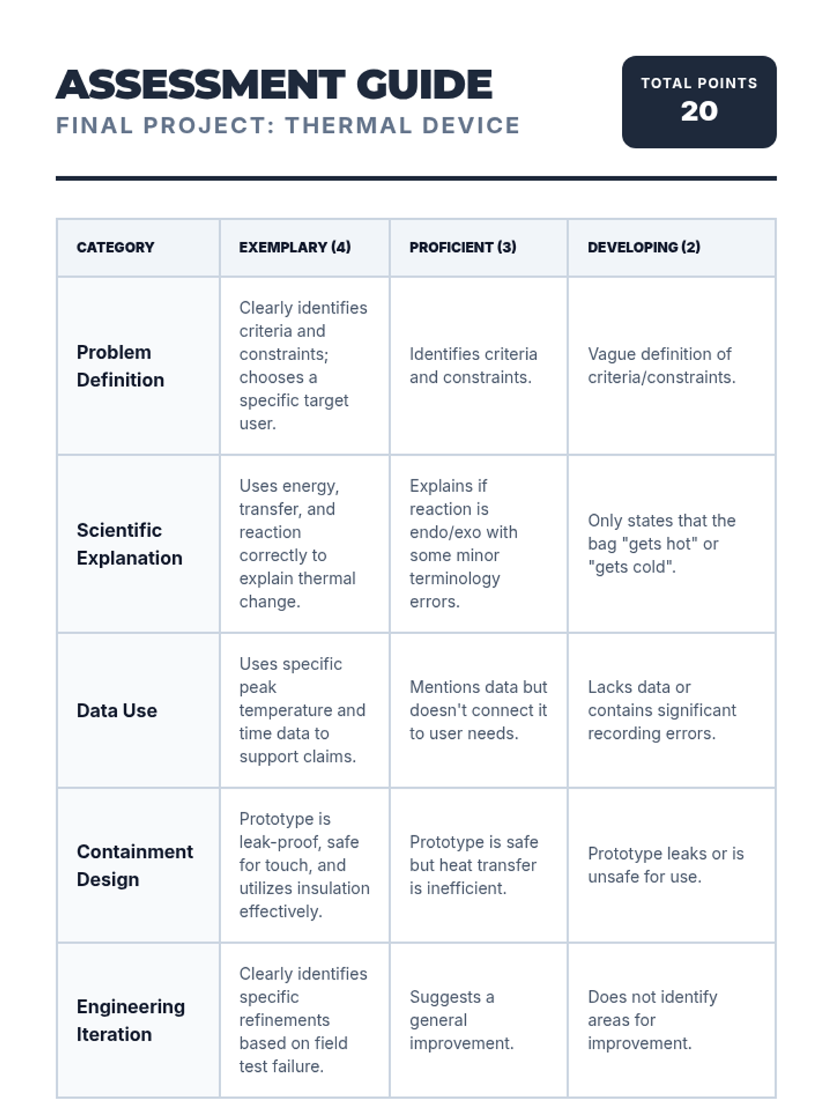 Students take on the role of chemical engineers to design, test, and refine a thermal device (hand warmer or cold pack) using exothermic and endothermic reactions. They navigate the engineering design process from problem definition to final presentation, applying scientific concepts of energy transfer to solve real-world temperature regulation challenges.