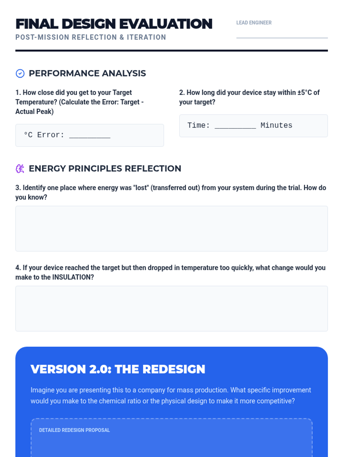 A project-based learning sequence where 6th-grade students act as chemical engineers to design a thermal management device, exploring the Law of Conservation of Energy and chemical energy changes.