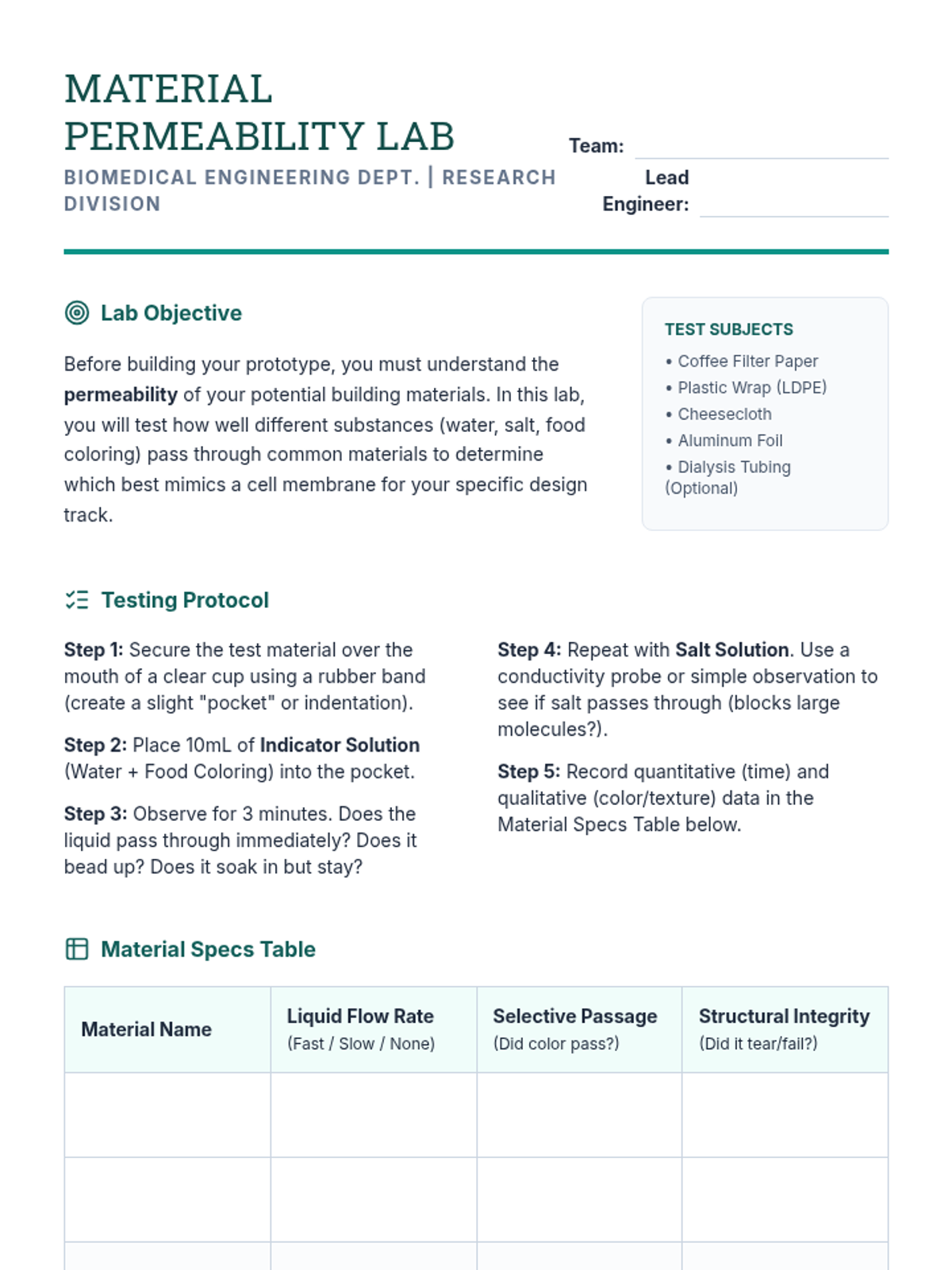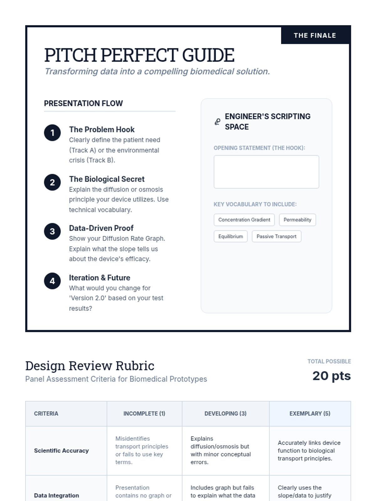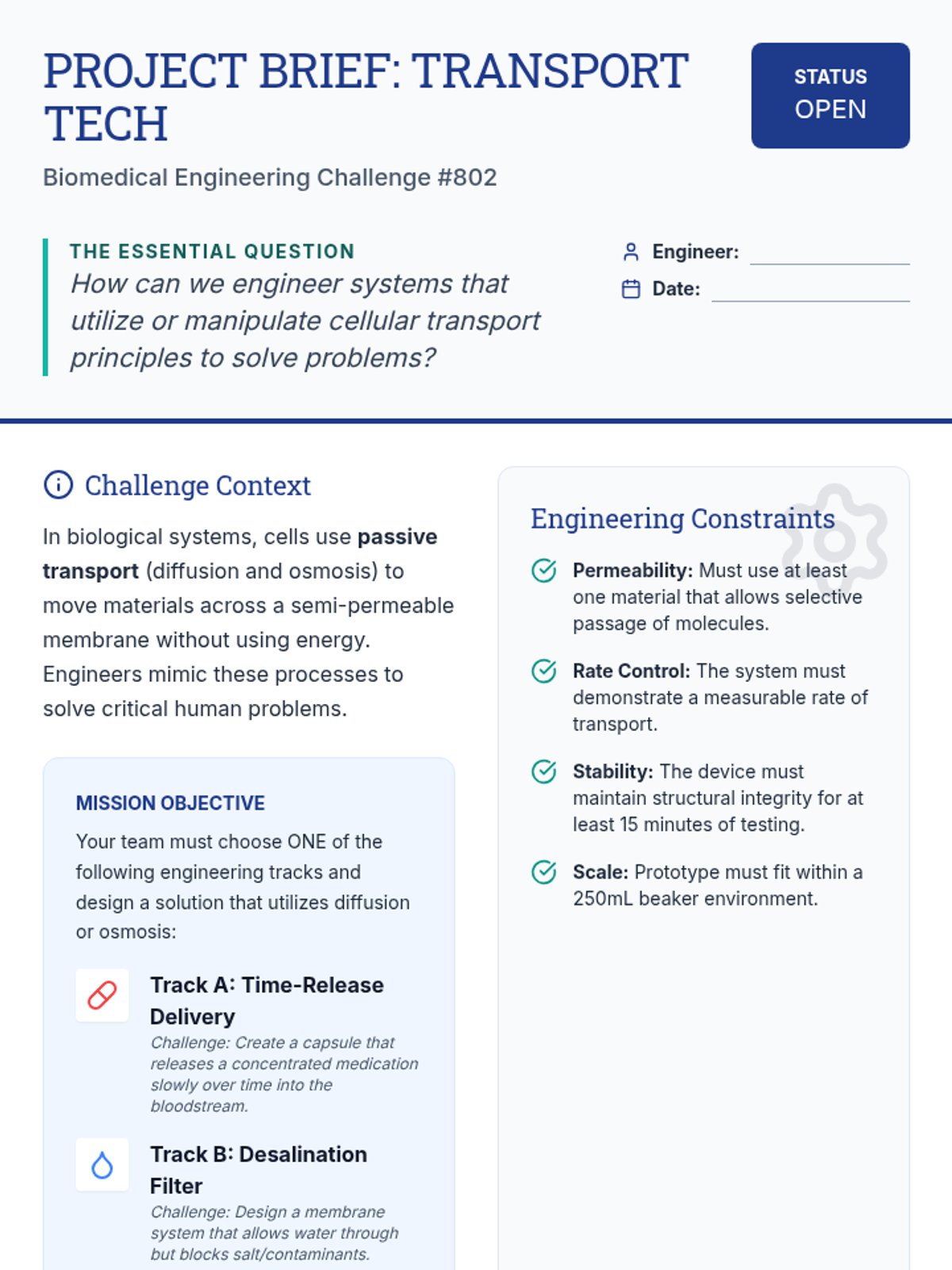 An 8th-grade project-based sequence where students apply cellular transport principles to engineer drug delivery systems and water purification solutions. Students move from research and material testing to prototyping and pitching their biomedical engineering designs.