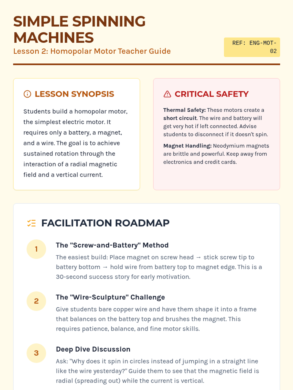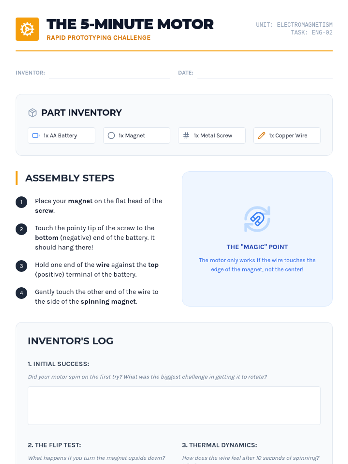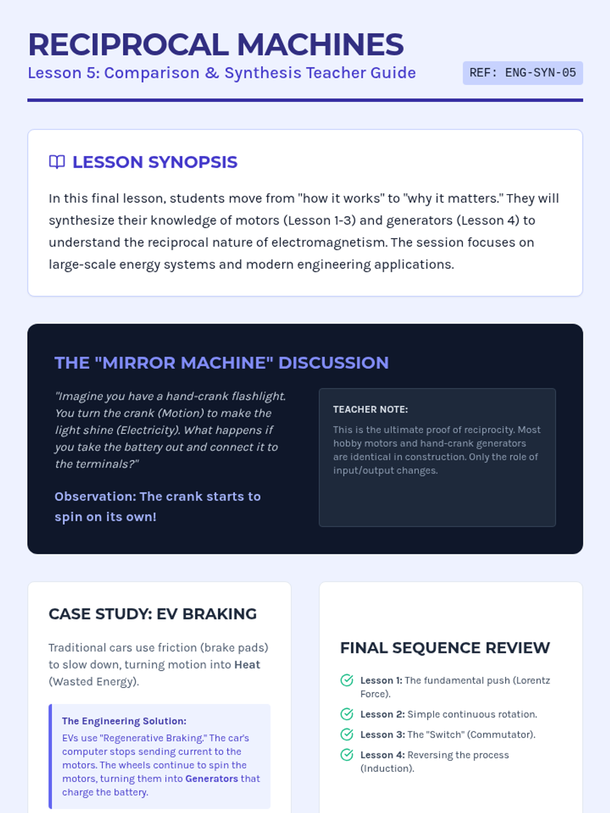 This 7th-grade engineering sequence explores the conversion between electrical and mechanical energy. Students progress from observing the Lorentz force to building simple and complex motors, eventually investigating electromagnetic induction and the reciprocal relationship between motors and generators.
