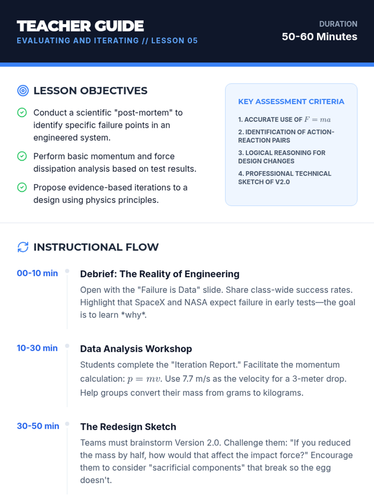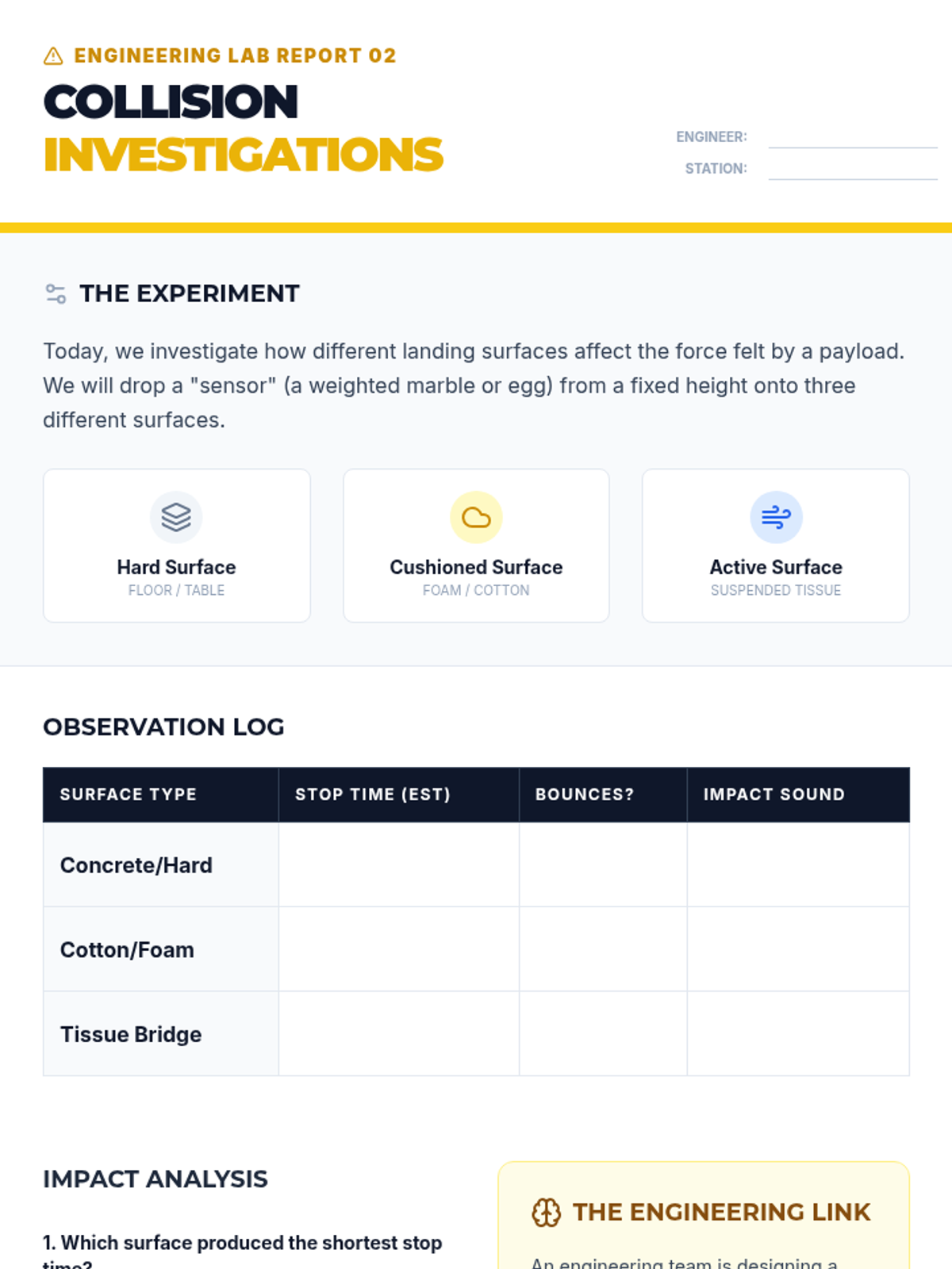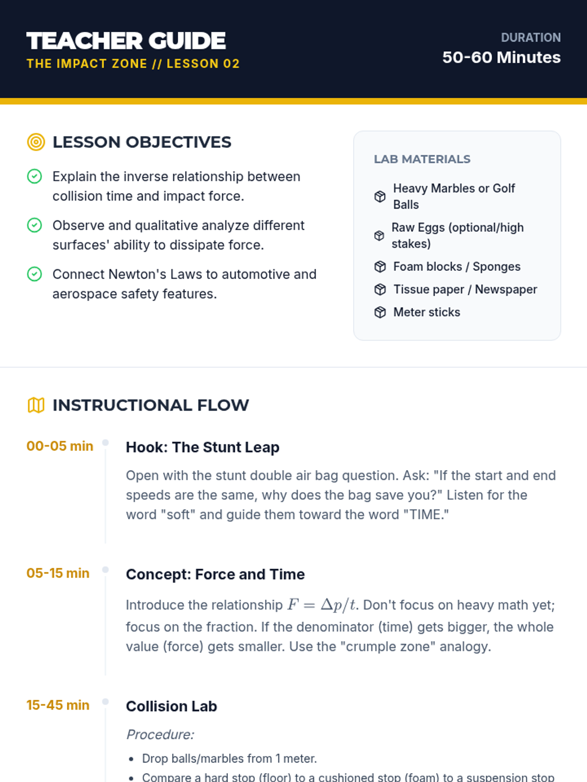 A project-based physics sequence exploring Newton's Third Law and collision forces through the lens of engineering. Students move from conceptualizing action-reaction pairs to designing, testing, and iterating safety devices to protect a payload during impact.