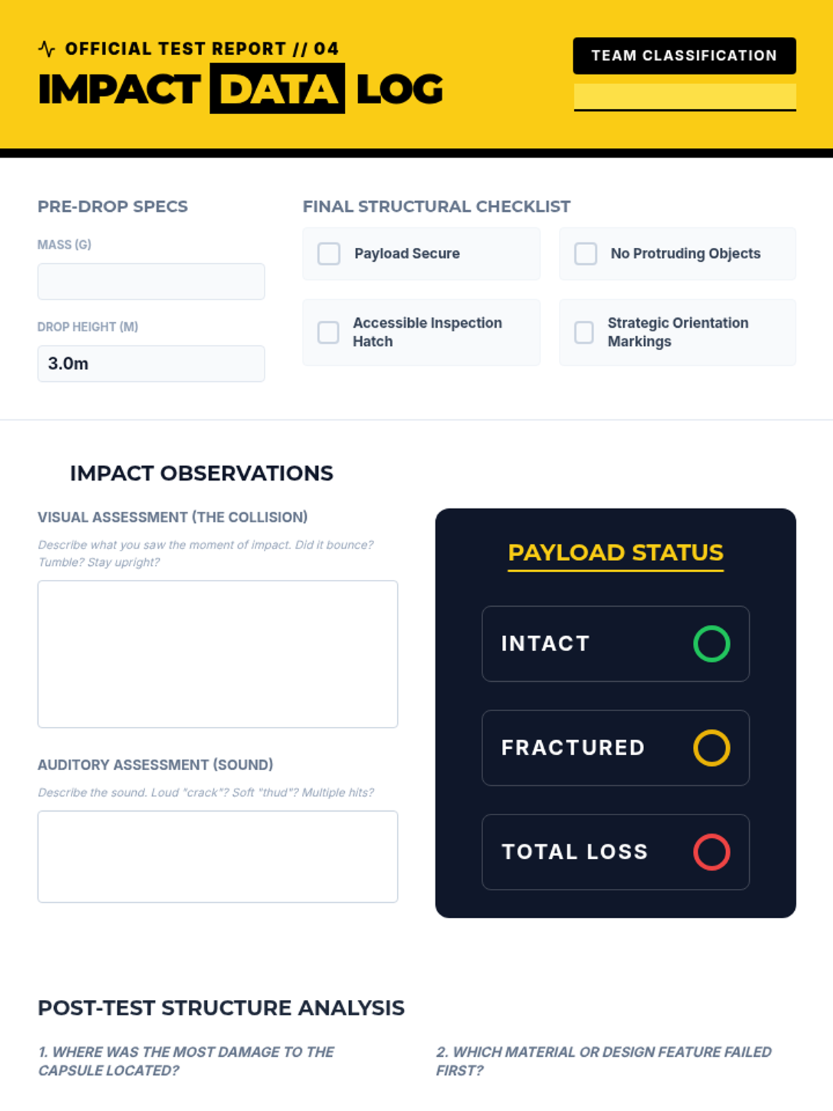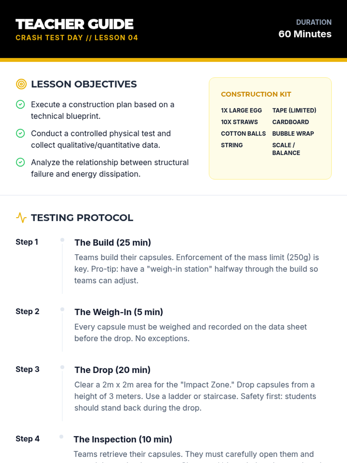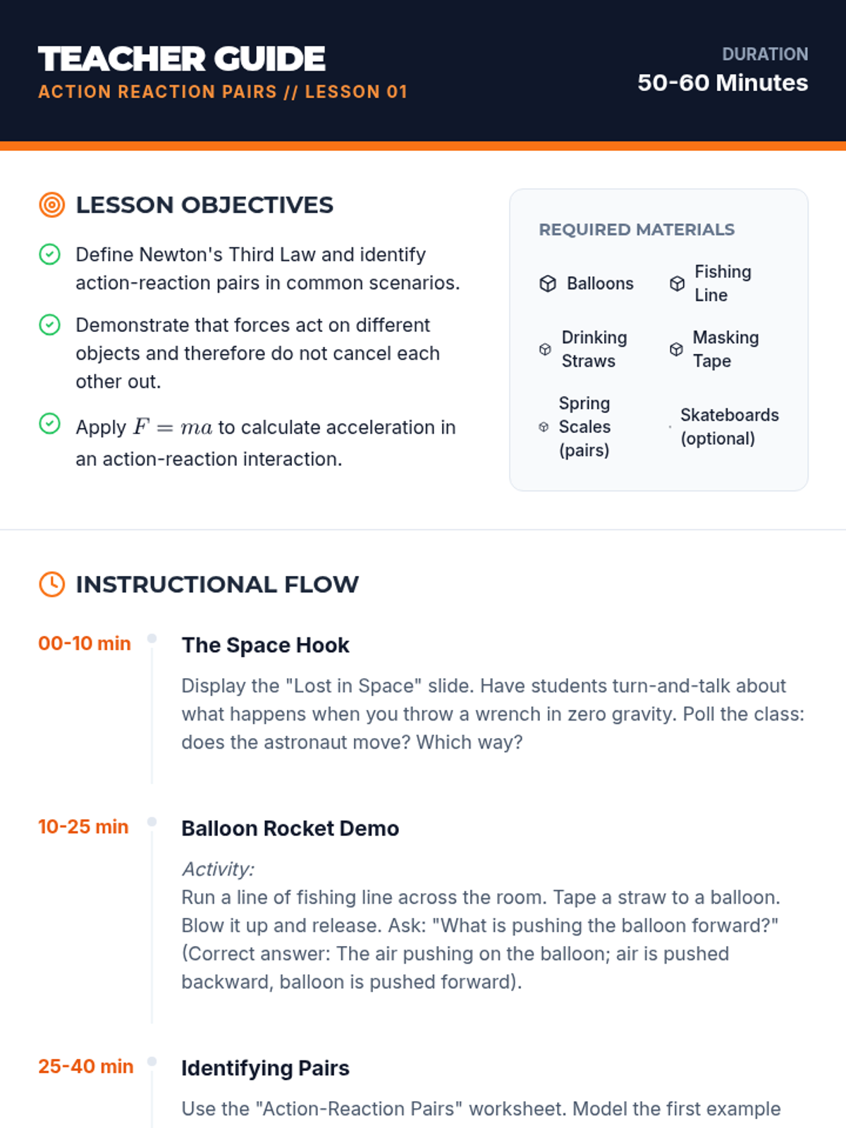 A project-based physics sequence exploring Newton's Third Law and collision forces through the lens of engineering. Students move from conceptualizing action-reaction pairs to designing, testing, and iterating safety devices to protect a payload during impact.