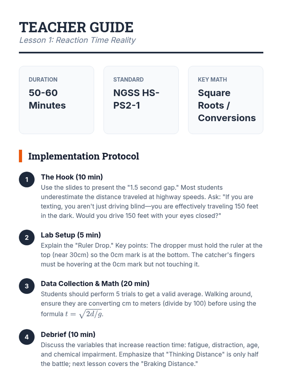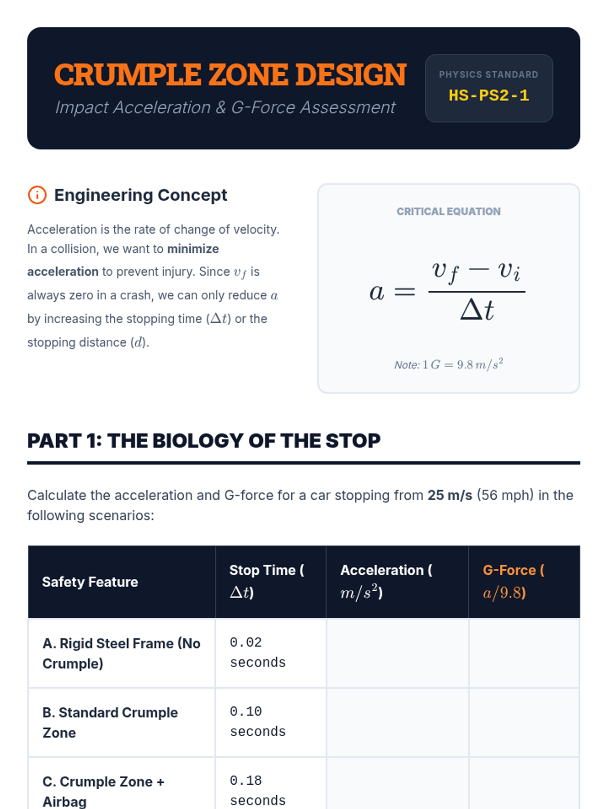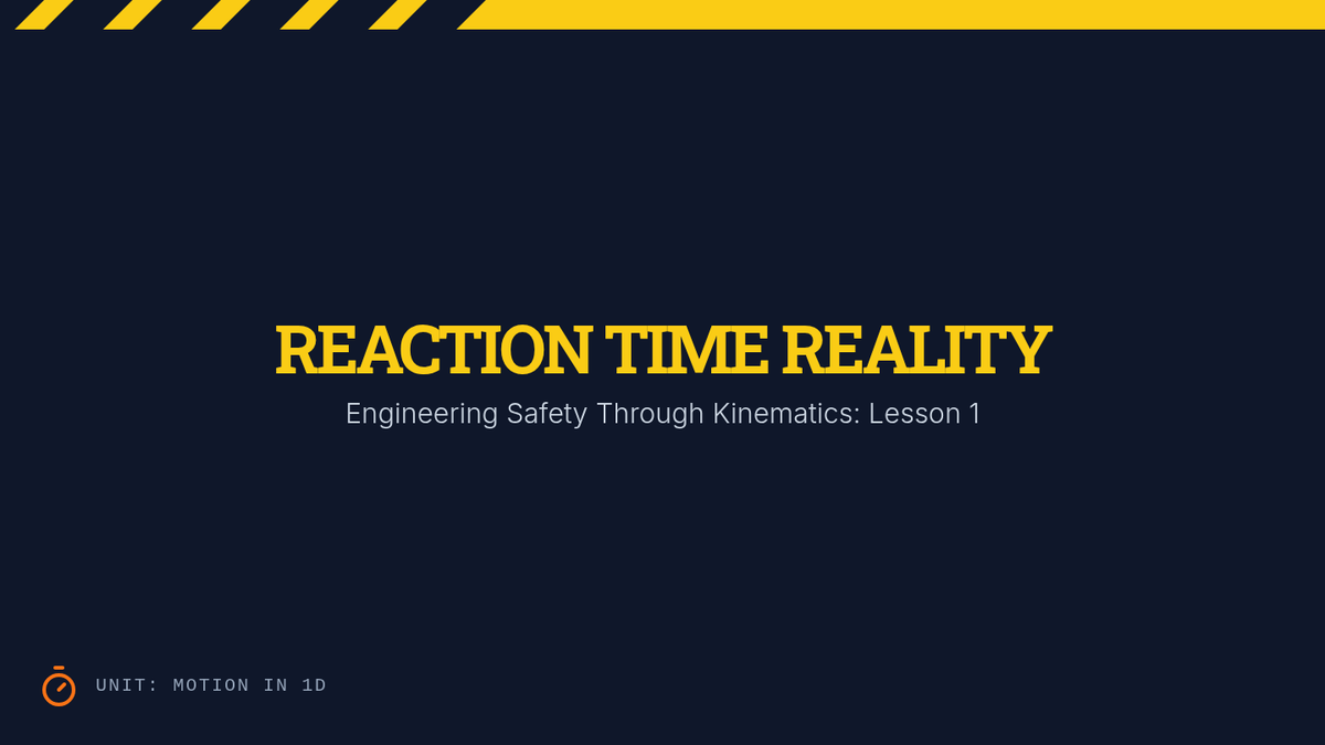 A 9th-grade physics sequence connecting one-dimensional kinematics to vehicle safety engineering. Students explore reaction time, braking distances, crash forensics, and safety feature design to answer how physics can improve road safety.