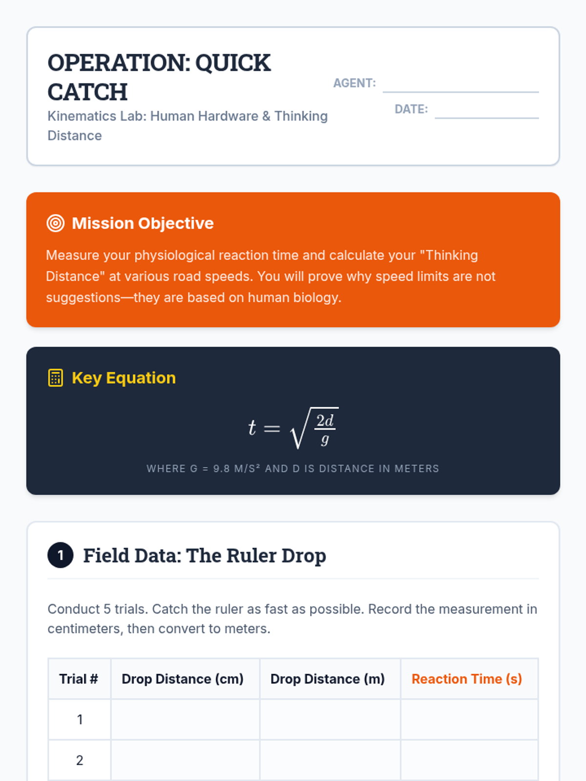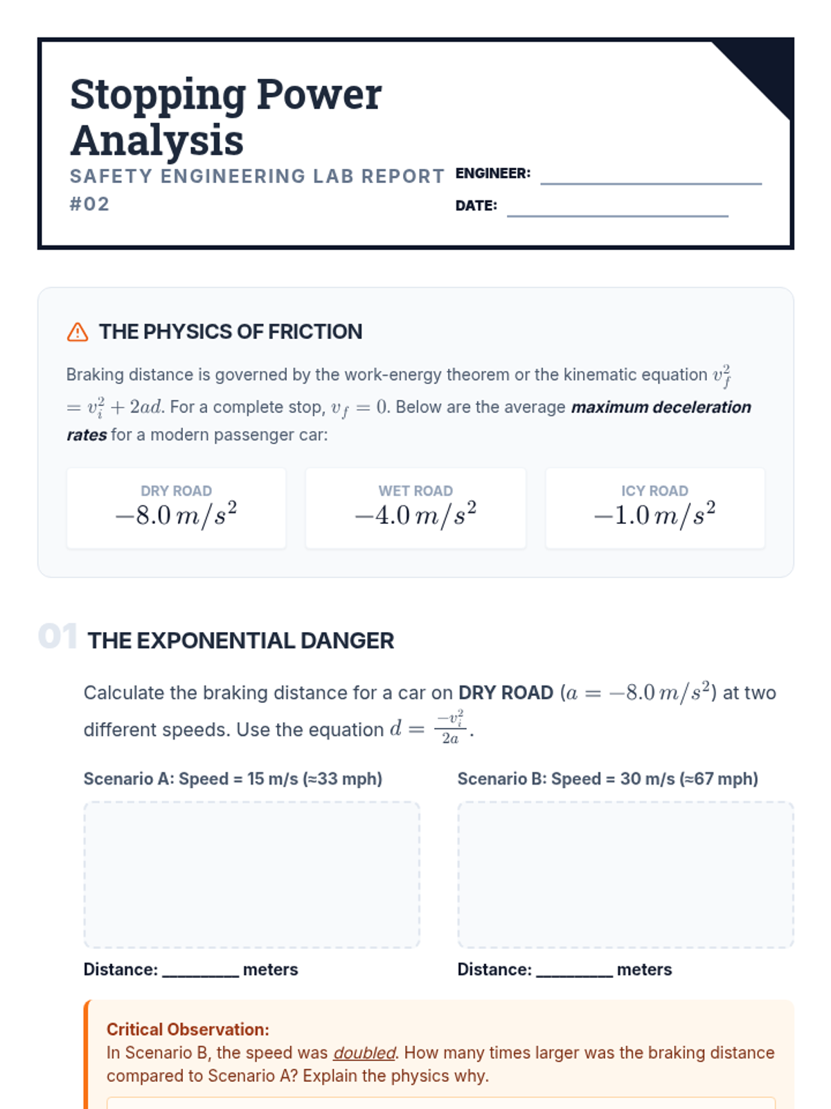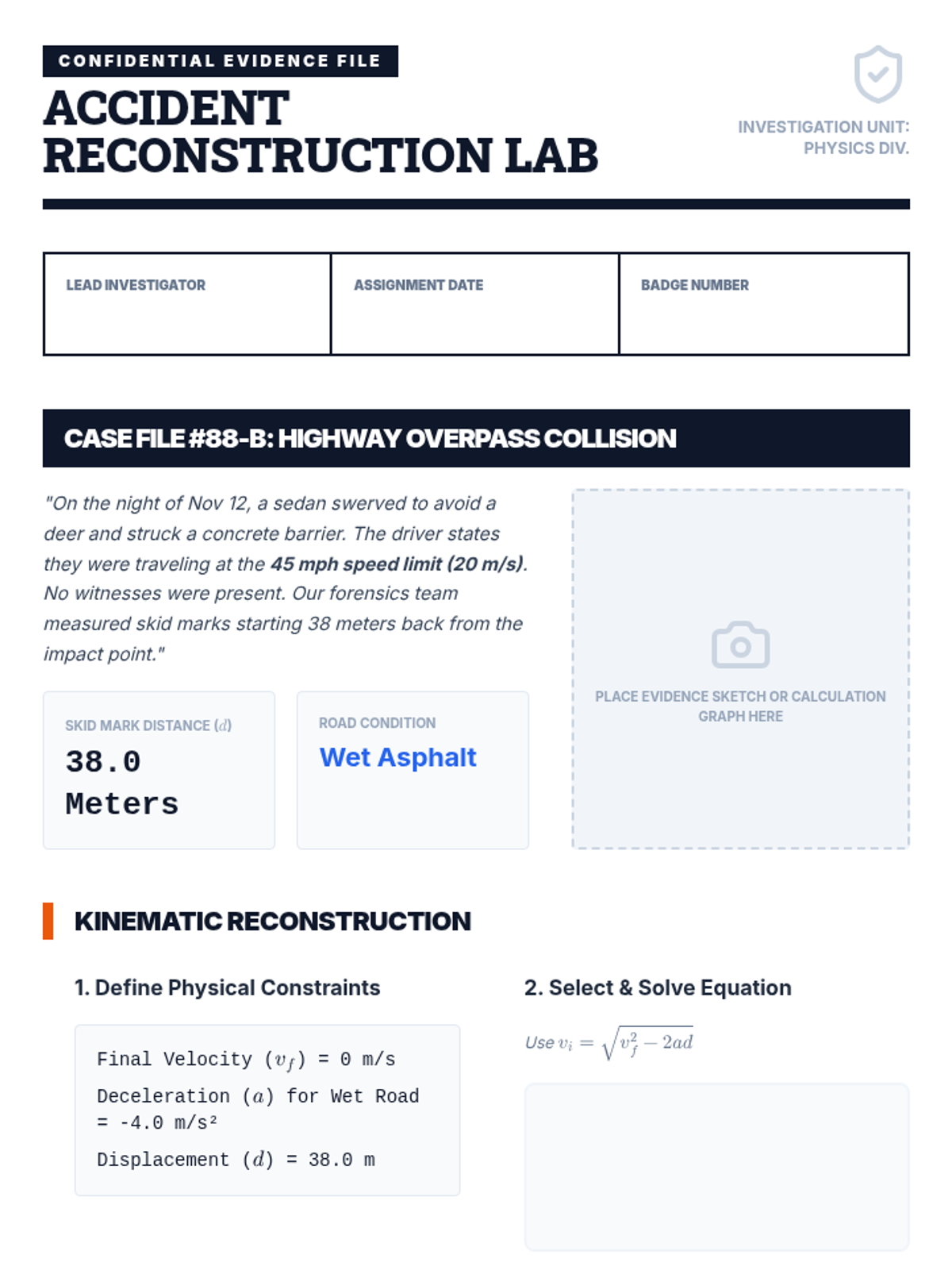 A 9th-grade physics sequence connecting one-dimensional kinematics to vehicle safety engineering. Students explore reaction time, braking distances, crash forensics, and safety feature design to answer how physics can improve road safety.