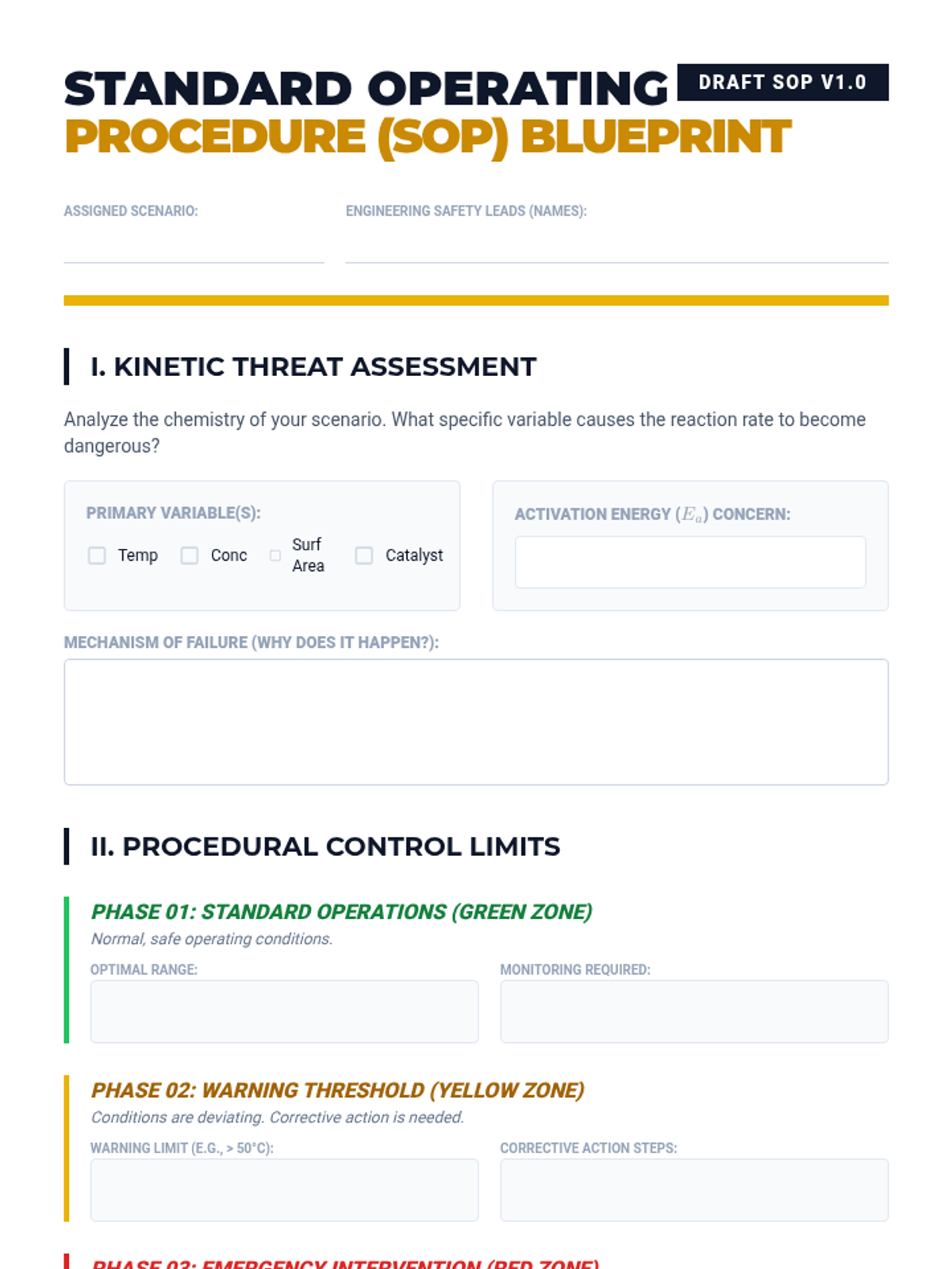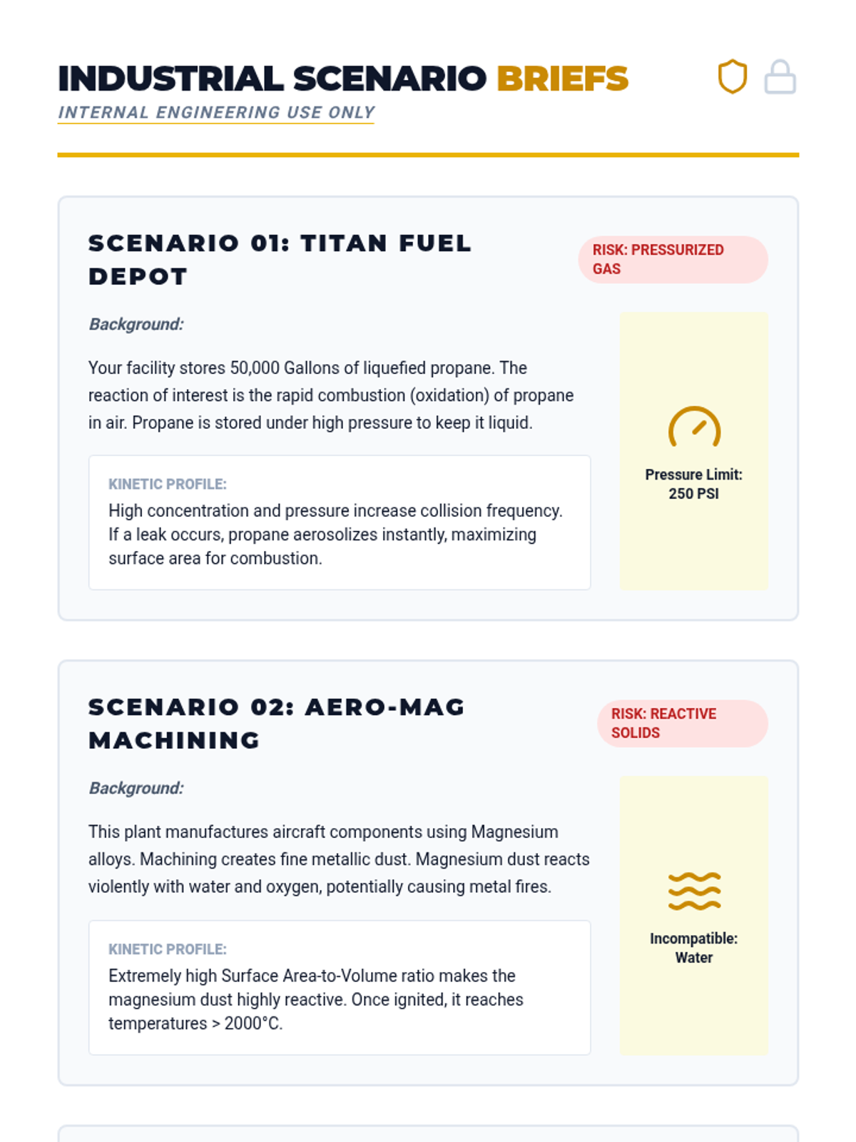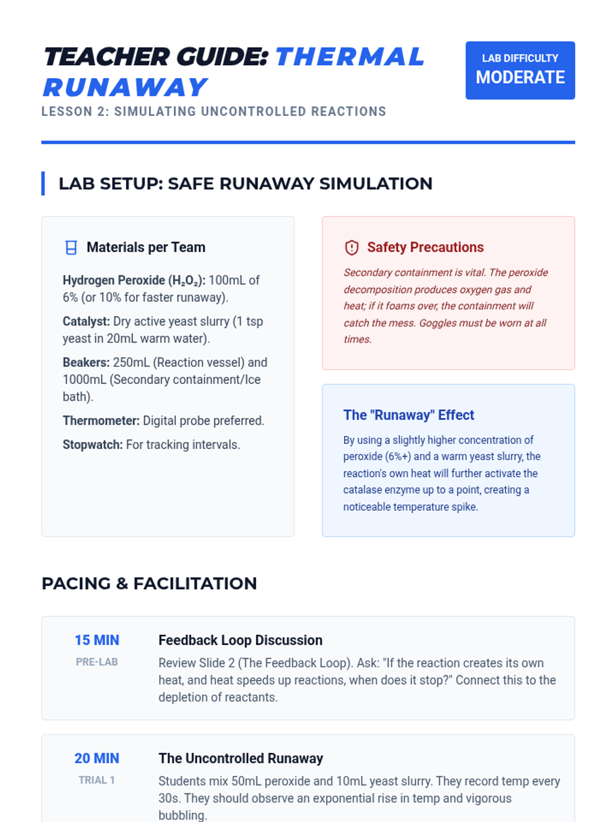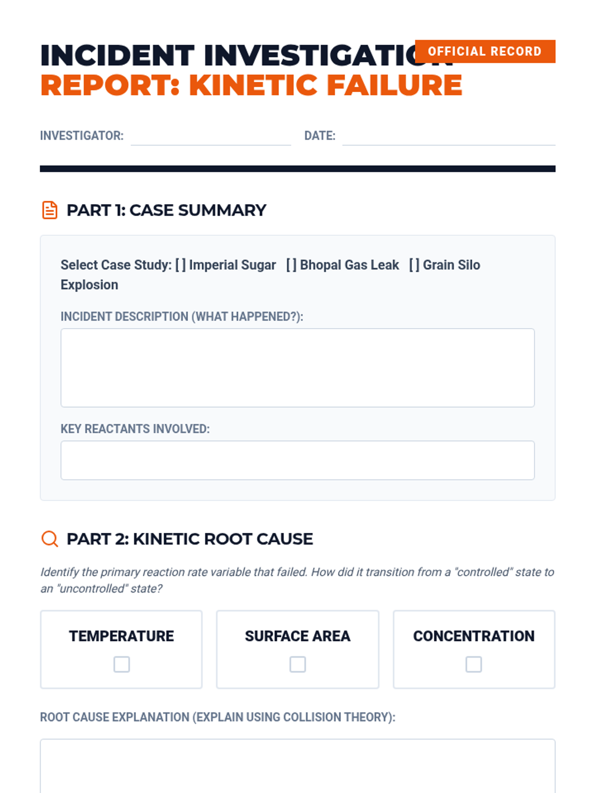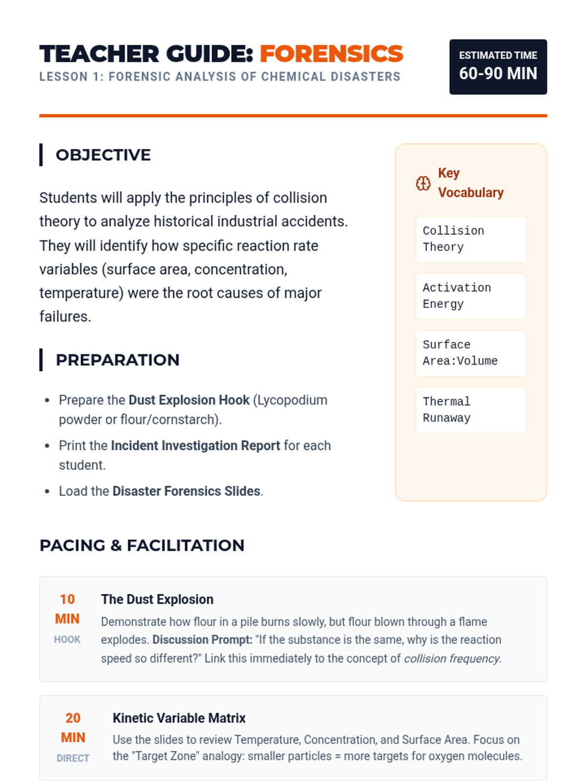 A 12th-grade chemistry sequence exploring reaction kinetics through the lens of industrial safety and engineering. Students analyze historical disasters, simulate runaway reactions, and design safety protocols using collision theory and process control principles.