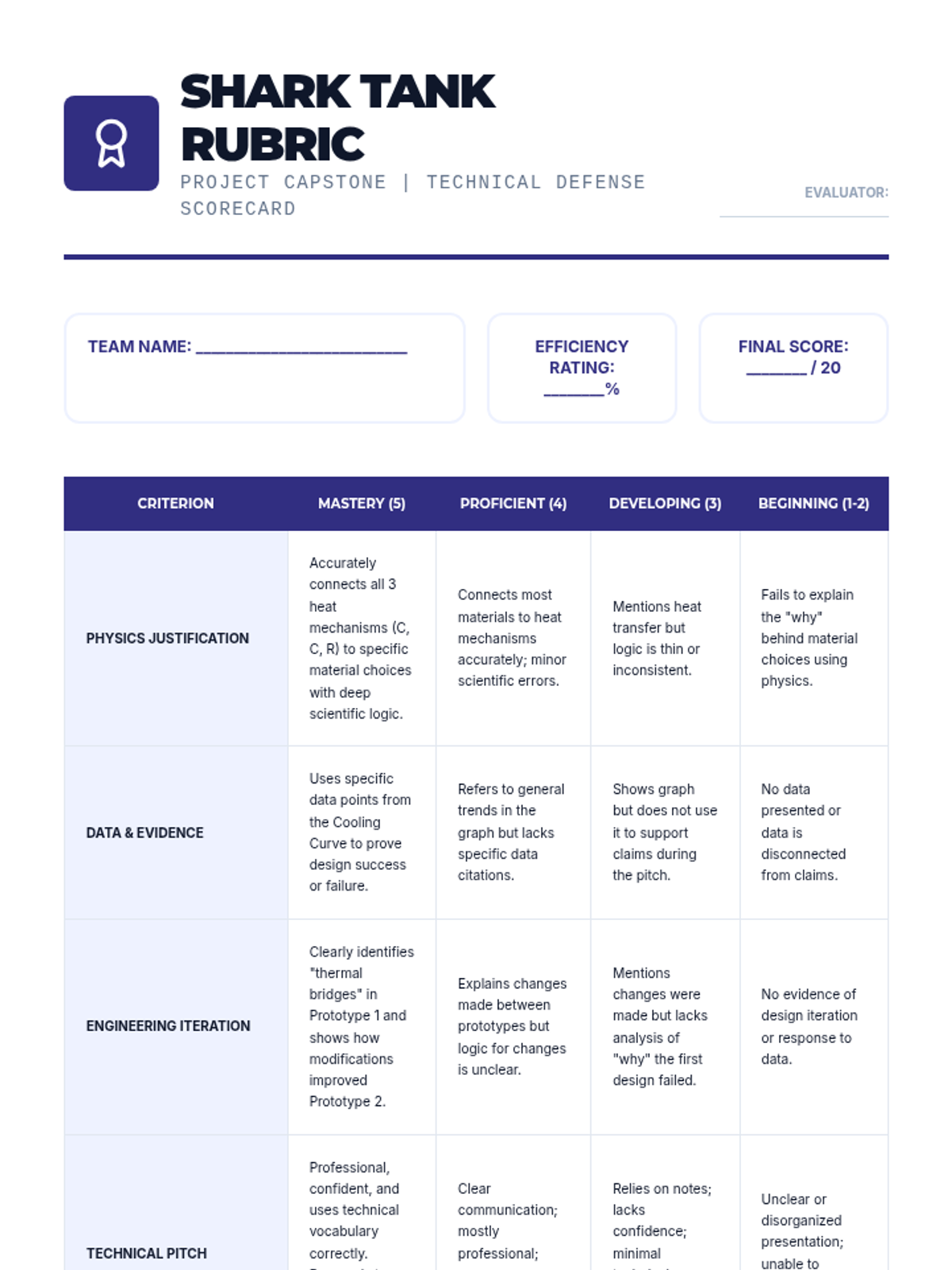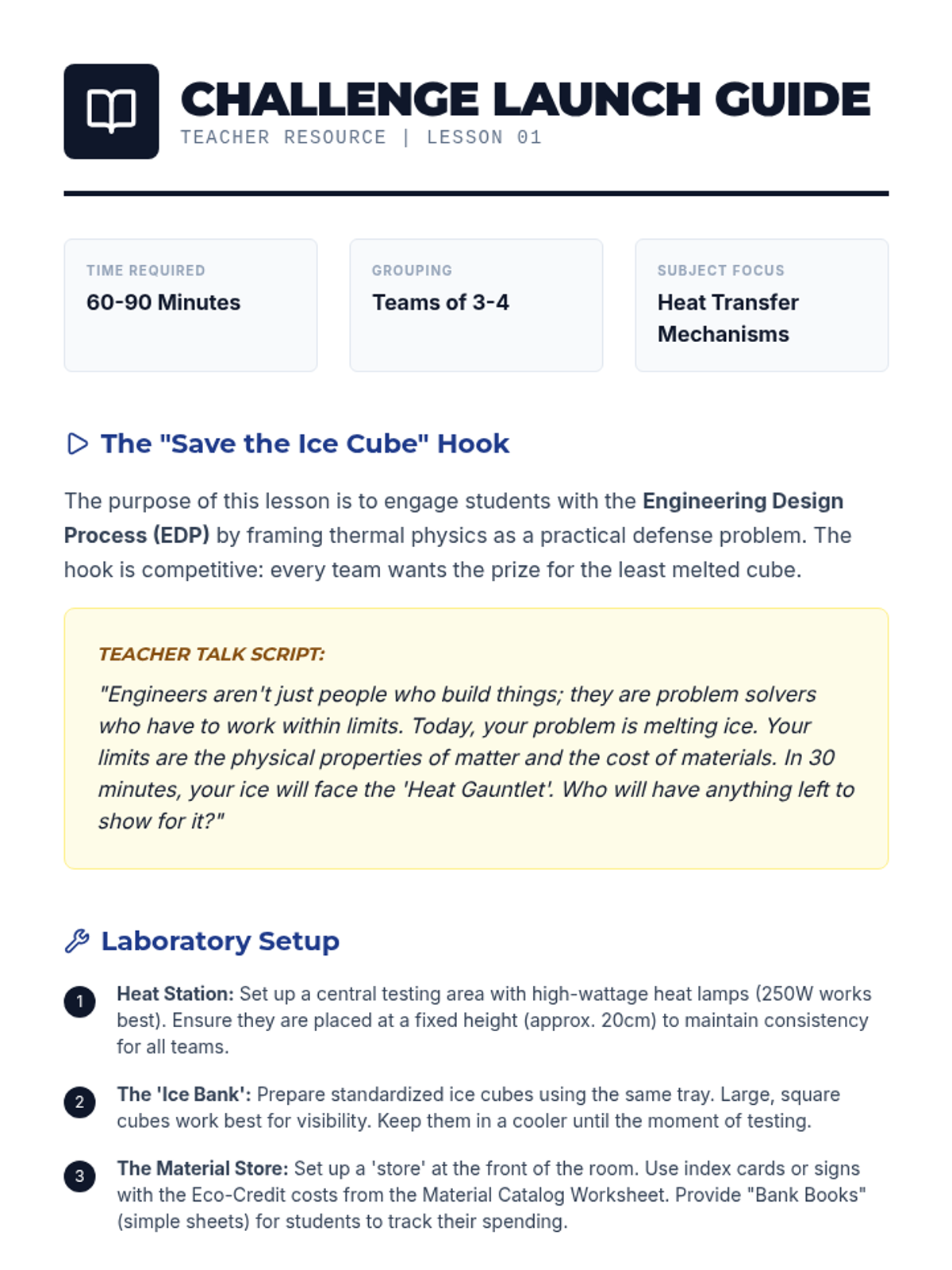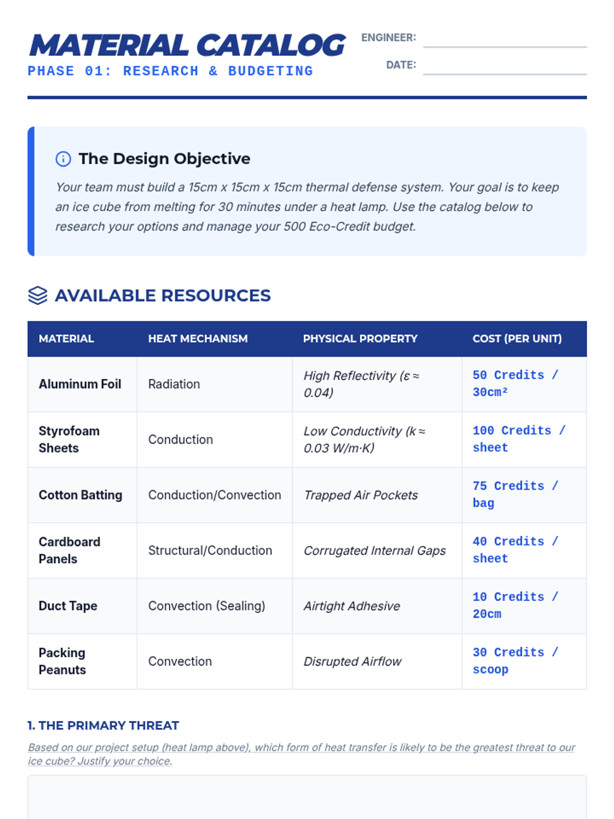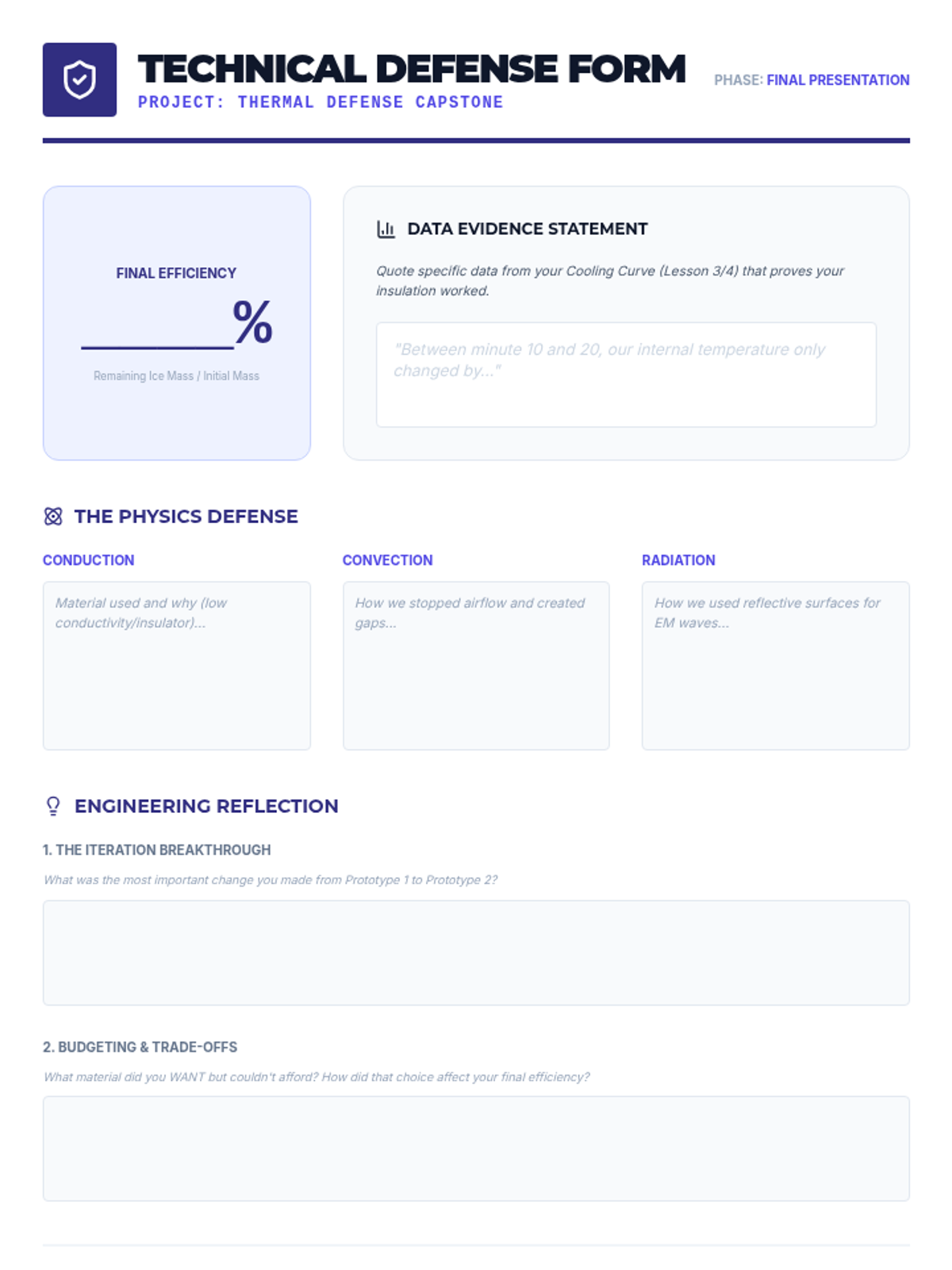 A capstone engineering project where 9th-grade students apply thermodynamic principles to design, build, and test a thermal insulation device. Students use the engineering design process to minimize heat transfer through conduction, convection, and radiation.