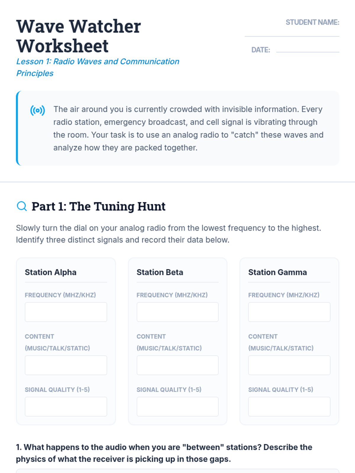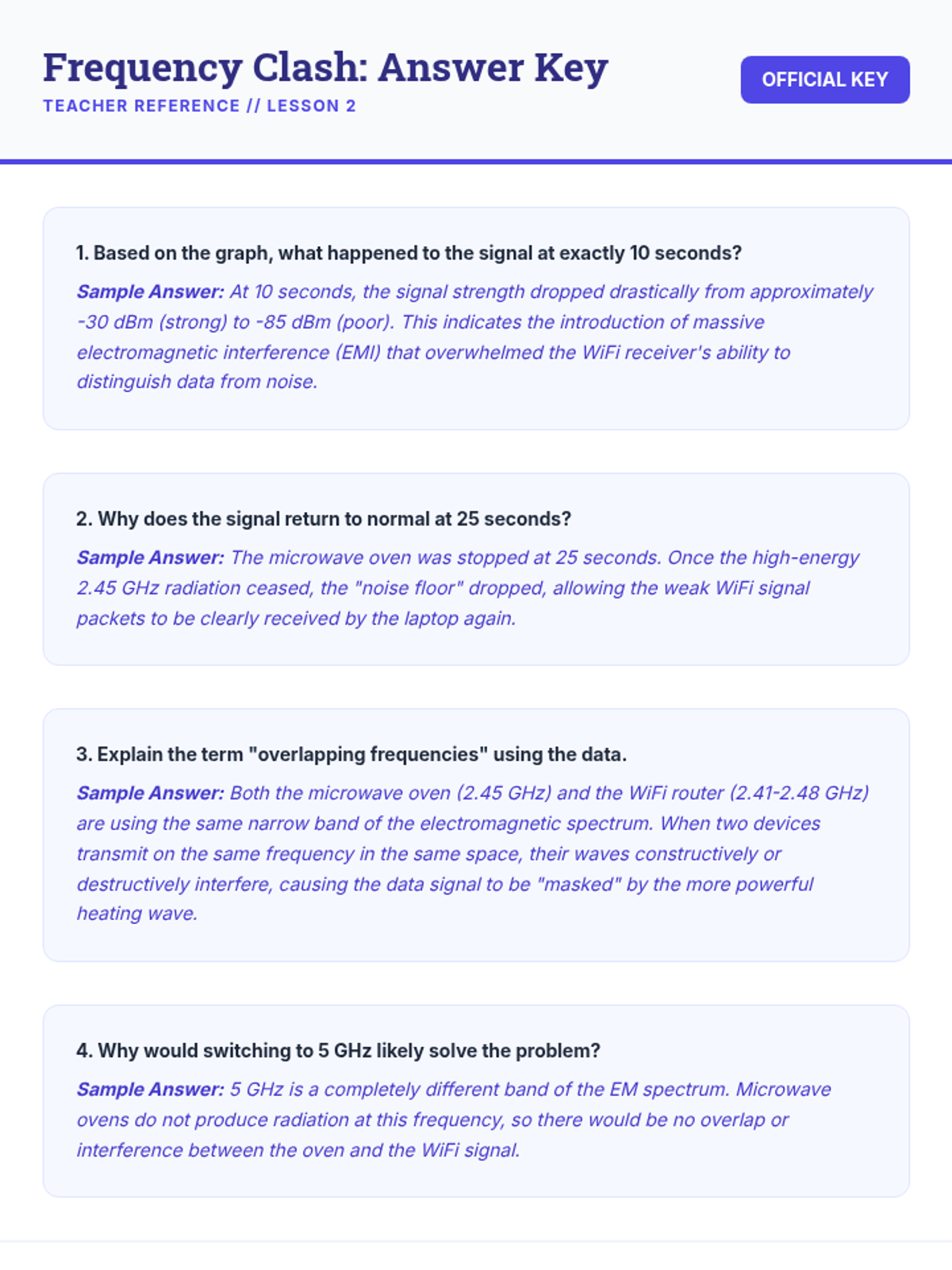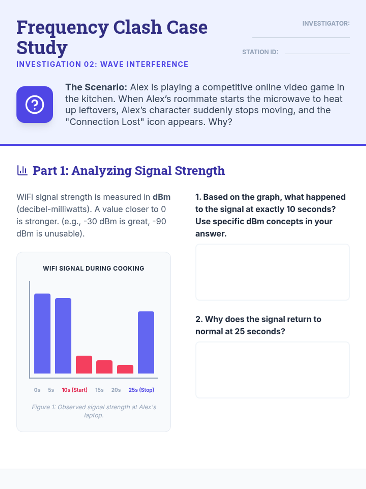 Students engage in an engineering design challenge focused on radio waves and microwaves, applying theoretical knowledge to solve real-world connectivity and interference problems. The sequence culminates in the design and testing of a Faraday cage to block cellular signals.