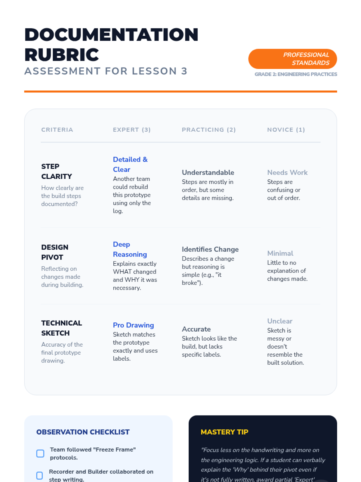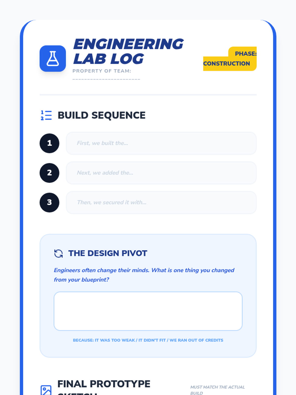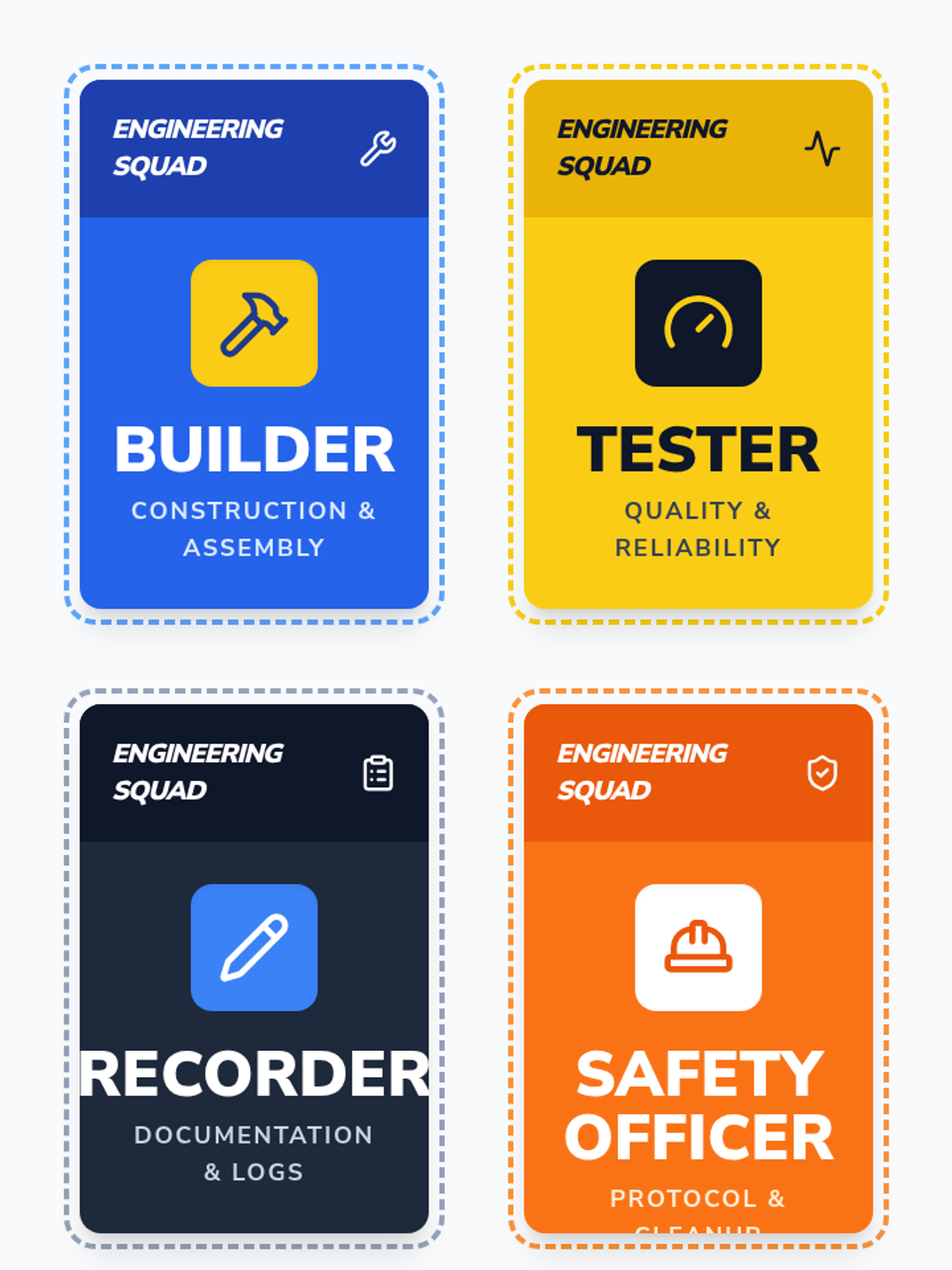 A 2nd-grade engineering capstone sequence where students move through the full professional lifecycle: role assignment, design planning, construction with documentation, reliability testing, and a final showcase.