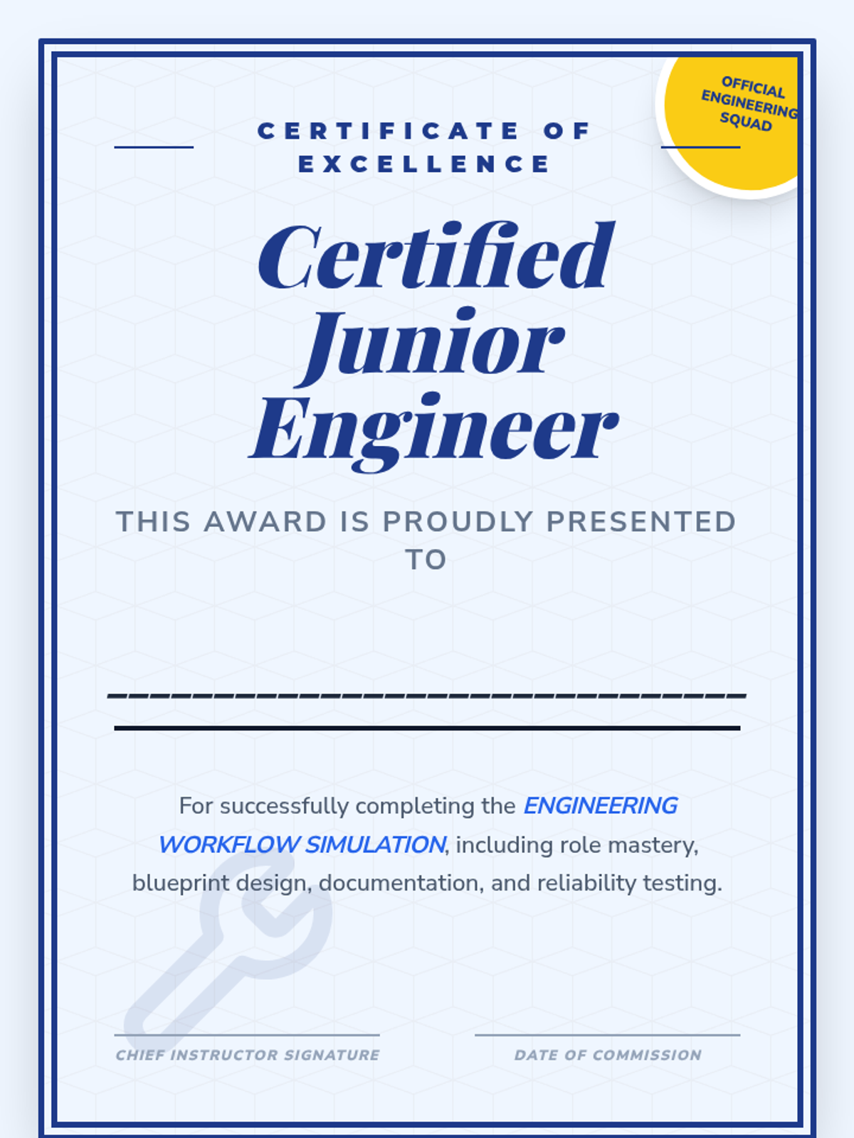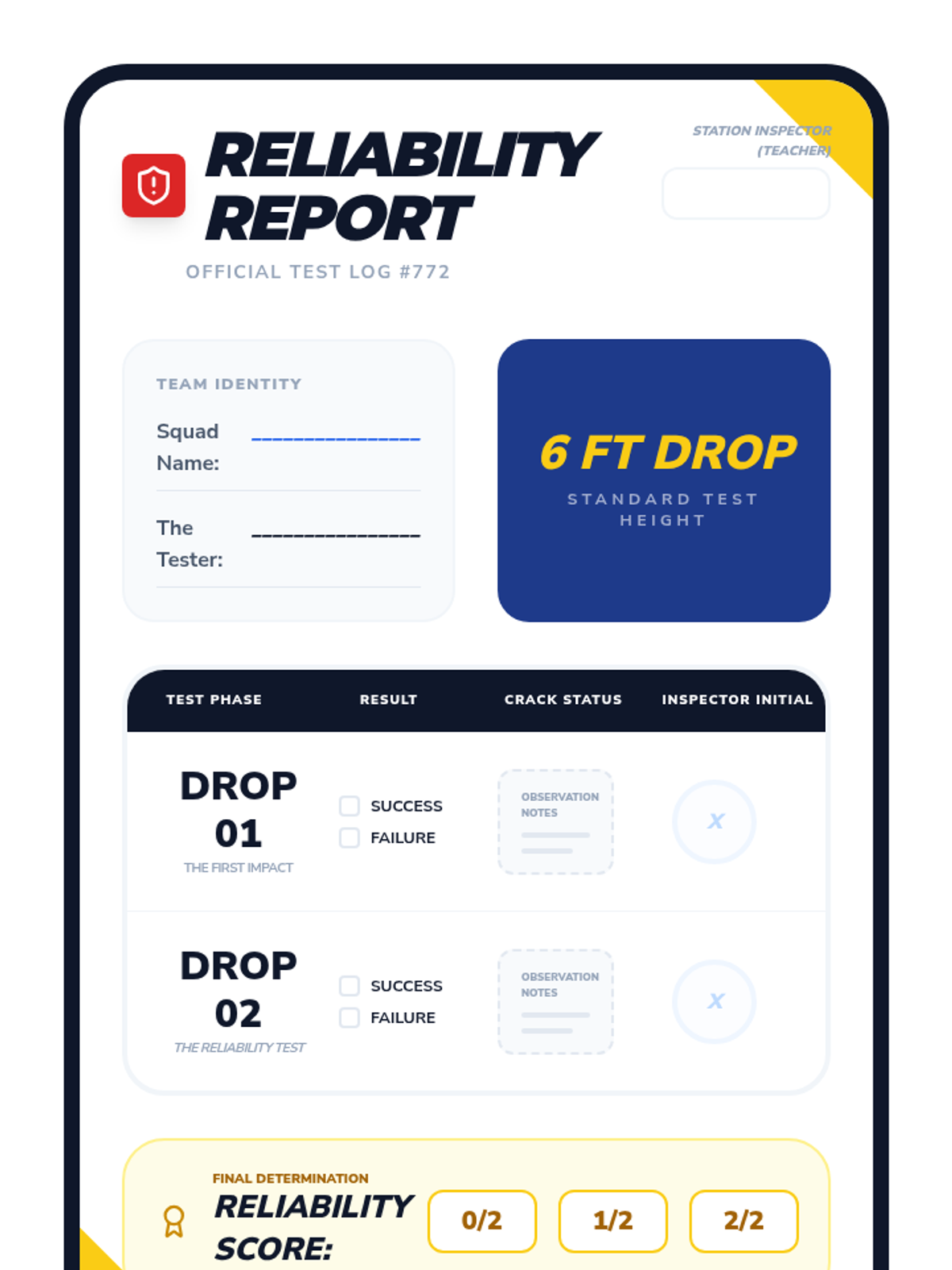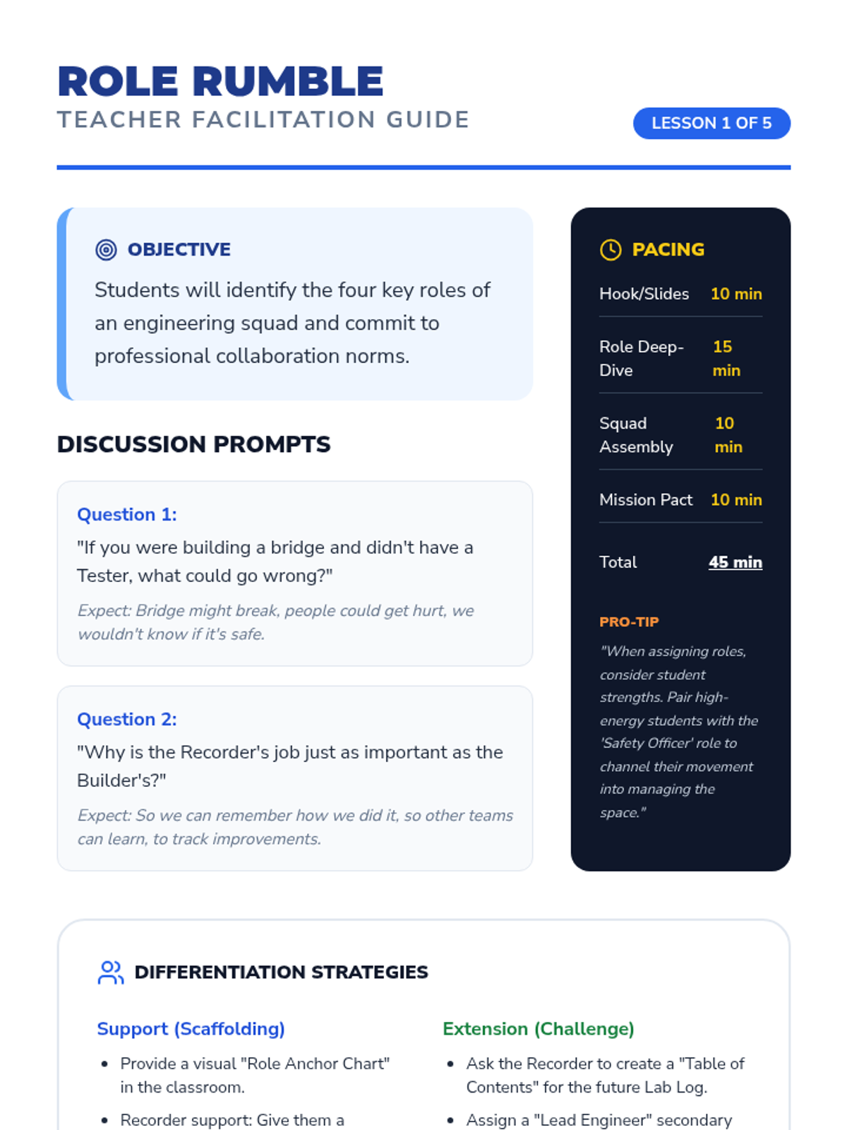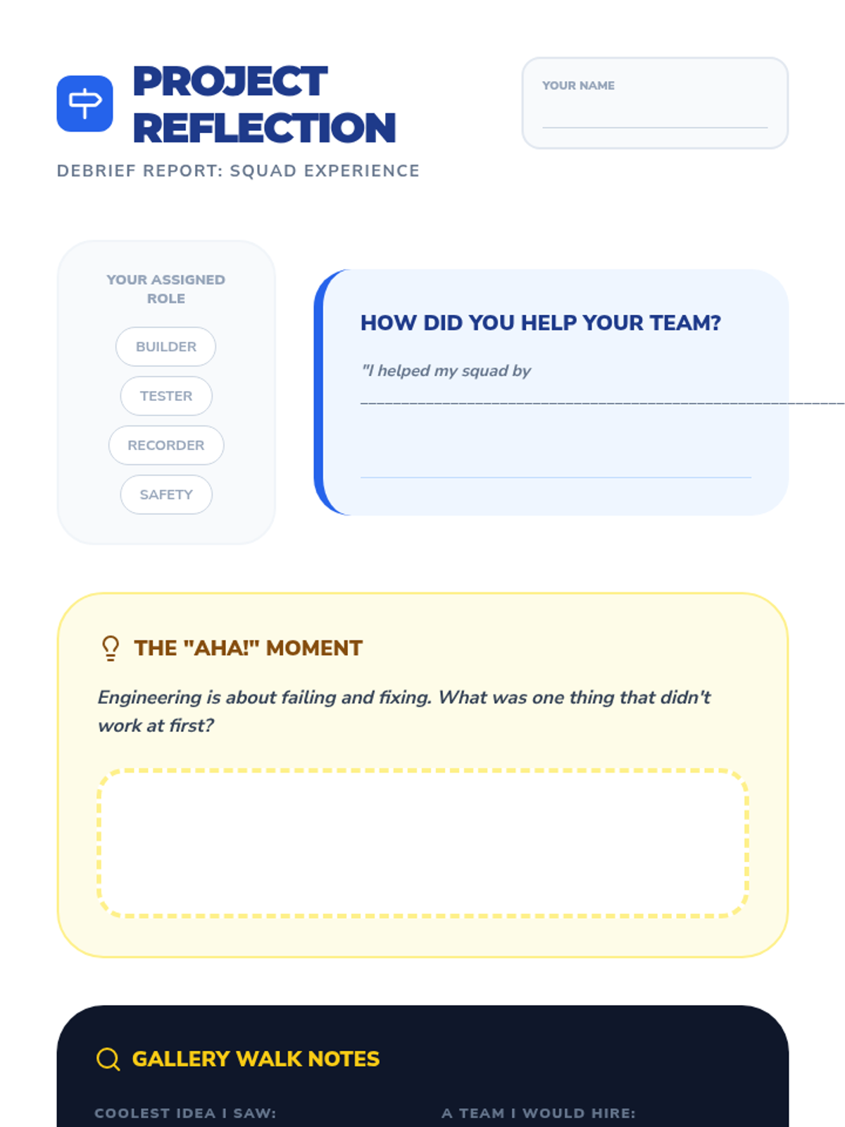 A 2nd-grade engineering capstone sequence where students move through the full professional lifecycle: role assignment, design planning, construction with documentation, reliability testing, and a final showcase.