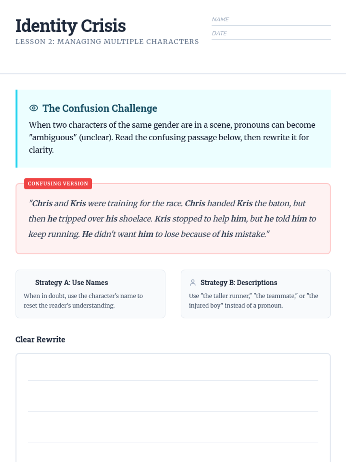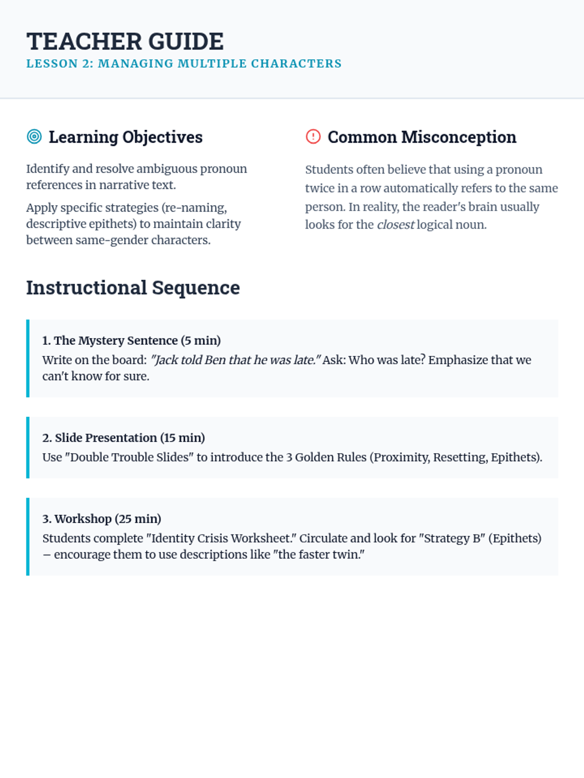 This 8th-grade ELA sequence transforms grammar instruction into a narrative workshop. Students explore how pronouns function as essential tools for flow and clarity, moving from basic antecedent agreement to sophisticated point-of-view manipulation and peer editing for narrative precision.