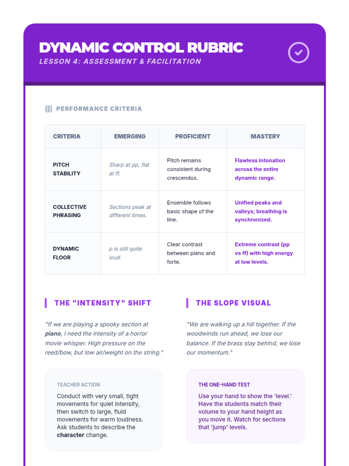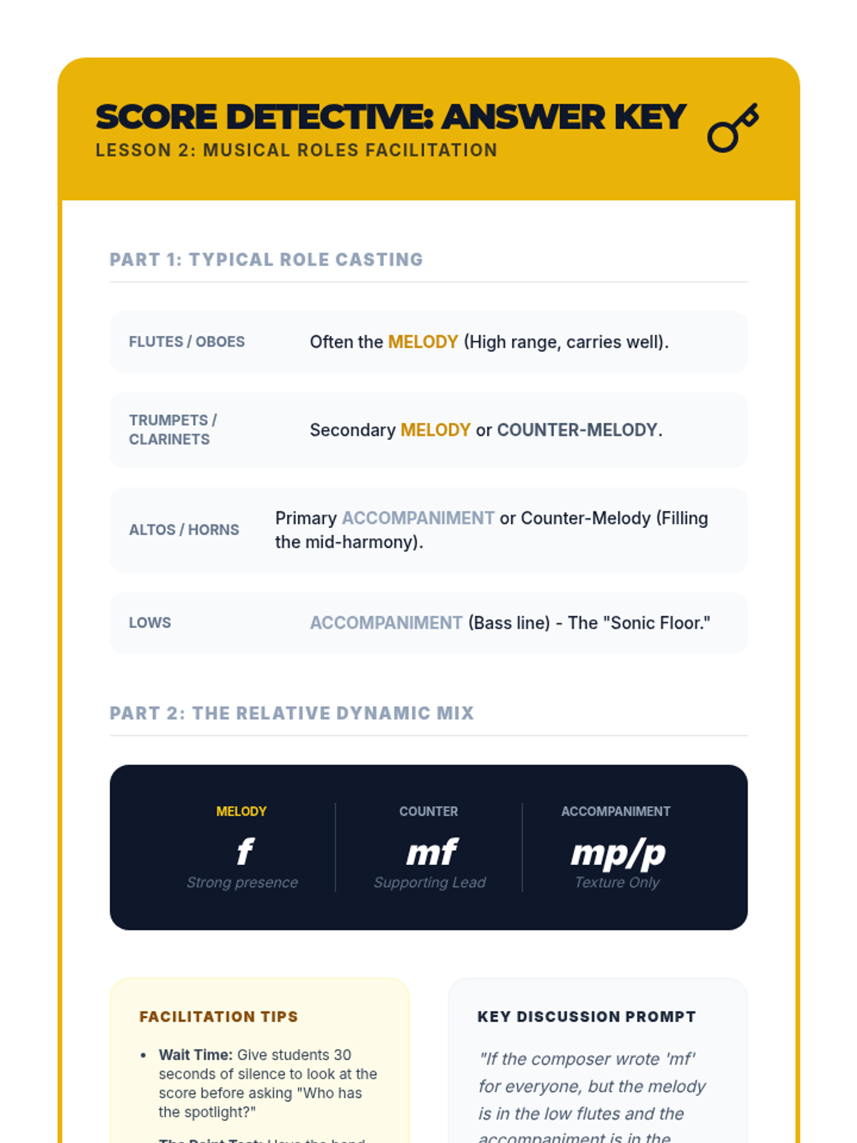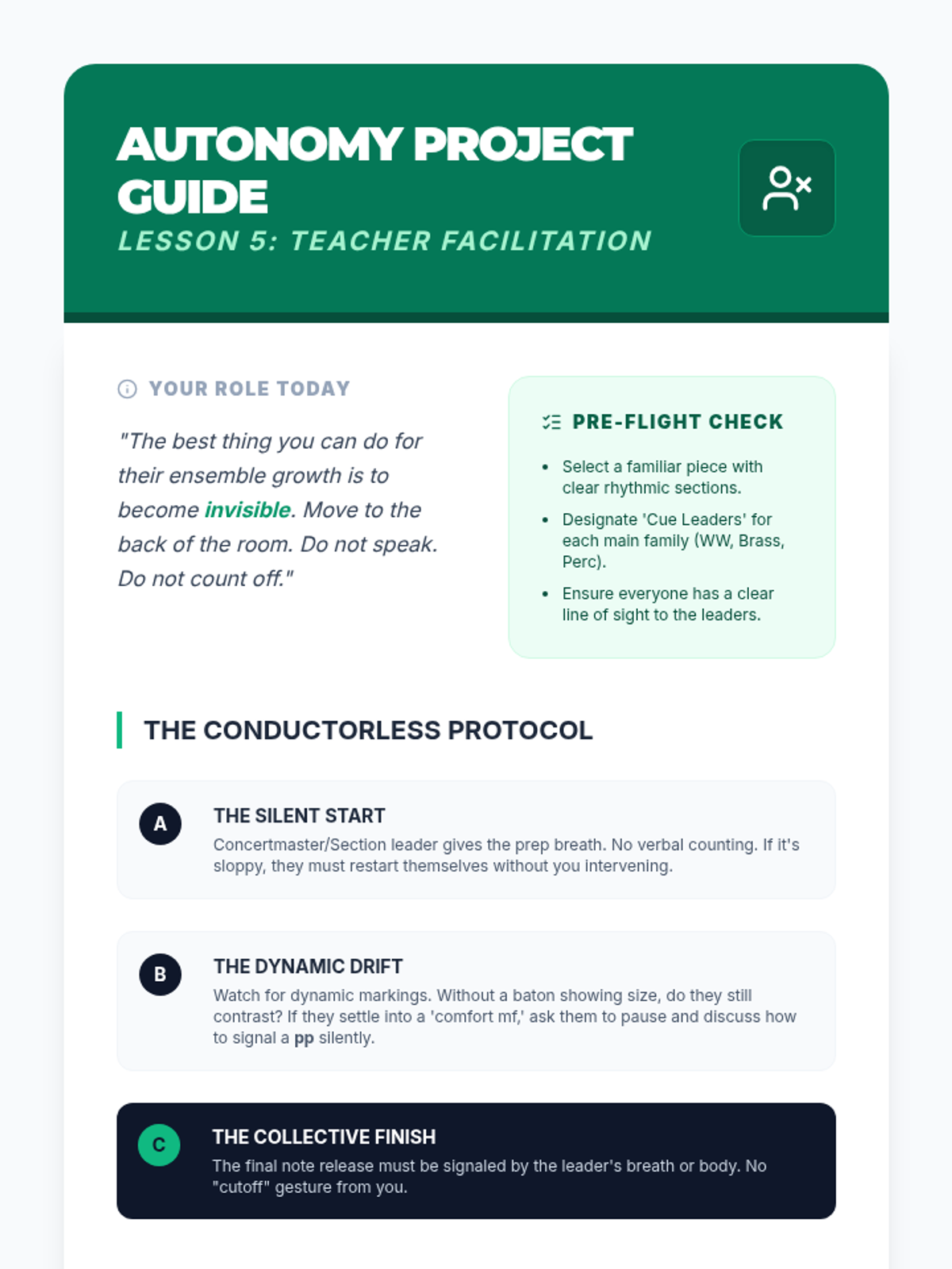 A comprehensive unit for middle school band and orchestra students focusing on ensemble hierarchy, the 'Pyramid of Sound,' role identification, and collective musicality. Students move from basic balance concepts to advanced conductorless rehearsal techniques.