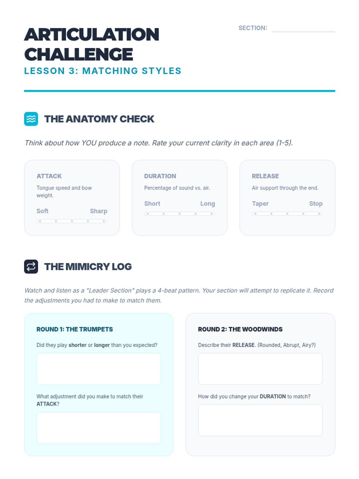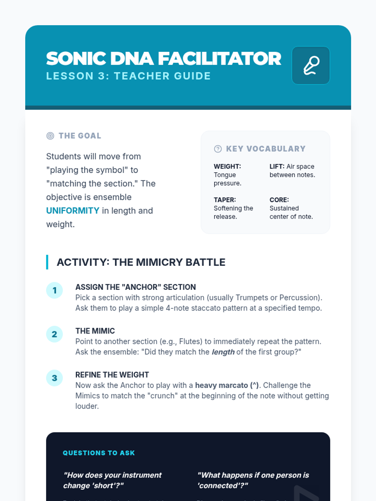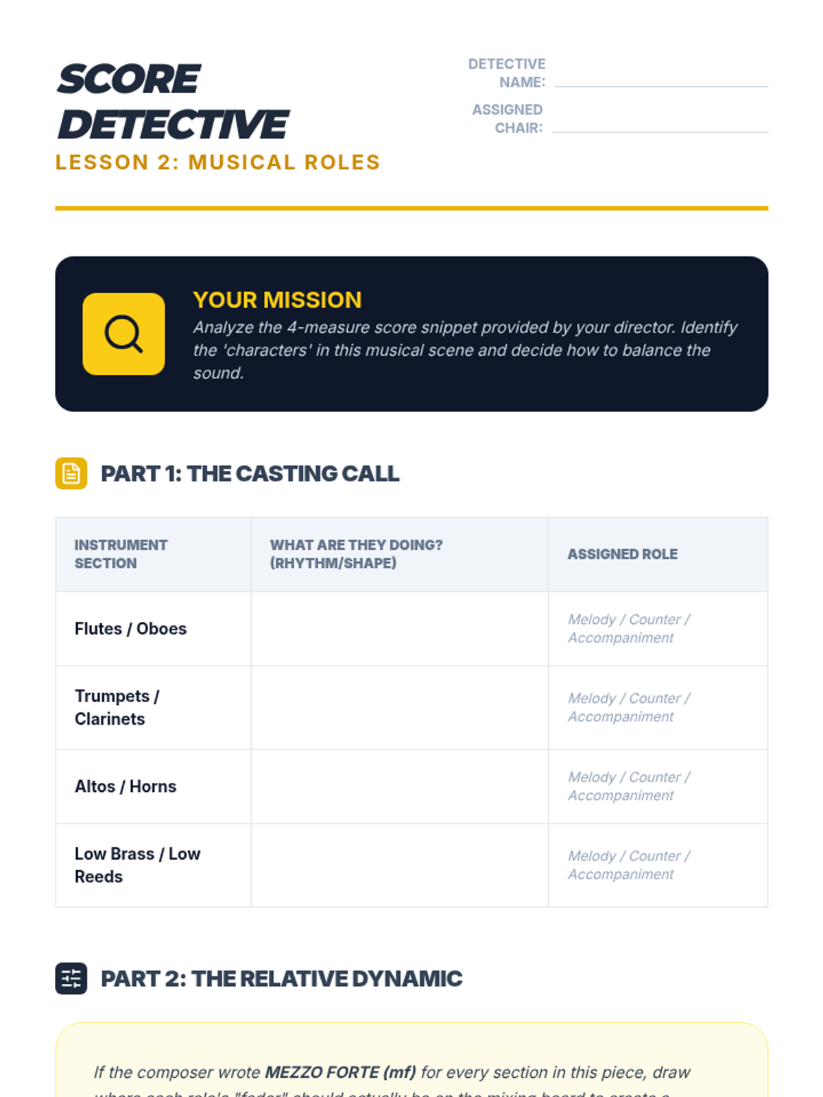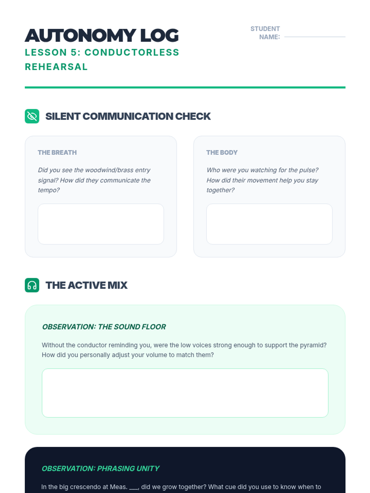 A comprehensive unit for middle school band and orchestra students focusing on ensemble hierarchy, the 'Pyramid of Sound,' role identification, and collective musicality. Students move from basic balance concepts to advanced conductorless rehearsal techniques.