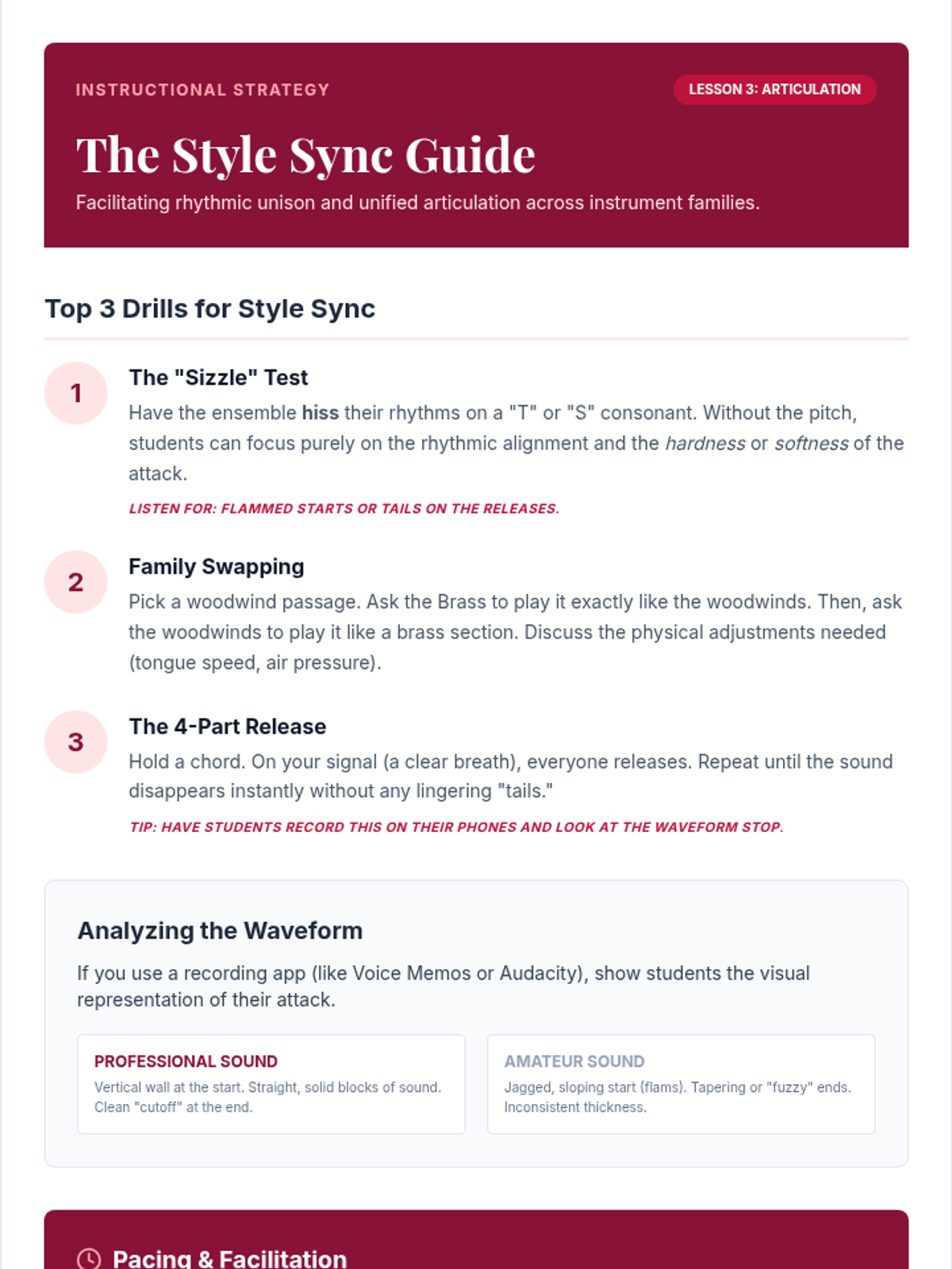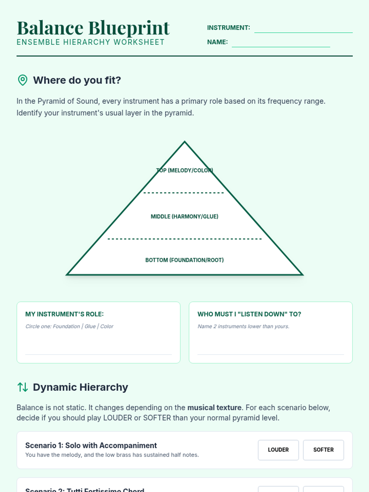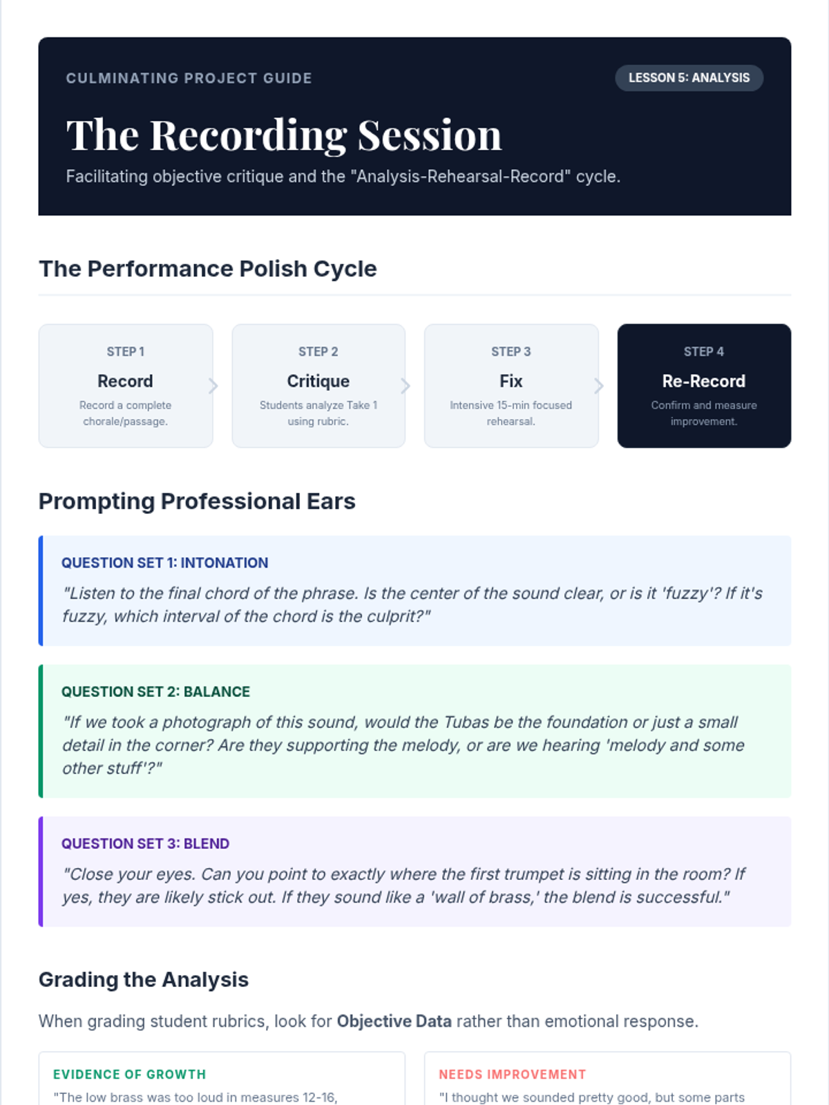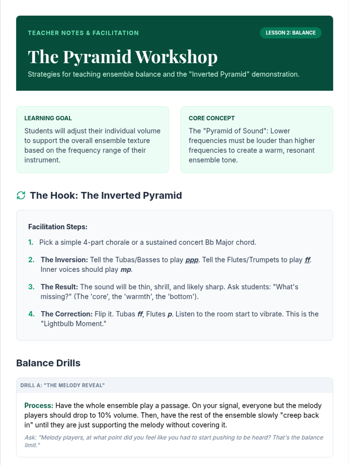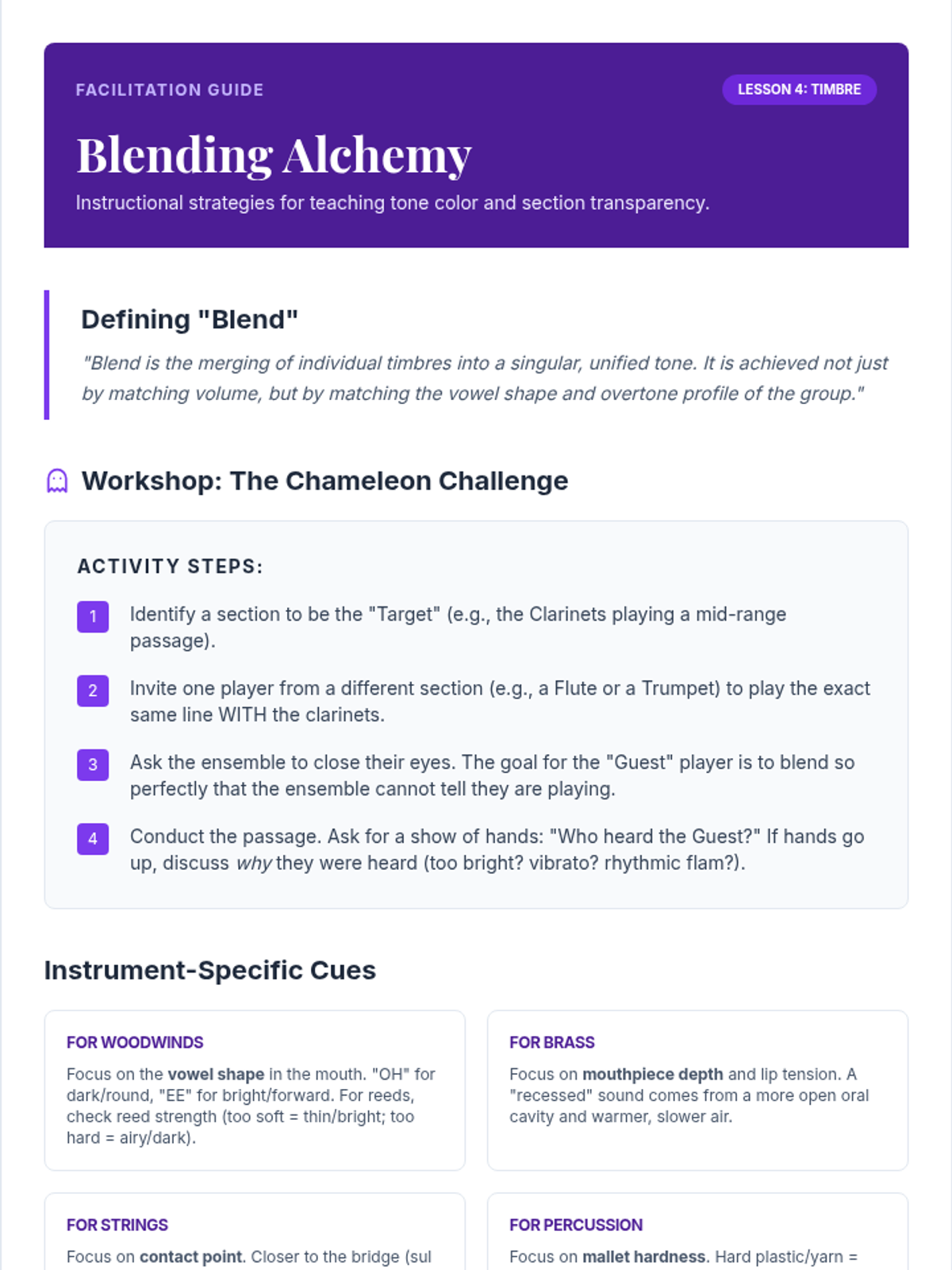This sequence guides high school instrumentalists from individual technical proficiency to collective ensemble mastery. Students explore the scientific and artistic principles of intonation, balance, and blend to develop a professional unified sound.