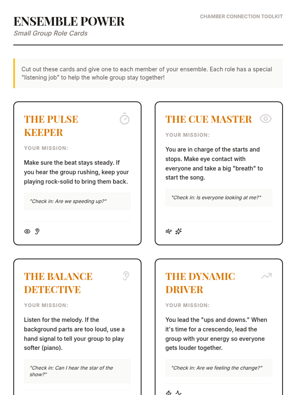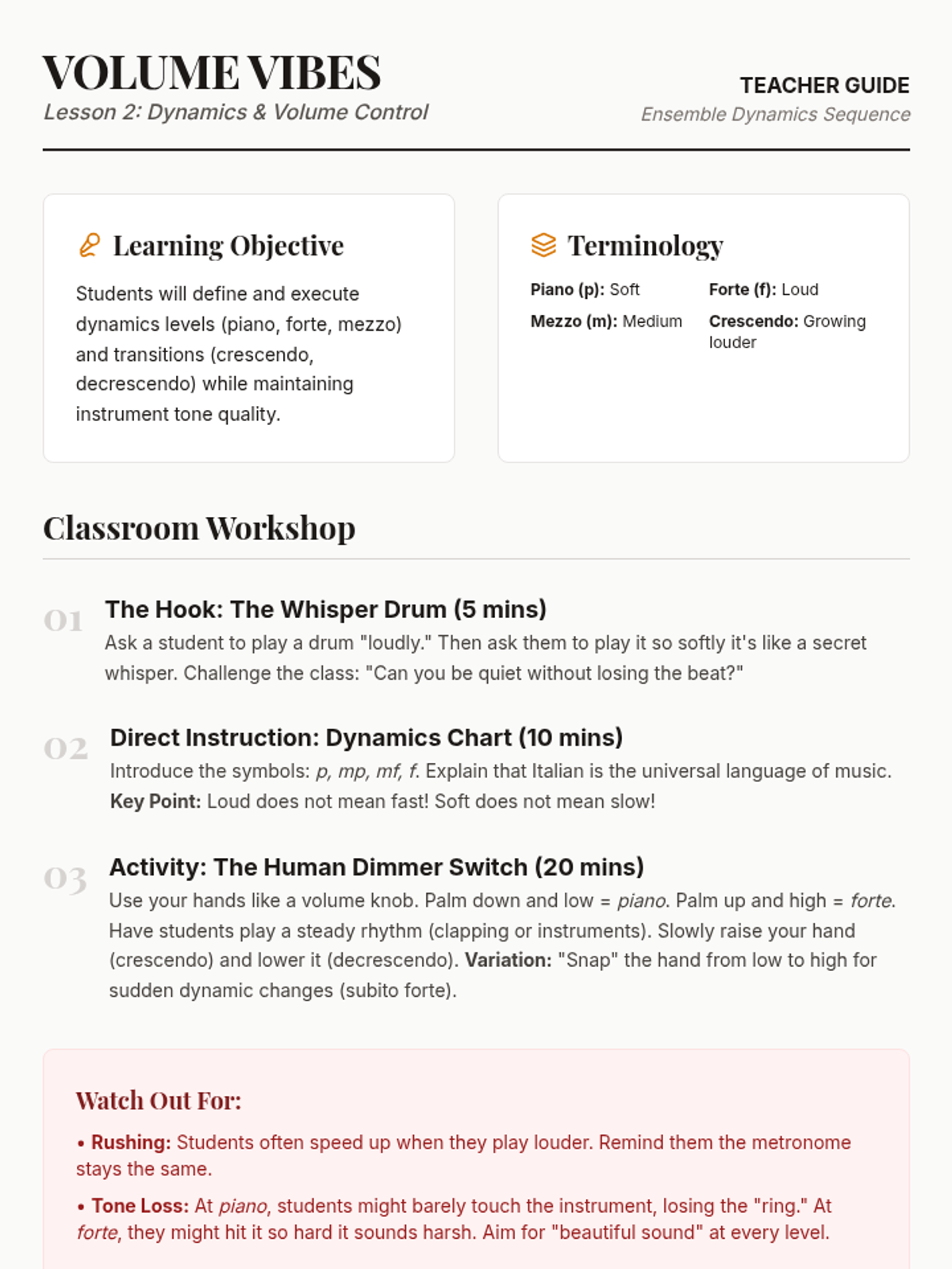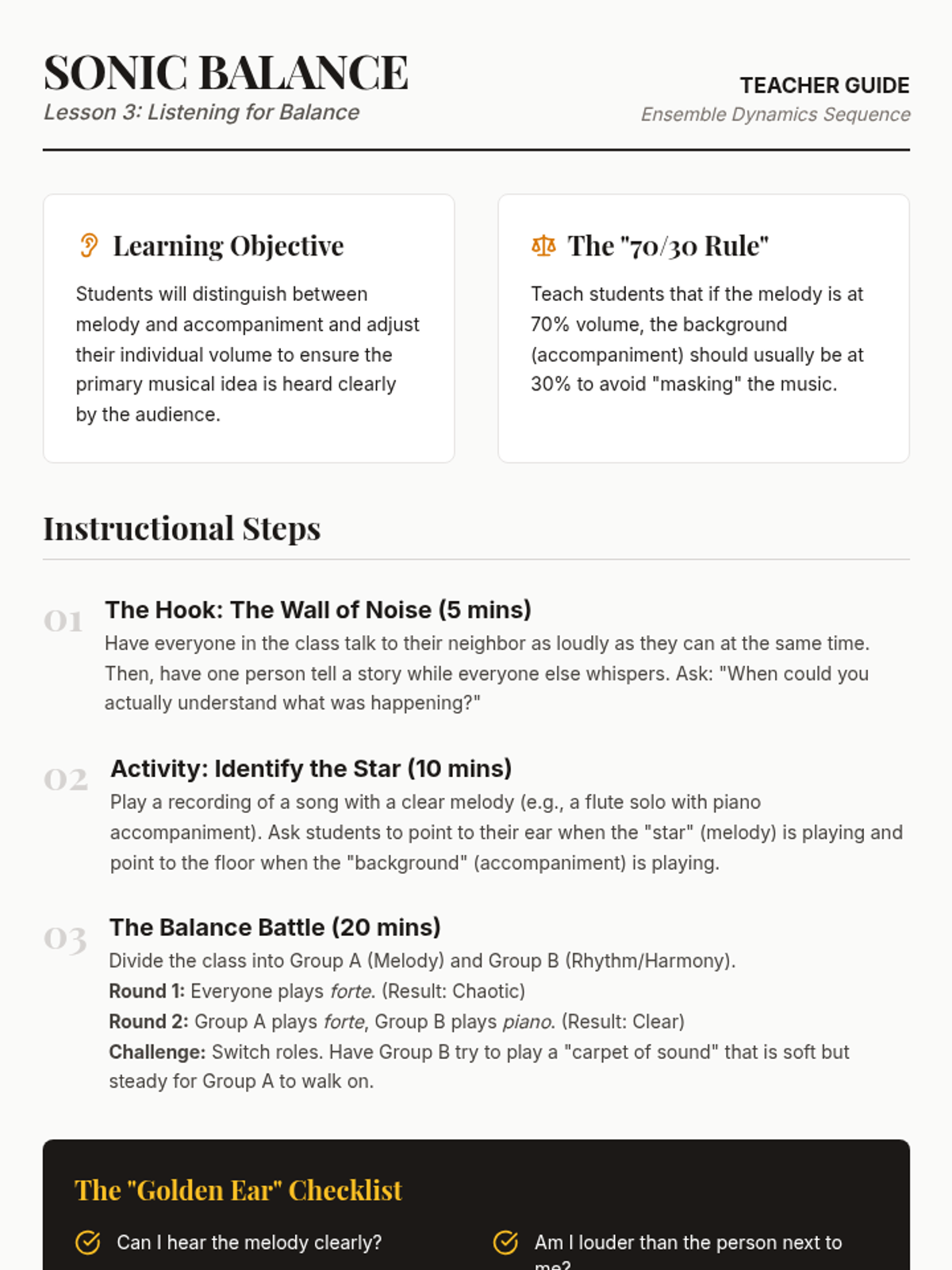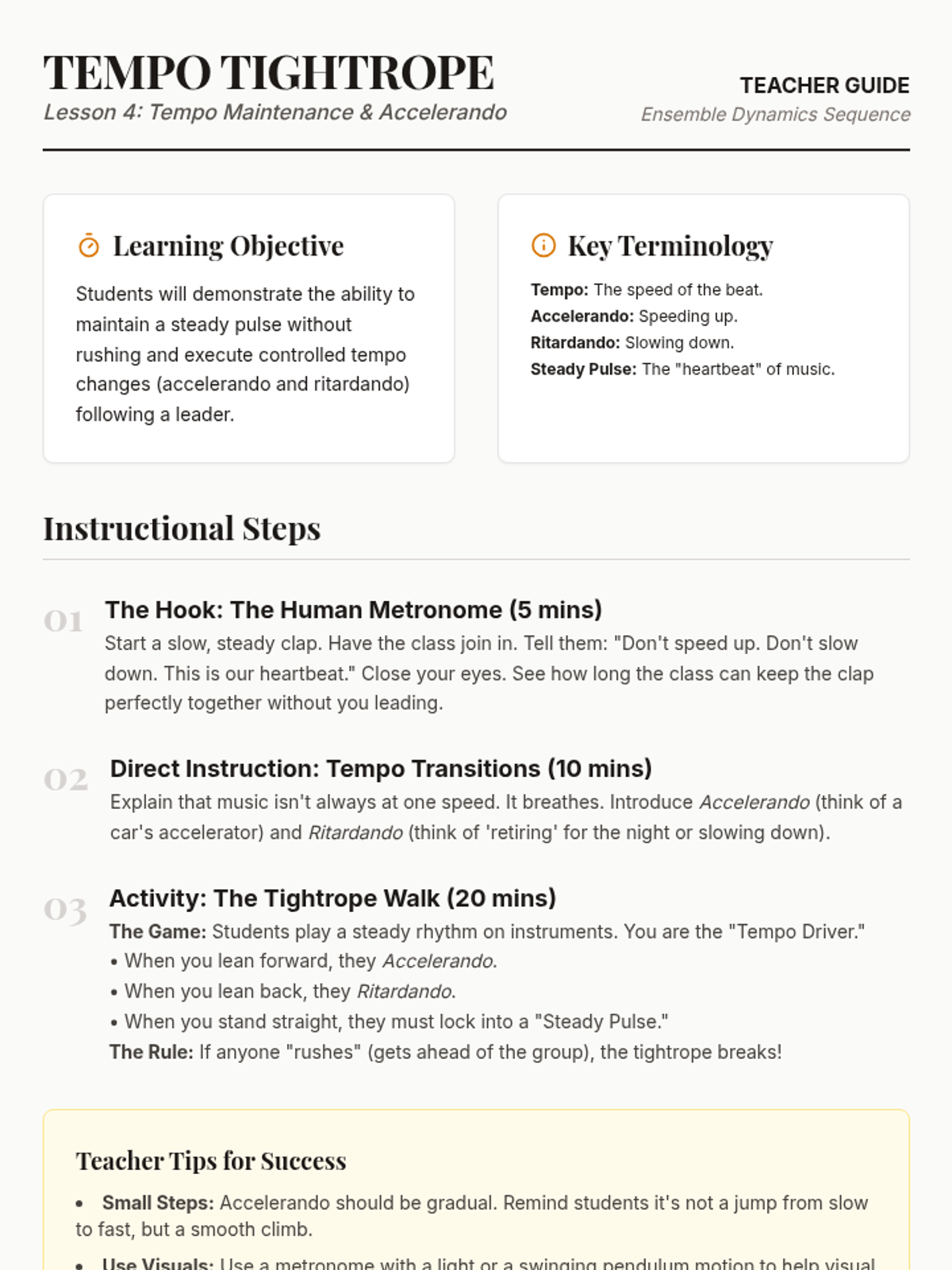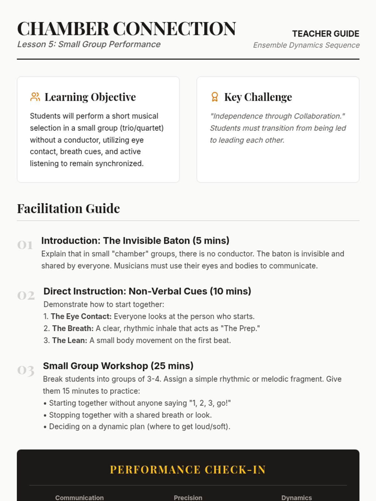 This sequence explores how musicians work together as an ensemble, focusing on conducting cues, dynamic control, balance, and tempo maintenance. Students transition from following a leader to collaborating in small independent groups.