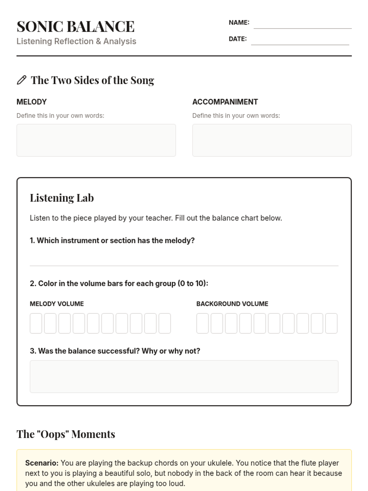 A comprehensive introduction to the four families of the orchestra for 2nd graders. Students explore timbre, mechanics, and historical roles of strings, woodwinds, brass, and percussion, culminating in a conductor simulation.