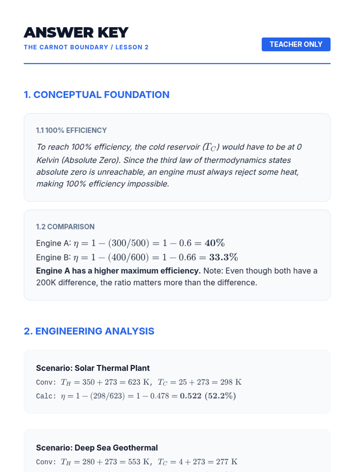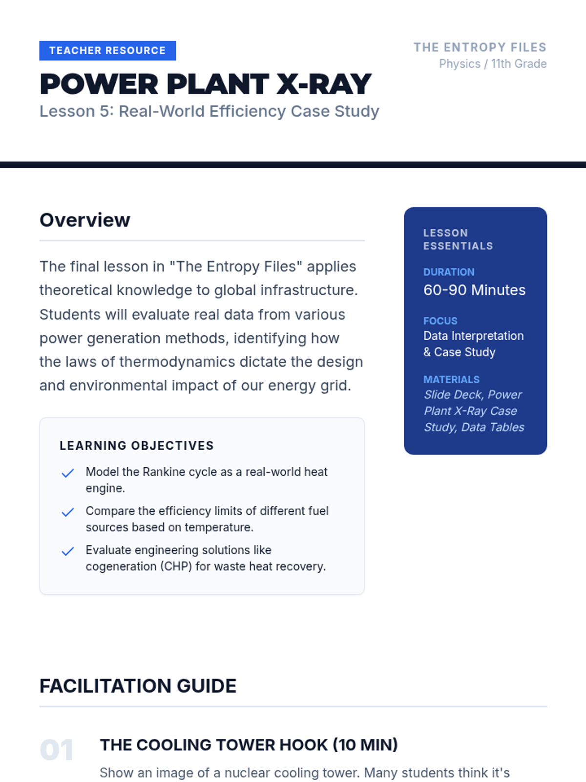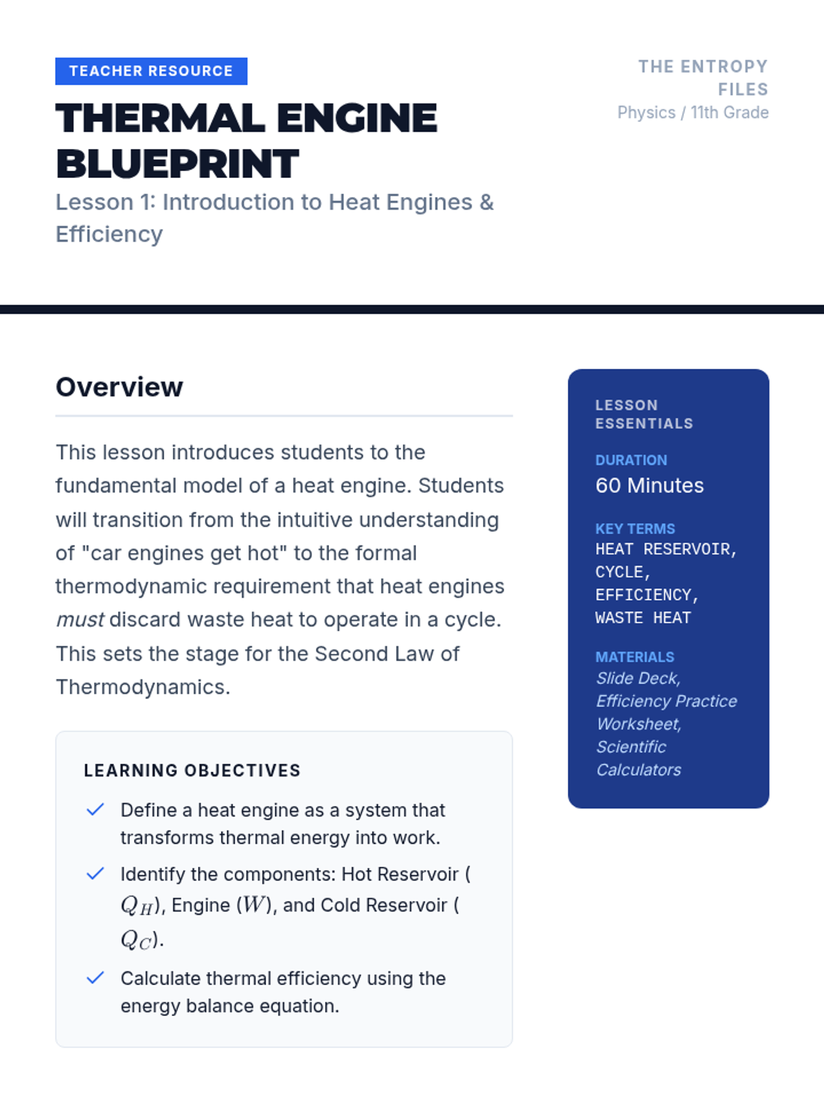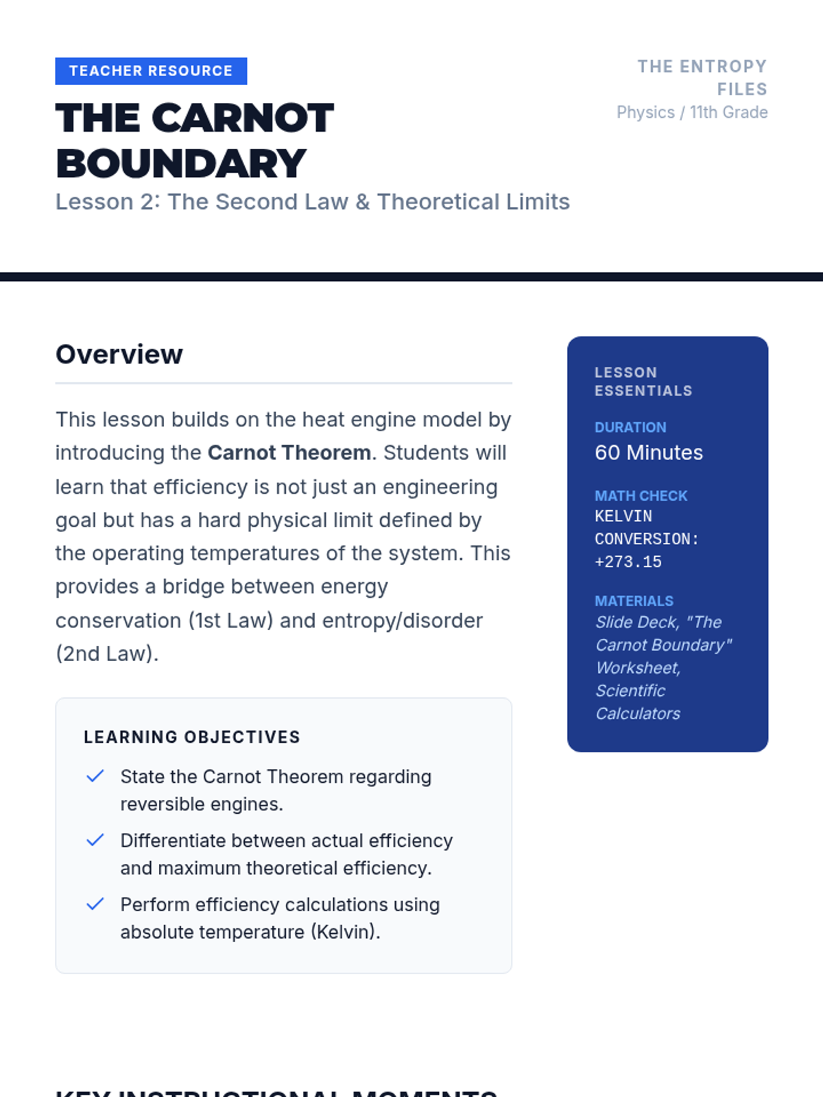 This sequence bridges physics and engineering by exploring the Second Law of Thermodynamics, entropy, and heat engine efficiency. Students analyze why 100% efficiency is impossible, evaluate the theoretical limits of heat engines using the Carnot cycle, and conclude by evaluating energy generation methods.