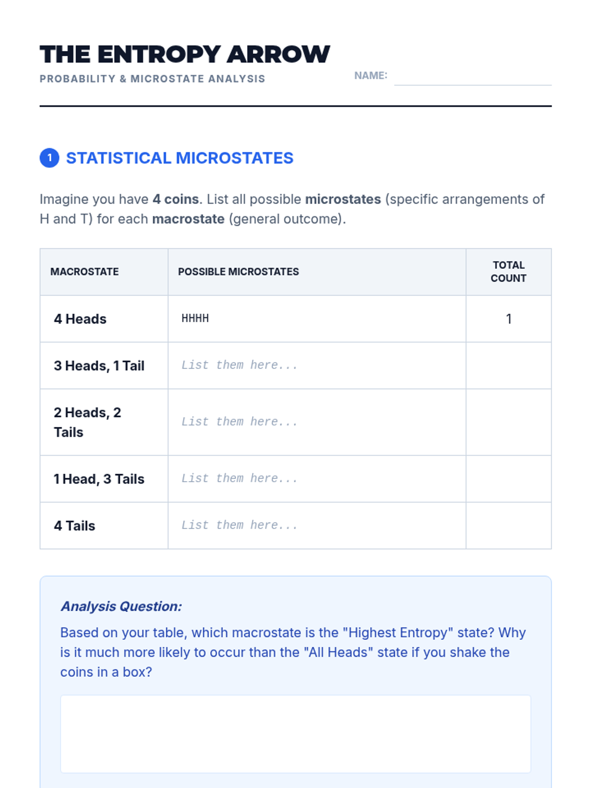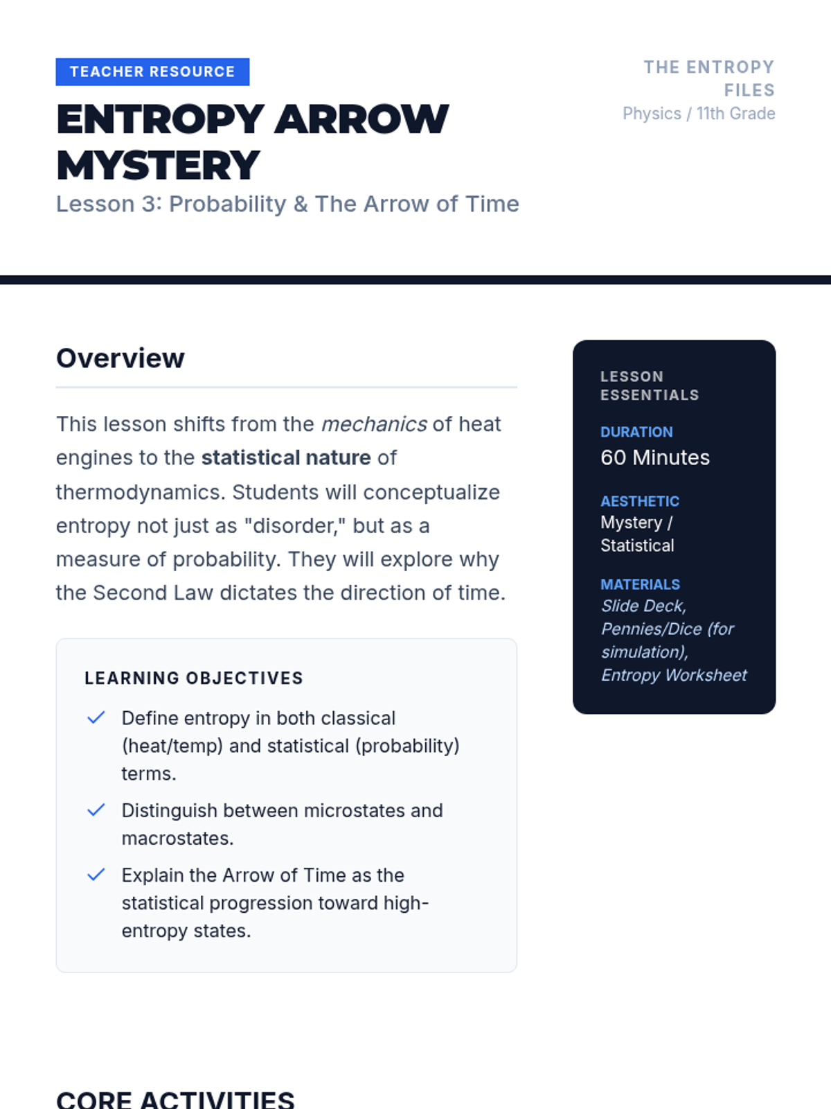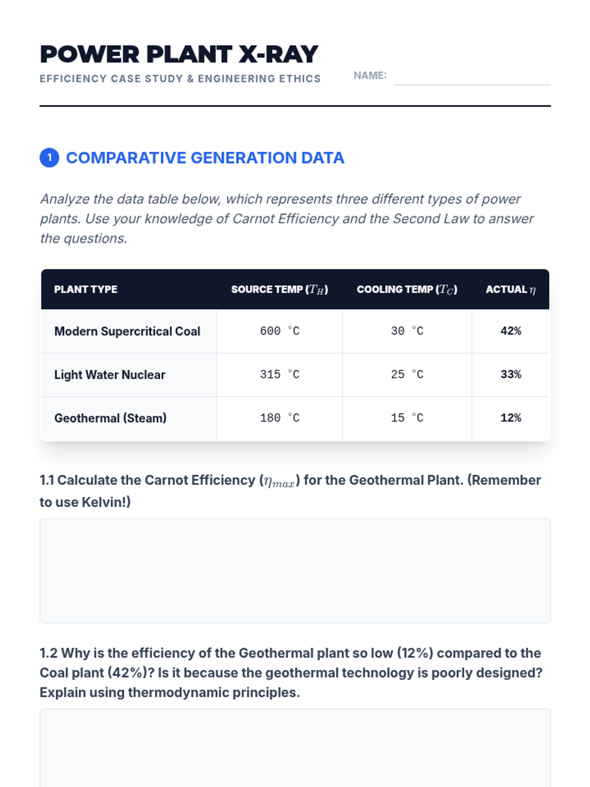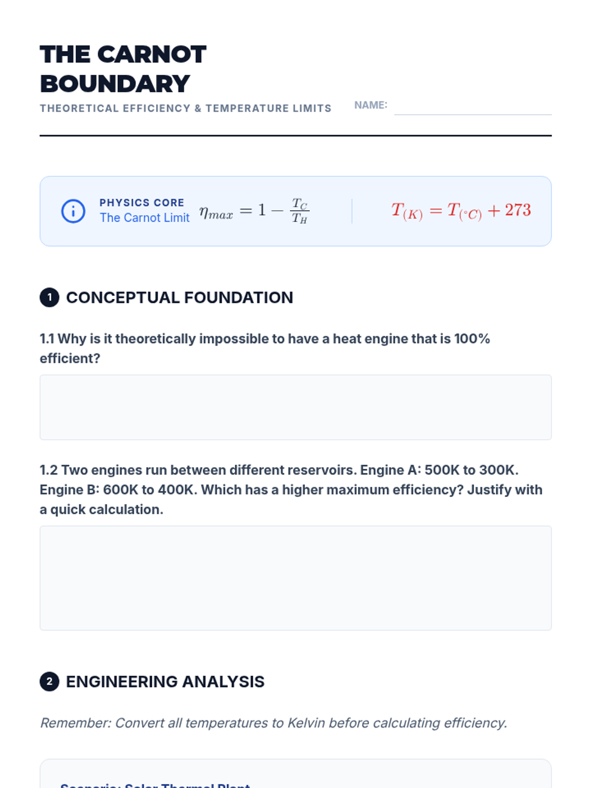 This sequence bridges physics and engineering by exploring the Second Law of Thermodynamics, entropy, and heat engine efficiency. Students analyze why 100% efficiency is impossible, evaluate the theoretical limits of heat engines using the Carnot cycle, and conclude by evaluating energy generation methods.