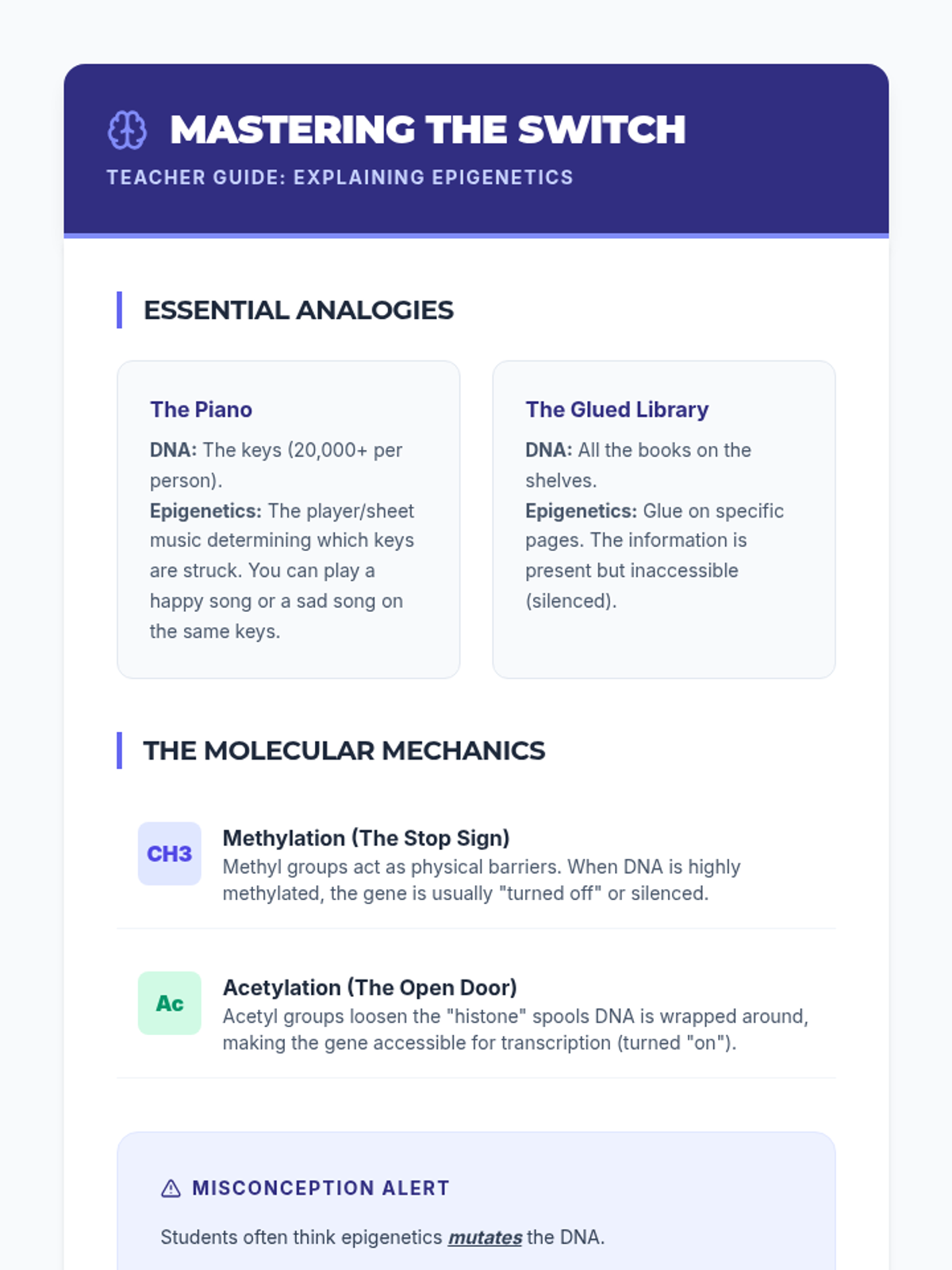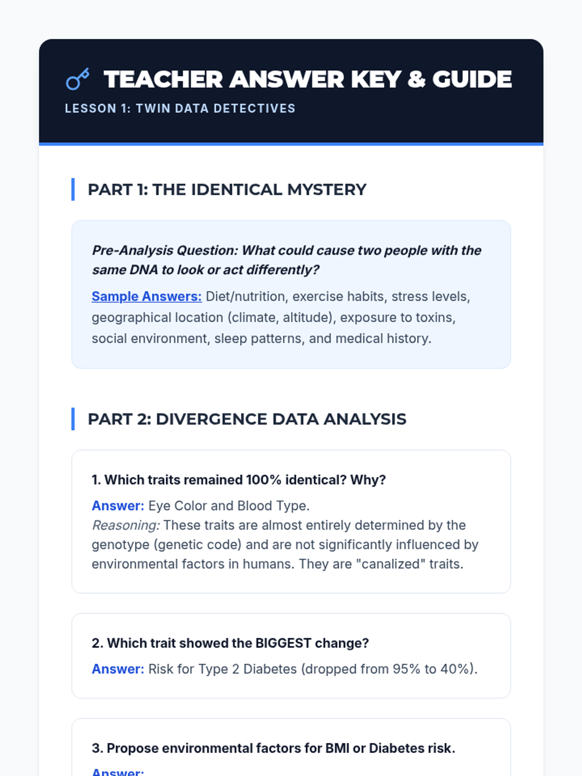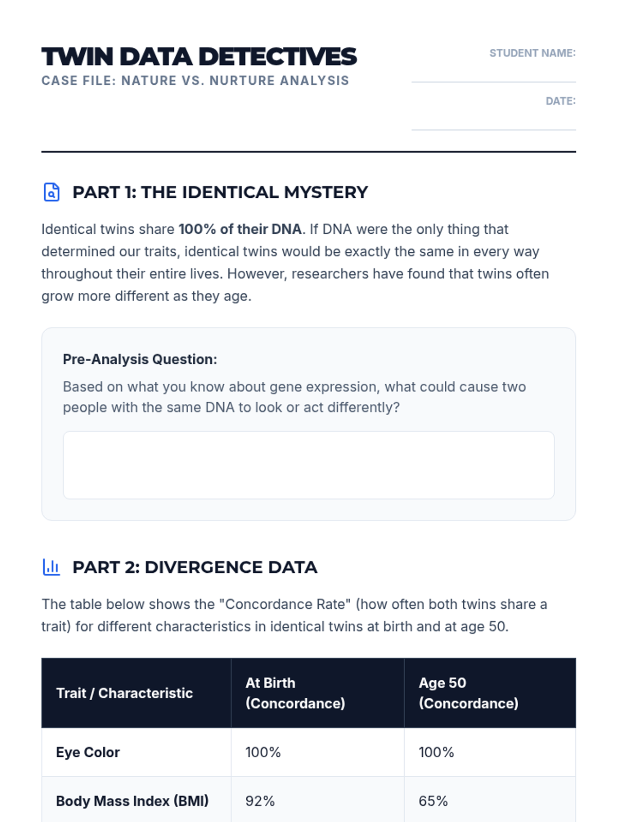 This 8th-grade life science sequence explores how environmental factors like temperature, diet, and stress influence gene expression. Students investigate twin studies, plant phenotypic plasticity, and epigenetic mechanisms to understand that a phenotype is the result of dynamic interactions between the genome and the environment.