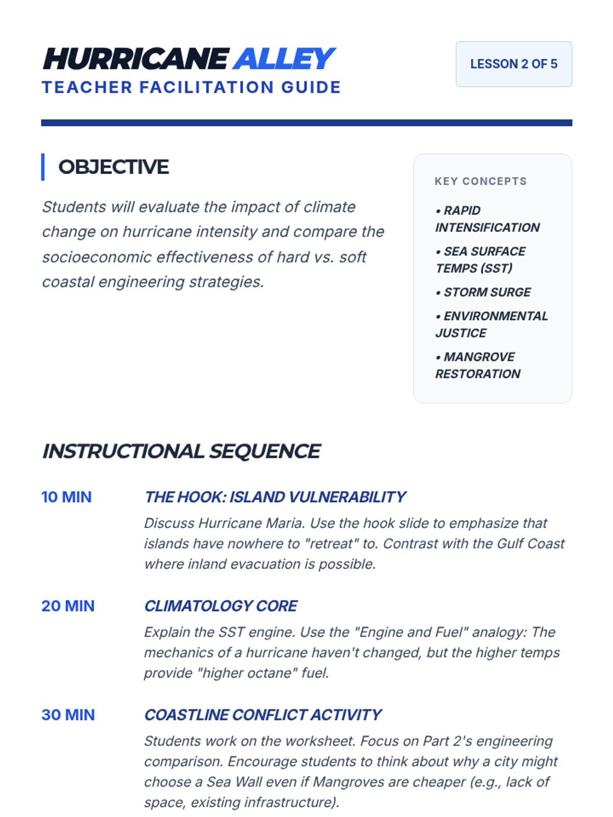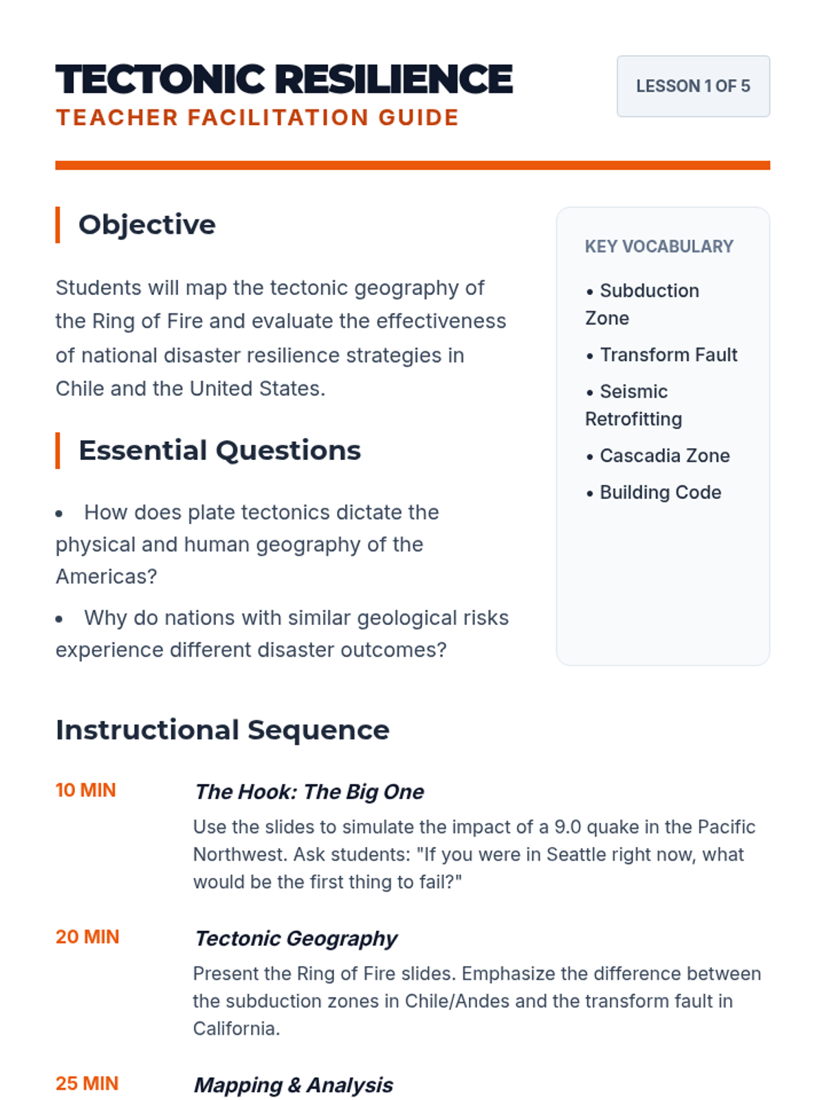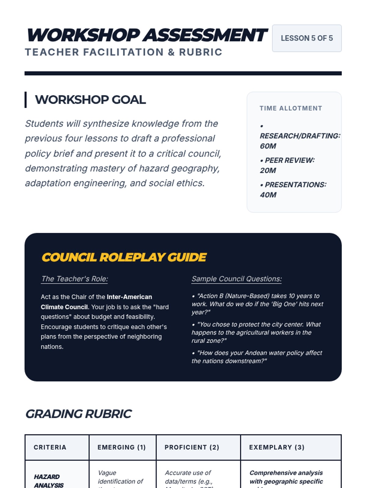 This 11th-grade geography sequence explores the intersection of climate change, natural disasters, and human adaptation across the Americas. Students analyze tectonic risks, hurricane patterns, glacial retreat in the Andes, and Indigenous land stewardship to develop integrated climate resilience policies.