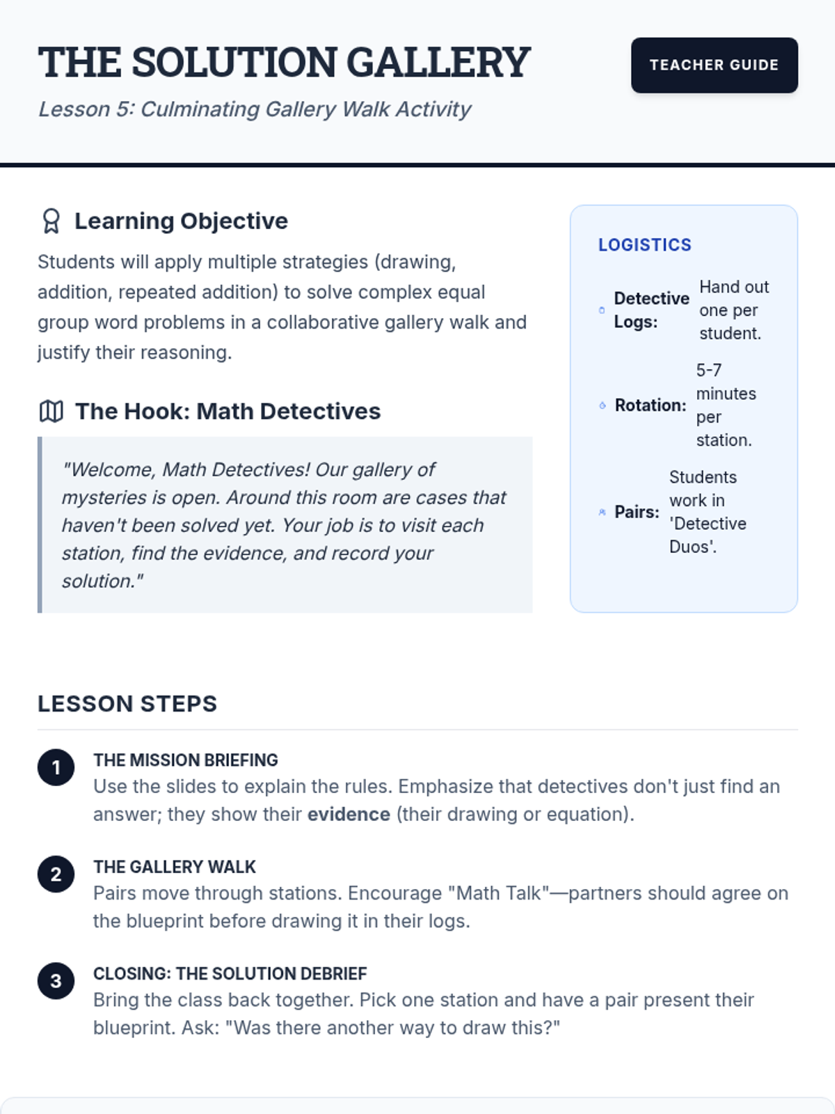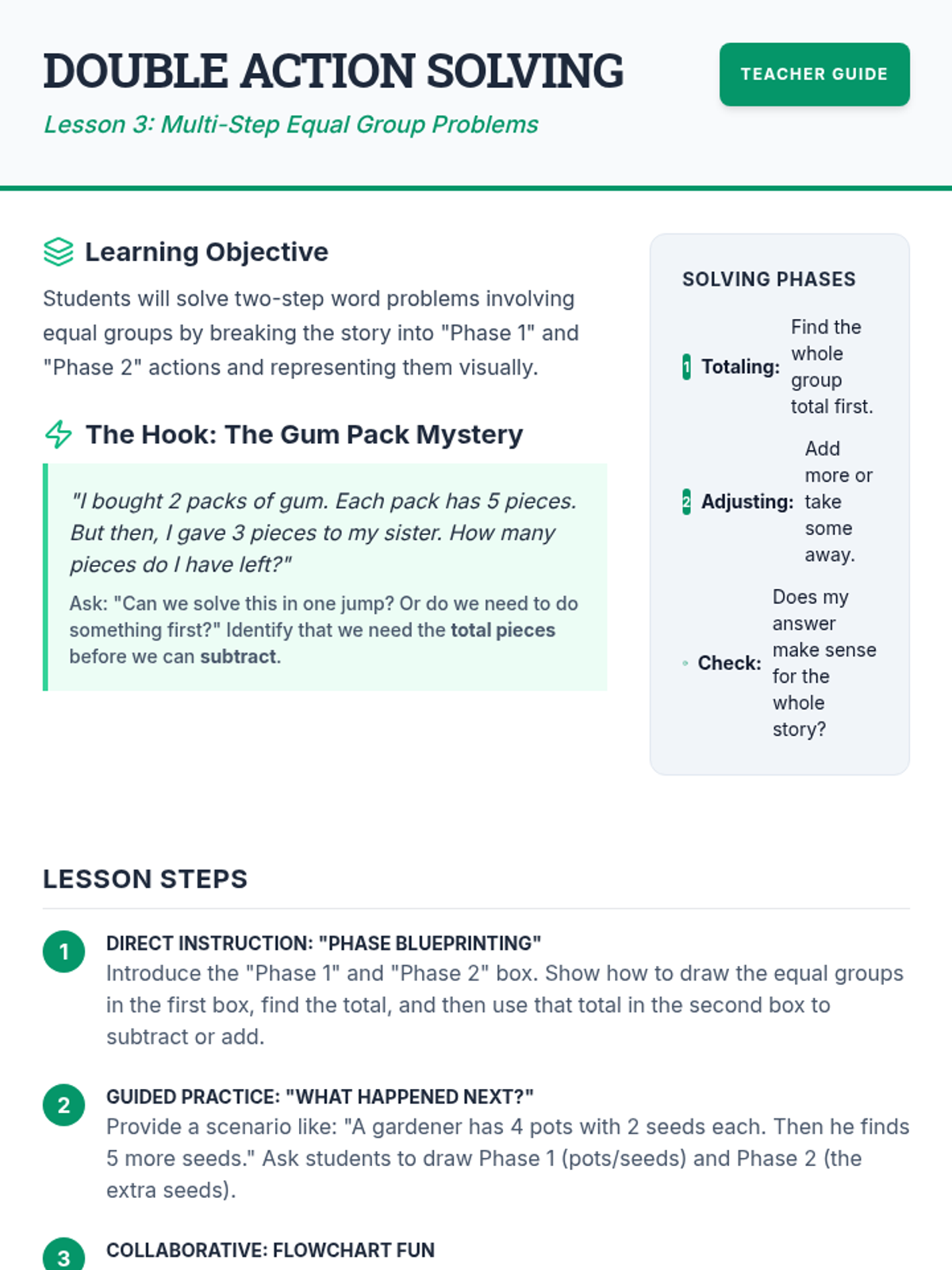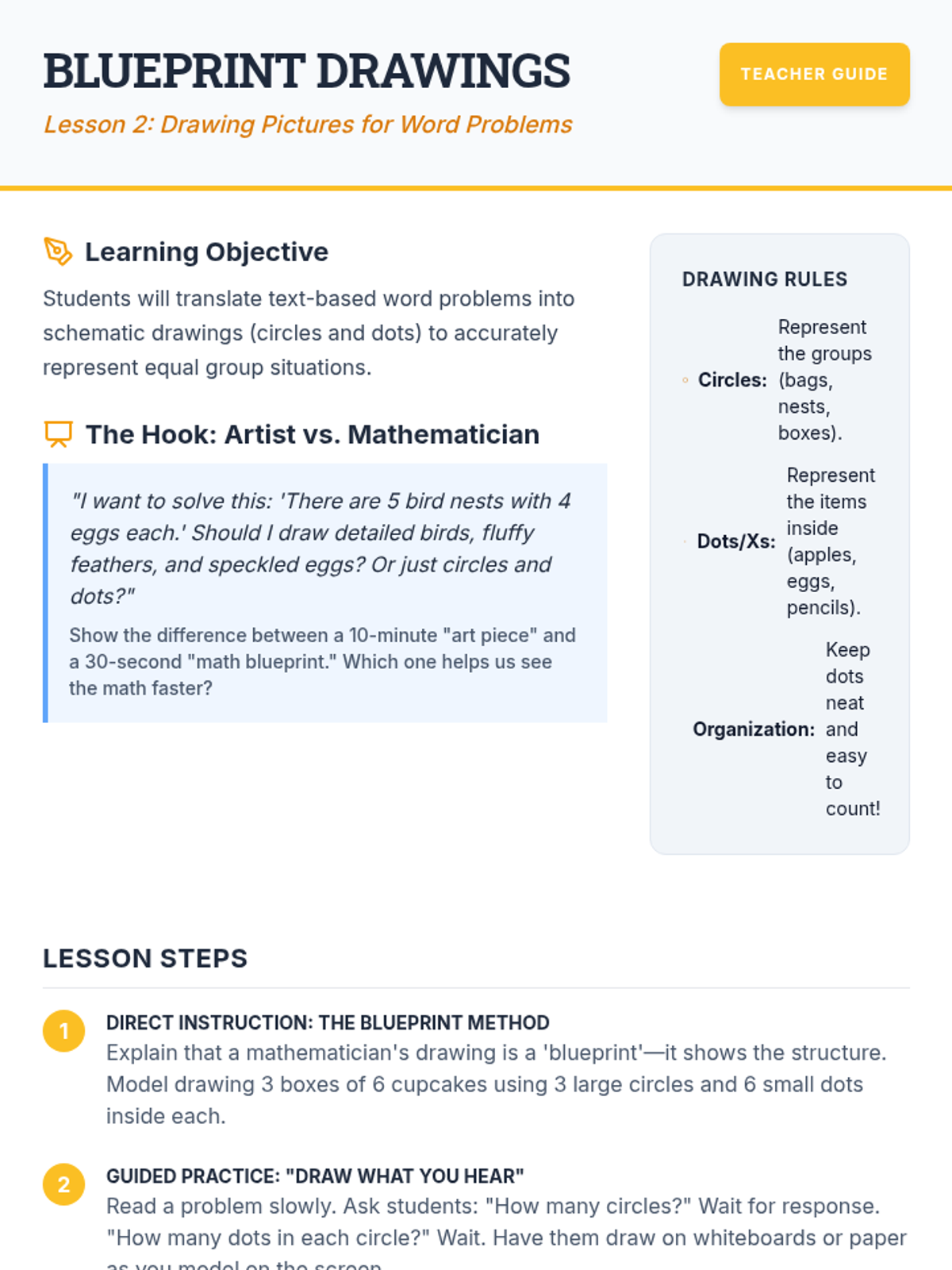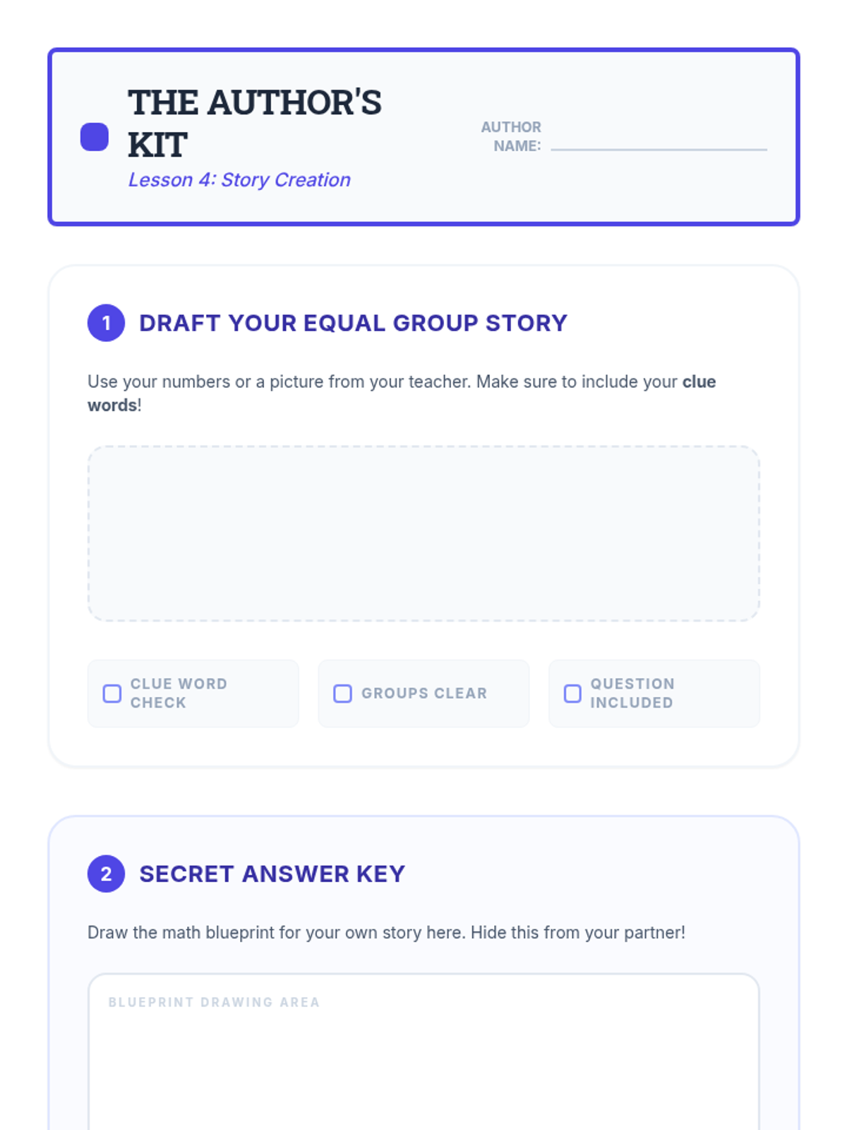 A 2nd-grade math sequence focused on deconstructing and solving word problems involving equal groups. Students learn to identify key vocabulary, represent stories with schematic drawings, solve multi-step problems, and author their own mathematical narratives.
