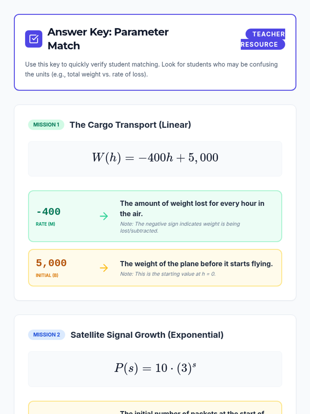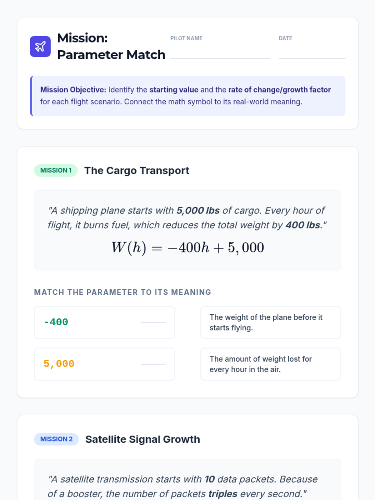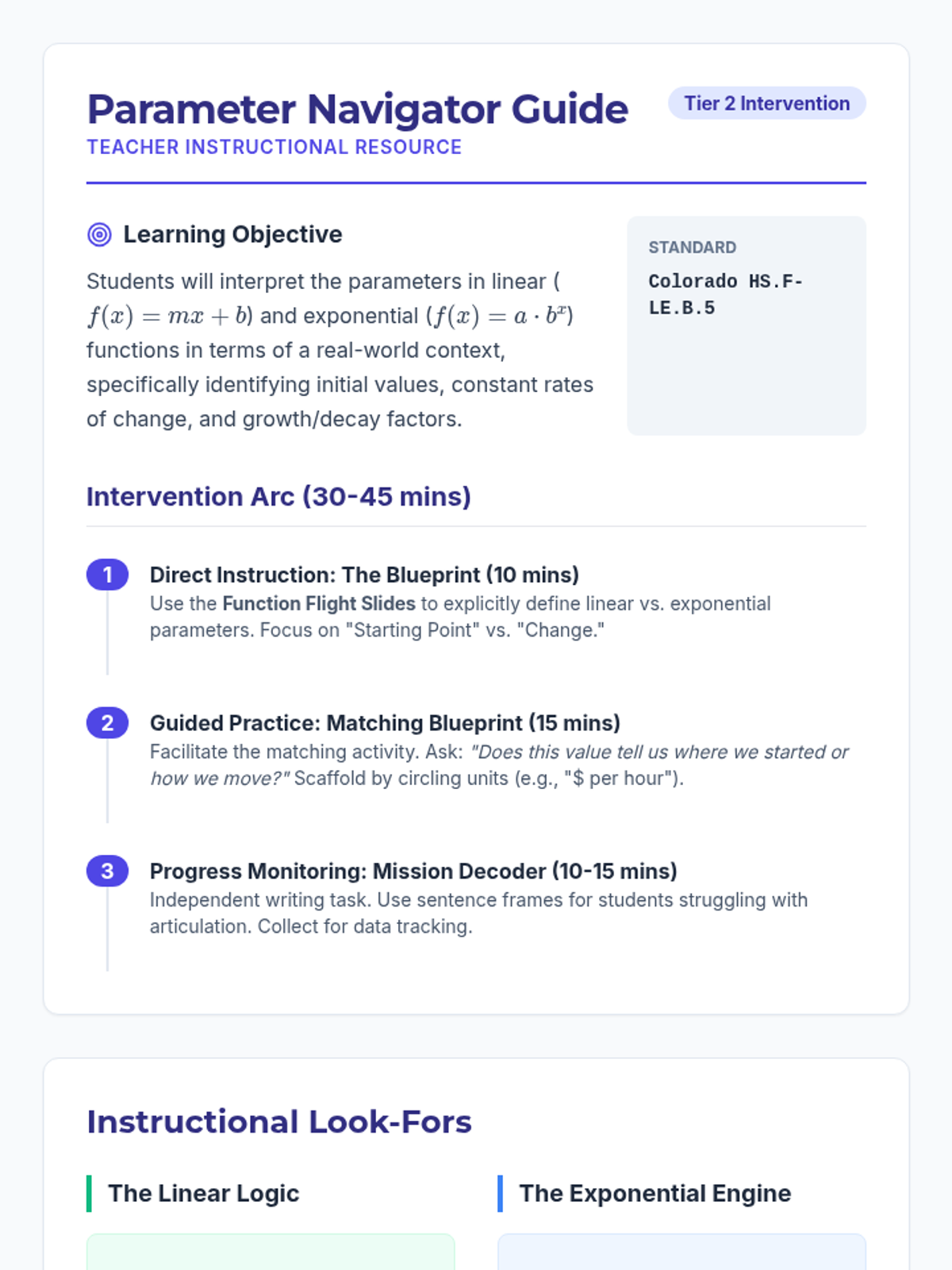 A targeted Tier 2 intervention sequence focused on interpreting linear and exponential parameters in contextual problems, aligned with Colorado standard HS.F-LE.B.5. Students learn to decode slope, initial value, and growth factors using a navigation-inspired theme.