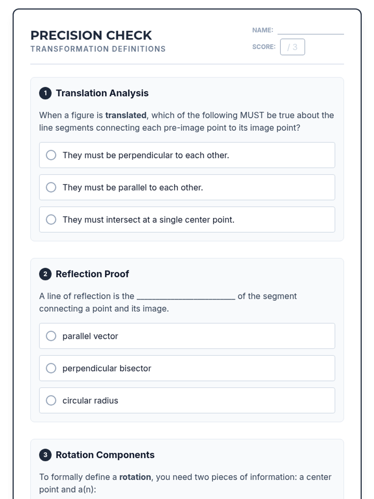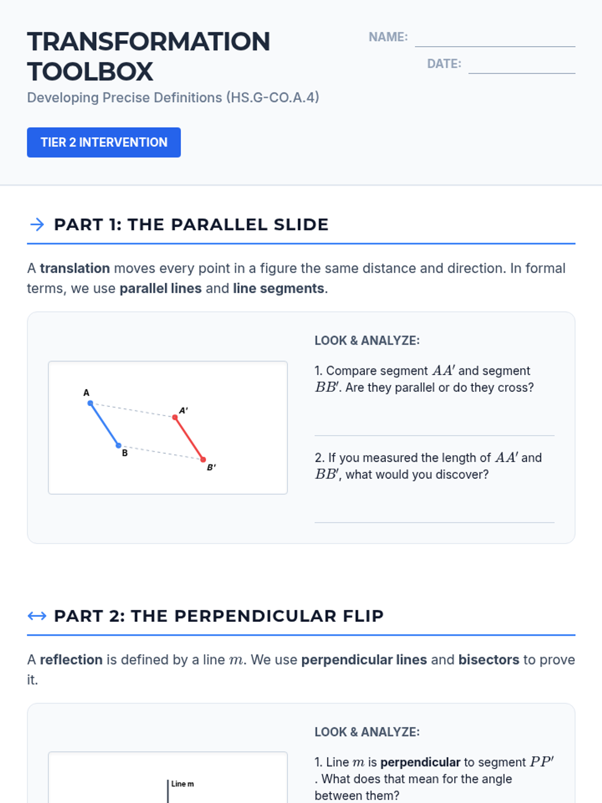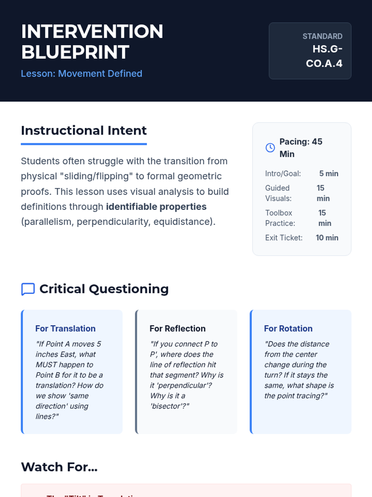 A targeted intervention sequence focused on formalizing geometric transformations using precise language and fundamental constructions. This sequence helps students move from intuitive 'sliding, flipping, turning' to formal mathematical definitions.