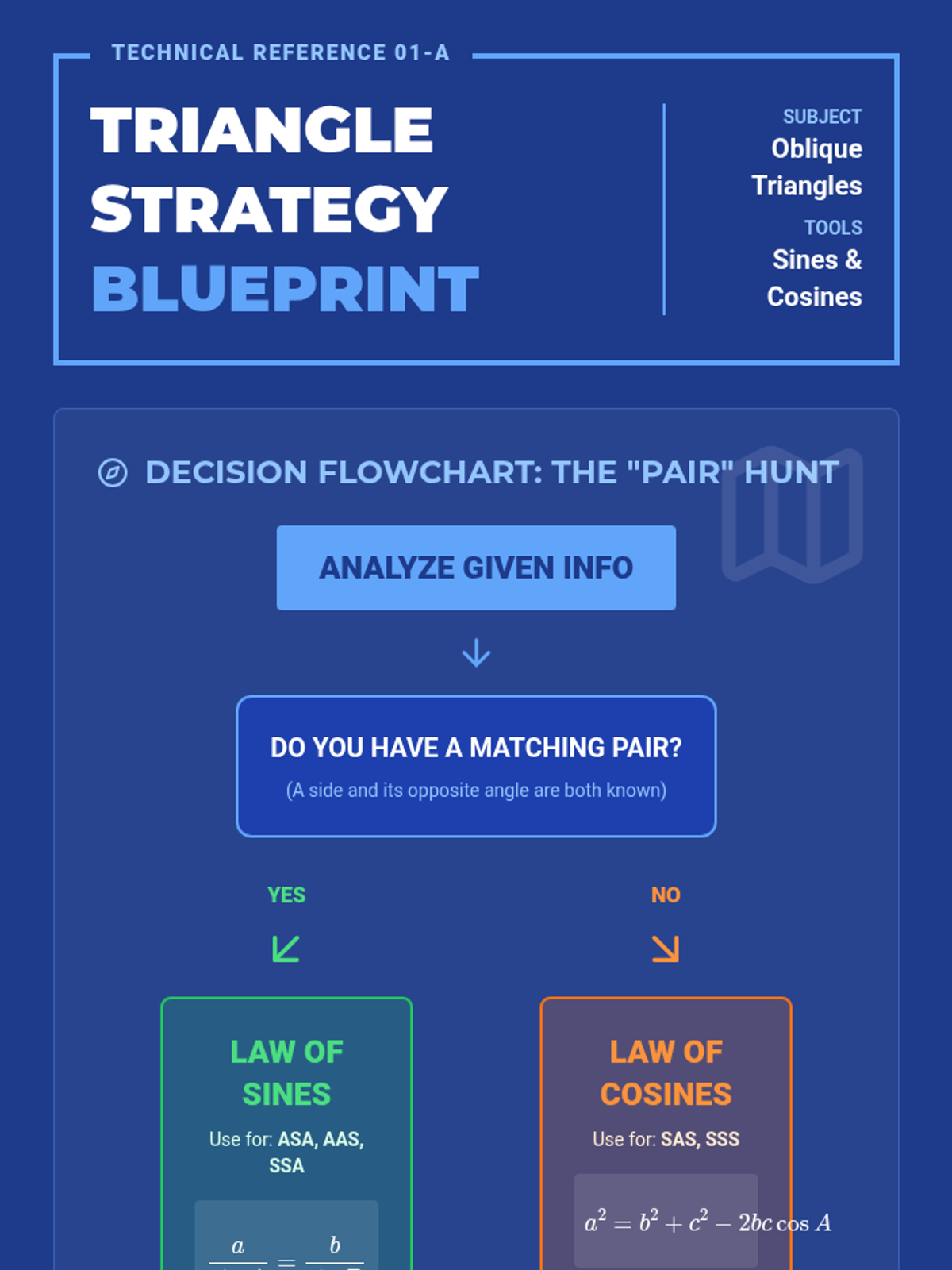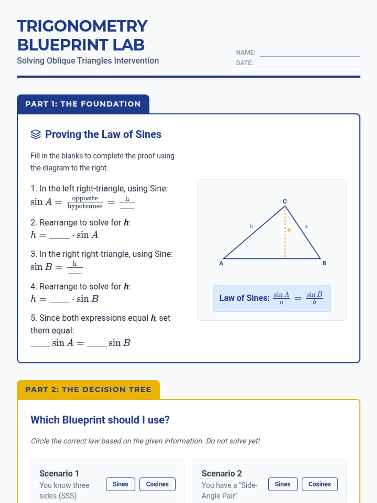 A targeted intervention sequence for High School Geometry students to master the Laws of Sines and Cosines through scaffolded proofs and practical application. The materials use a blueprint-inspired visual theme to emphasize the structural nature of trigonometry.